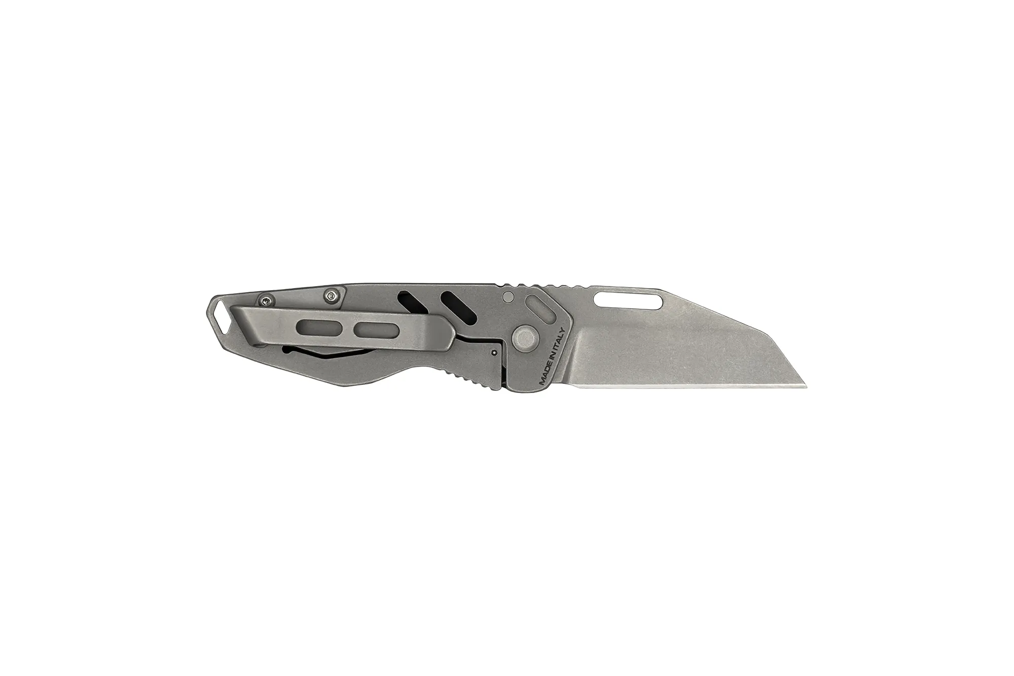 The handle consists of two different elements, the grip made of anodized anticorodal aluminum and the tempered steel frame that functions as a locking mechanism for the blade (Frame Lock System).
