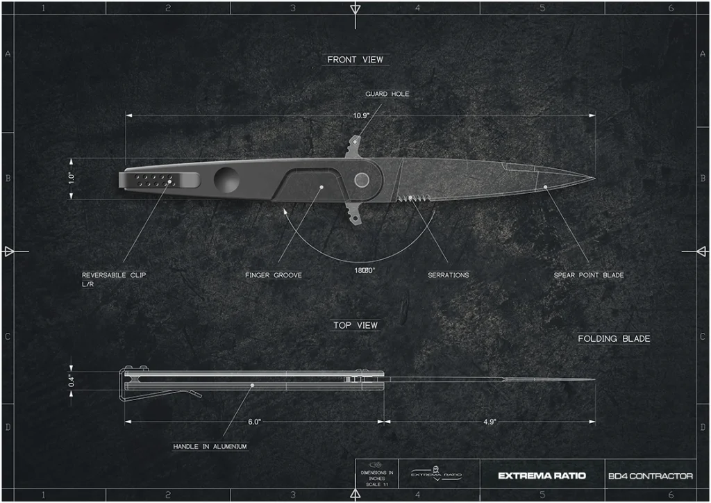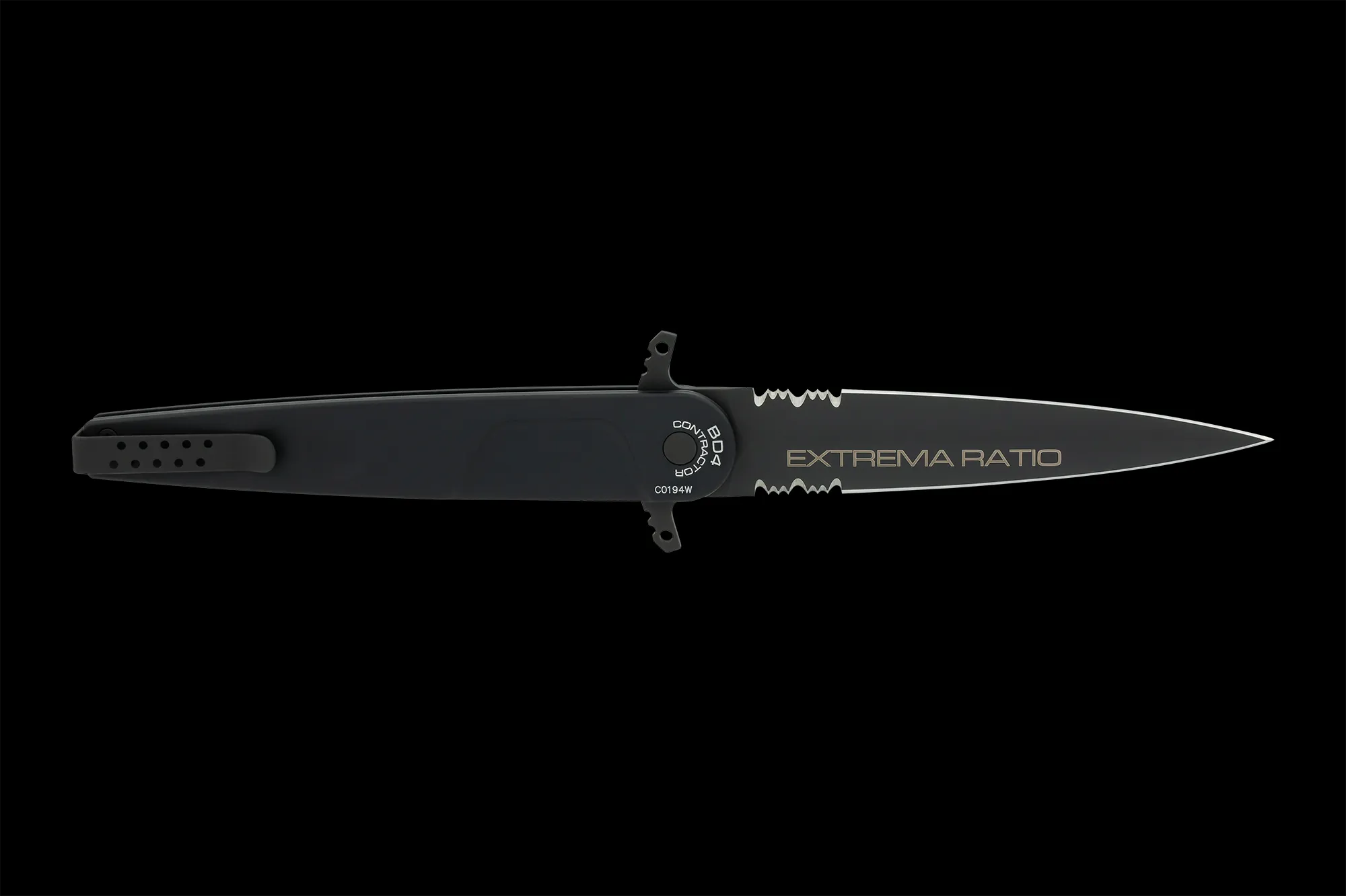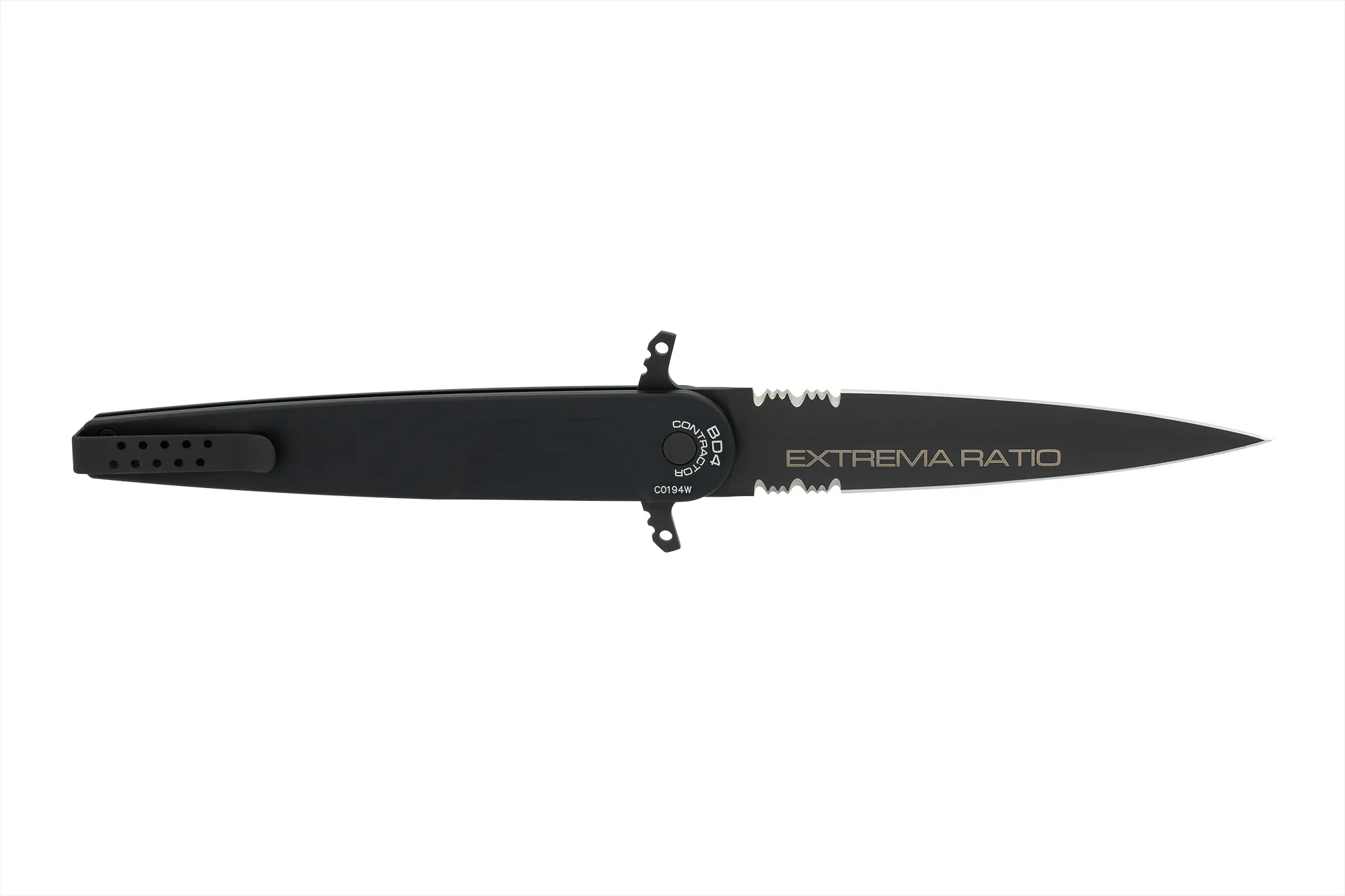 Both during development and in the subsequent decision to adopt it by the 17th Stormo Incursori, high priority was given to offensive capability, handling, and efficiency The BD4 Contractor is equipped with a double-edged blade featuring partial serration and a double guard. The clip, mounted on the anodized Anticorodal aluminum handle, allows the knife to be attached to military gear and to the specific sheaths issued to special forces. The blade shape is designed to ensure effective cutting and penetration. BD4 Contractor is available in 2 versions: