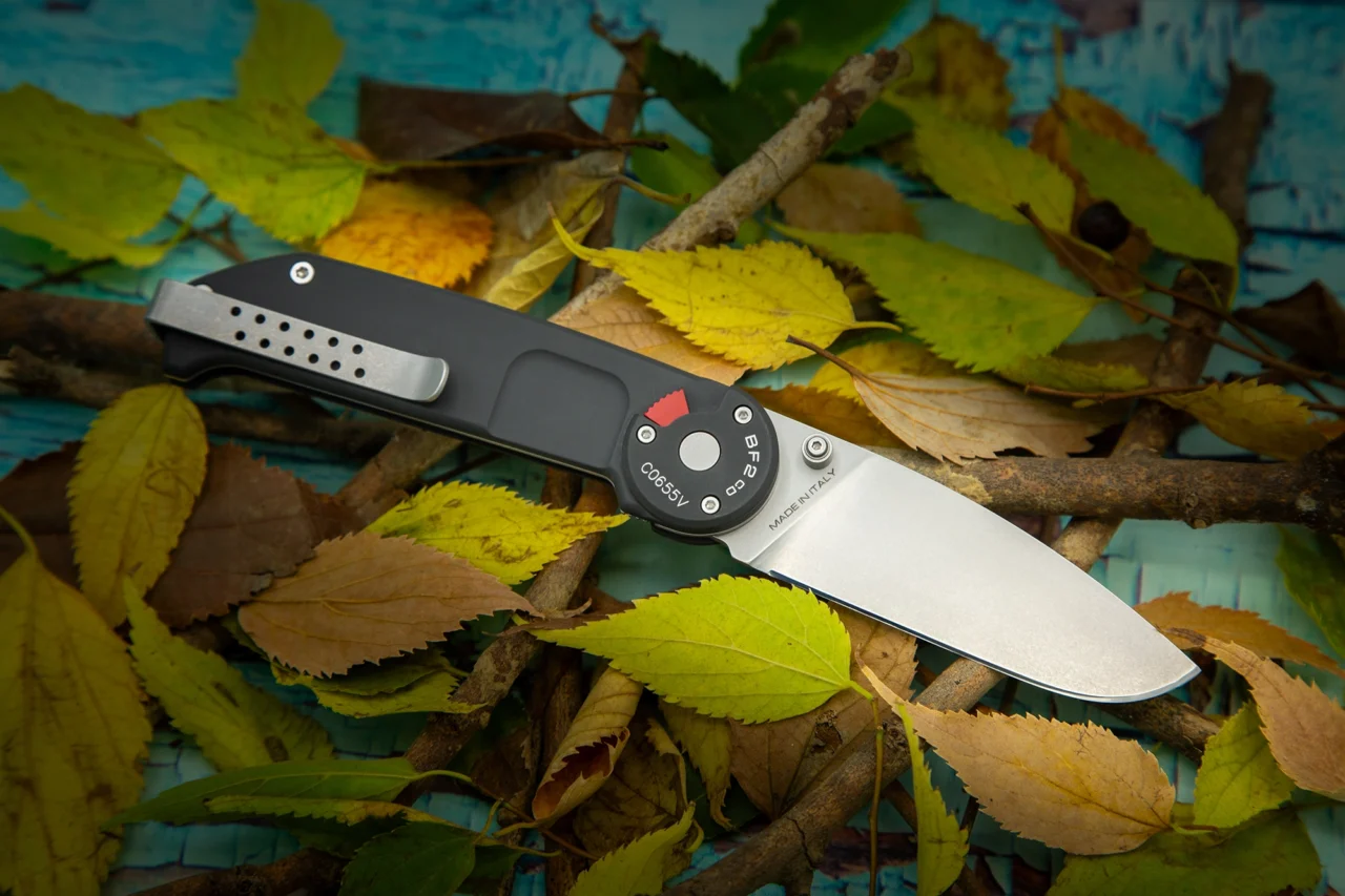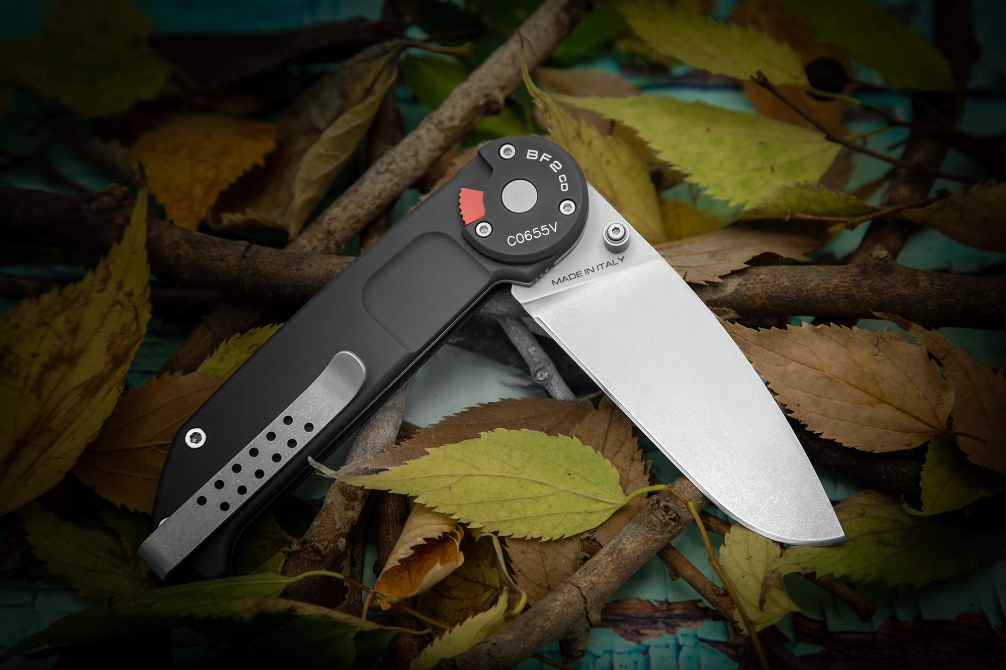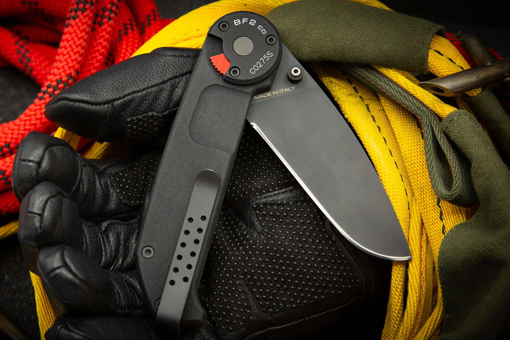 The handle is solid and comfortable, with the reversible clip becoming a useful and comfortable resting point for the thumb in a “reverse” grip. Characteristical lowered flat areas in the handle give access to the opening “pins”, which don’t protrude from the knife when closed. The flat-ground blade is available in a drop-point or a tanto shape, featuring an extra-thick and stout tip (as in model BF1). It is made of Böhler N690 steel (58 HRC), is known for its perfect balance between hardness, strength and resilience. The renowned LINER-LOCK blade-blocking system is paired with a carter-protected, manually-activated secondary blocking system. The BLACK RUVIDO (ROUGH) version is produced with a rough handle for a better grip.
