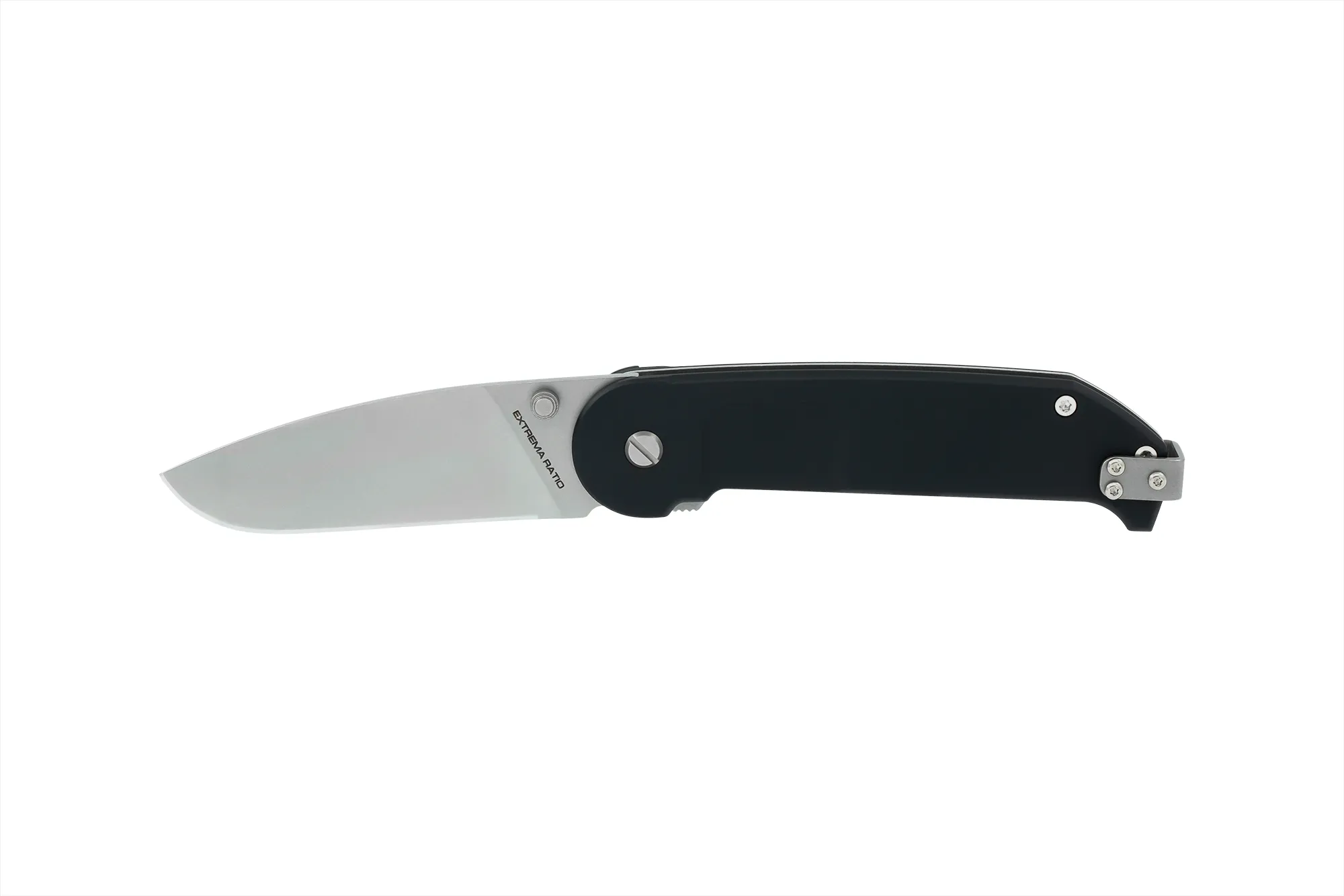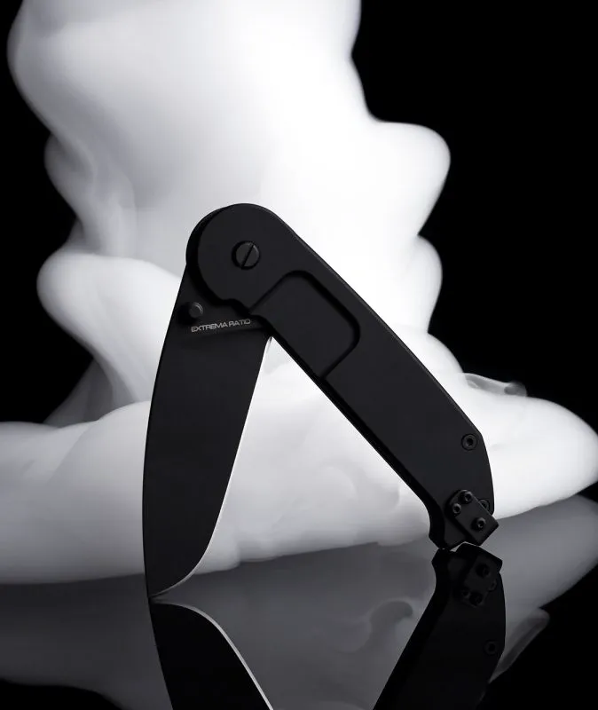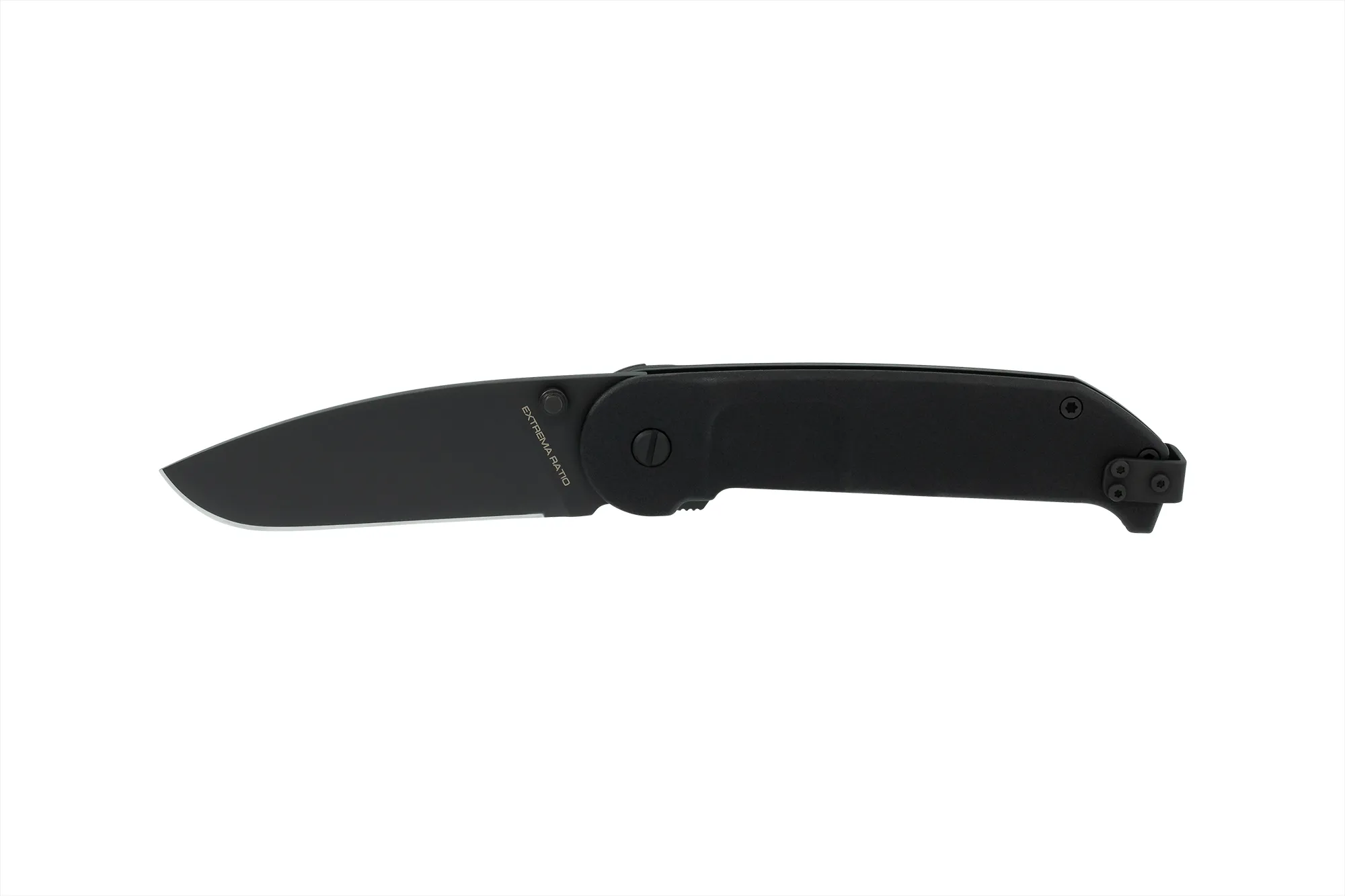 The handle is solid and comfortable, with the reversible clip becoming a useful and comfortable resting point for the thumb in a “reverse” grip. Characteristical lowered flat areas in the handle give access to the opening “pins”, which don’t protrude from the knife when closed. The flat-ground blade is available in a drop-point or a tanto shape, featuring an extra-thick and stout tip (as in model BF1). It is made of Böhler N690 steel (58 HRC), is known for its perfect balance between hardness, strength and resilience. The renowned LINER-LOCK blade-blocking system is paired with a carter-protected, manually-activated secondary blocking system. The BLACK RUVIDO (ROUGH) version is produced with a rough handle for a better grip.