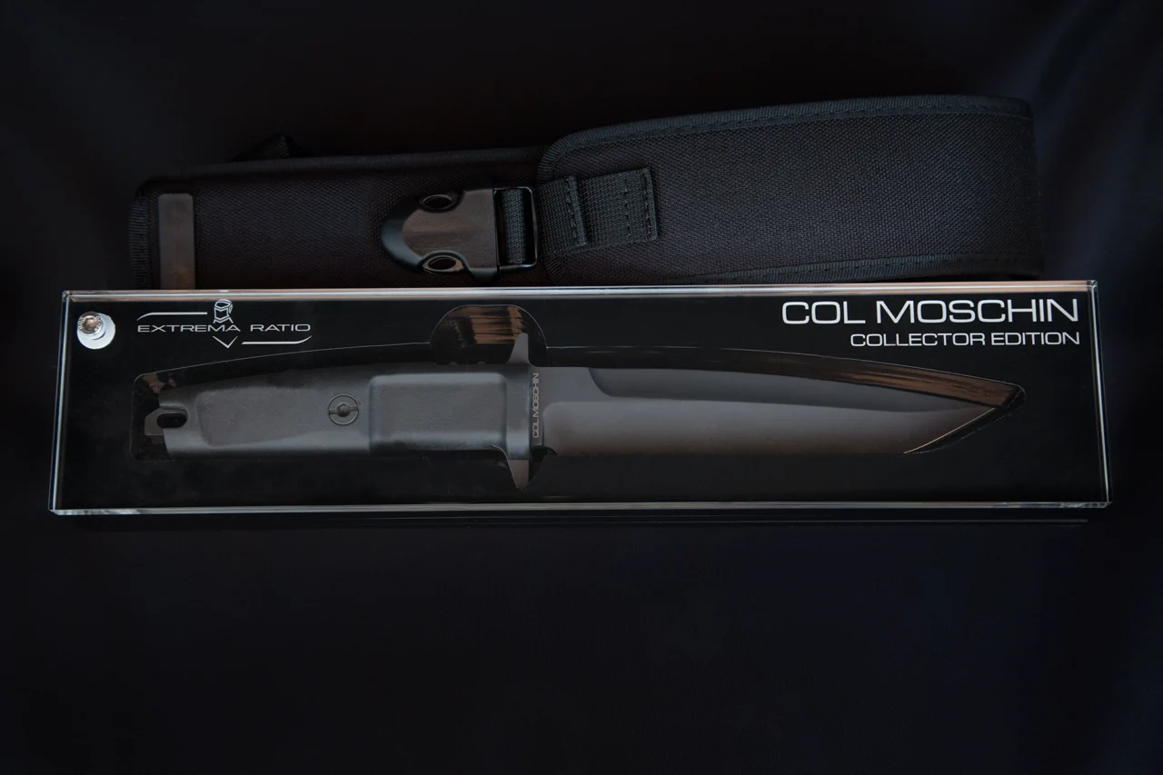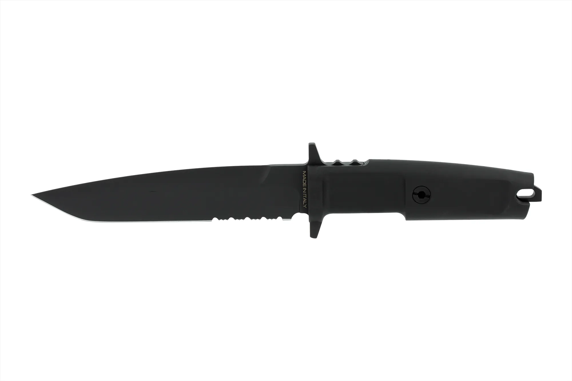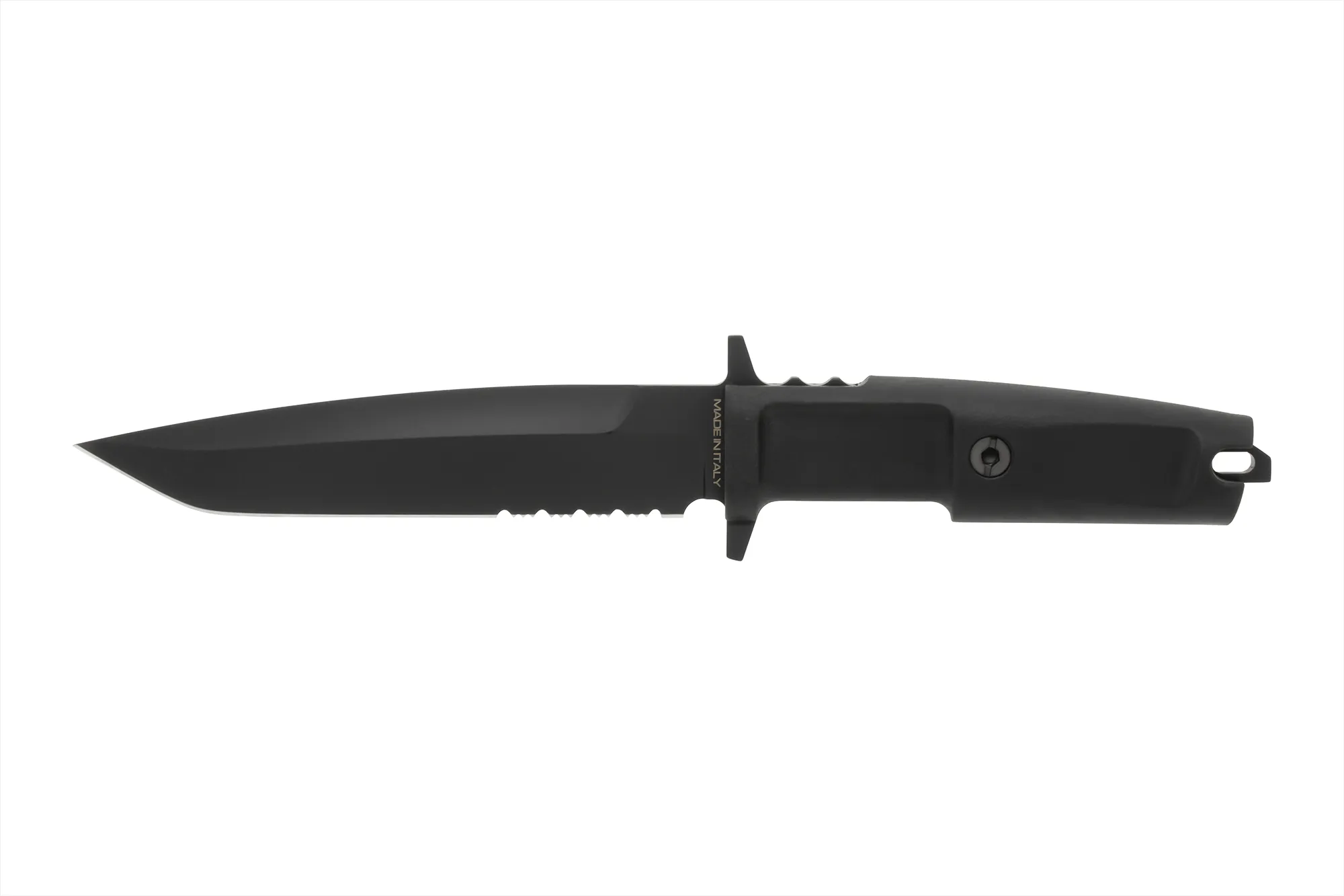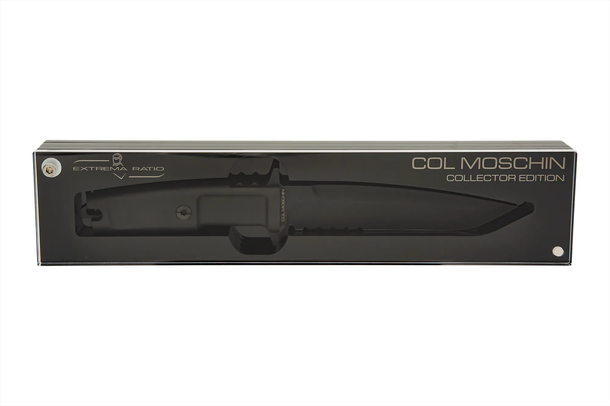 the historical force in whose footsteps the 9th walks – which sported asymmetrical blades and straight but direction-sensitive hilts. Designed to be light and handy, balanced decidedly toward the hilt, with a highly perforating blade-tip. Each new “Incursore” (assault paratrooper) is issued one of these knives and trained to use it to its best. Available versions: COL MOSCHIN BLACK, COL MOSCHIN DESERT WARFARE, COL MOSCHIN COLLECTOR EDITION (it comes with special plexiglass diplay case)