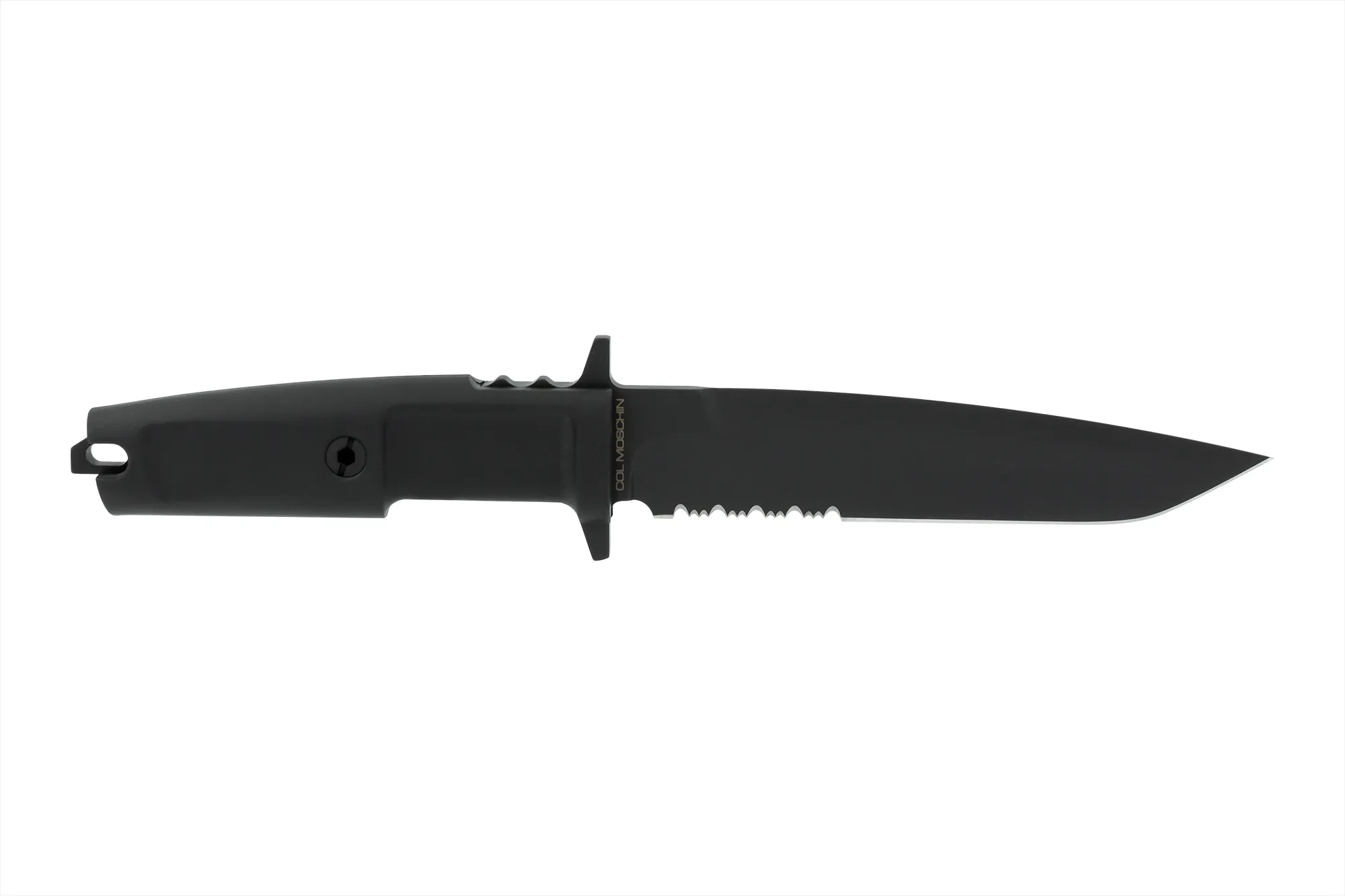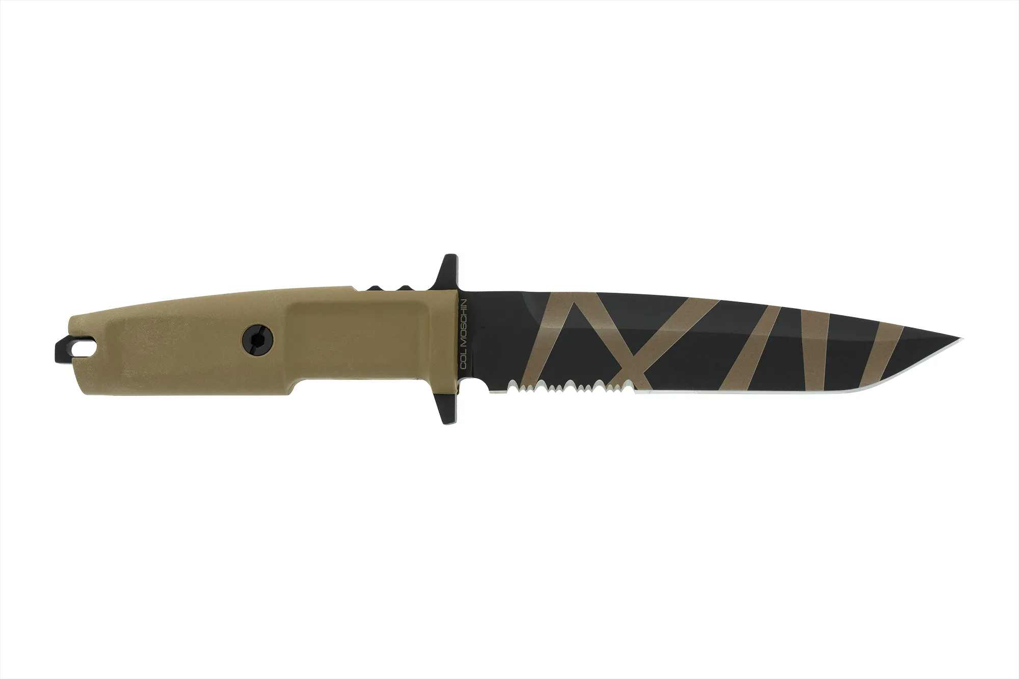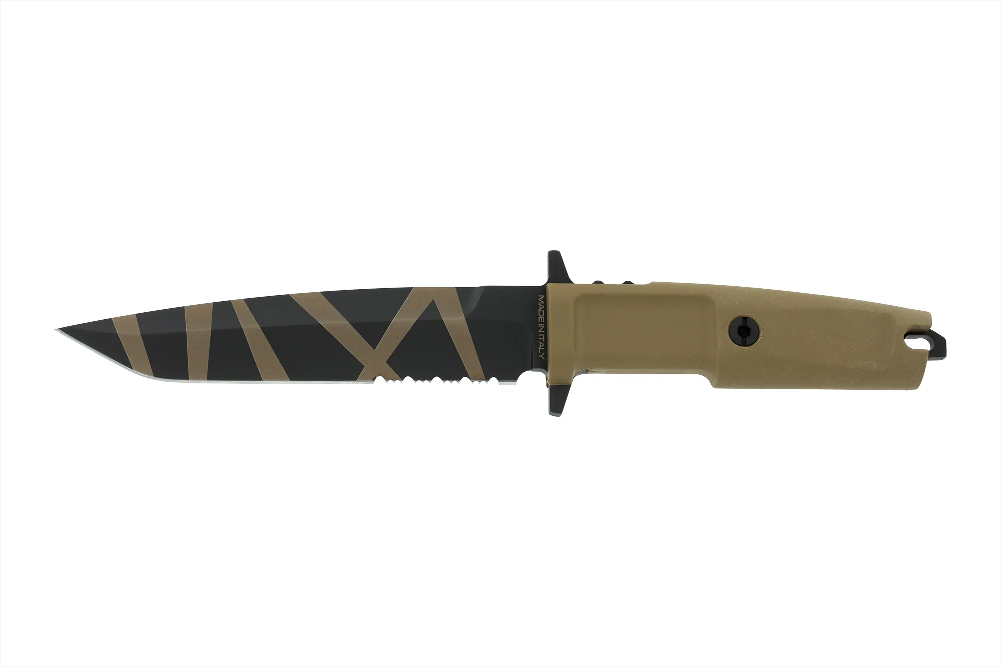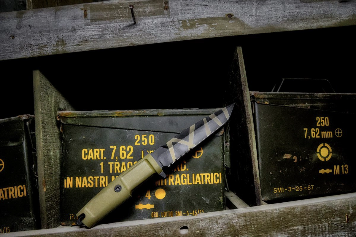 the historical force in whose footsteps the 9th walks – which sported asymmetrical blades and straight but direction-sensitive hilts. Designed to be light and handy, balanced decidedly toward the hilt, with a highly perforating blade-tip. Each new “Incursore” (assault paratrooper) is issued one of these knives and trained to use it to its best. Available versions: COL MOSCHIN BLACK, COL MOSCHIN DESERT WARFARE, COL MOSCHIN COLLECTOR EDITION (it comes with special plexiglass diplay case)
