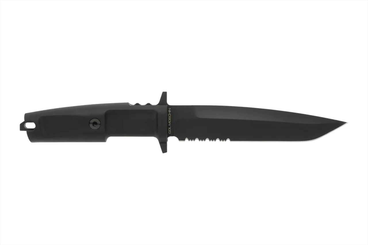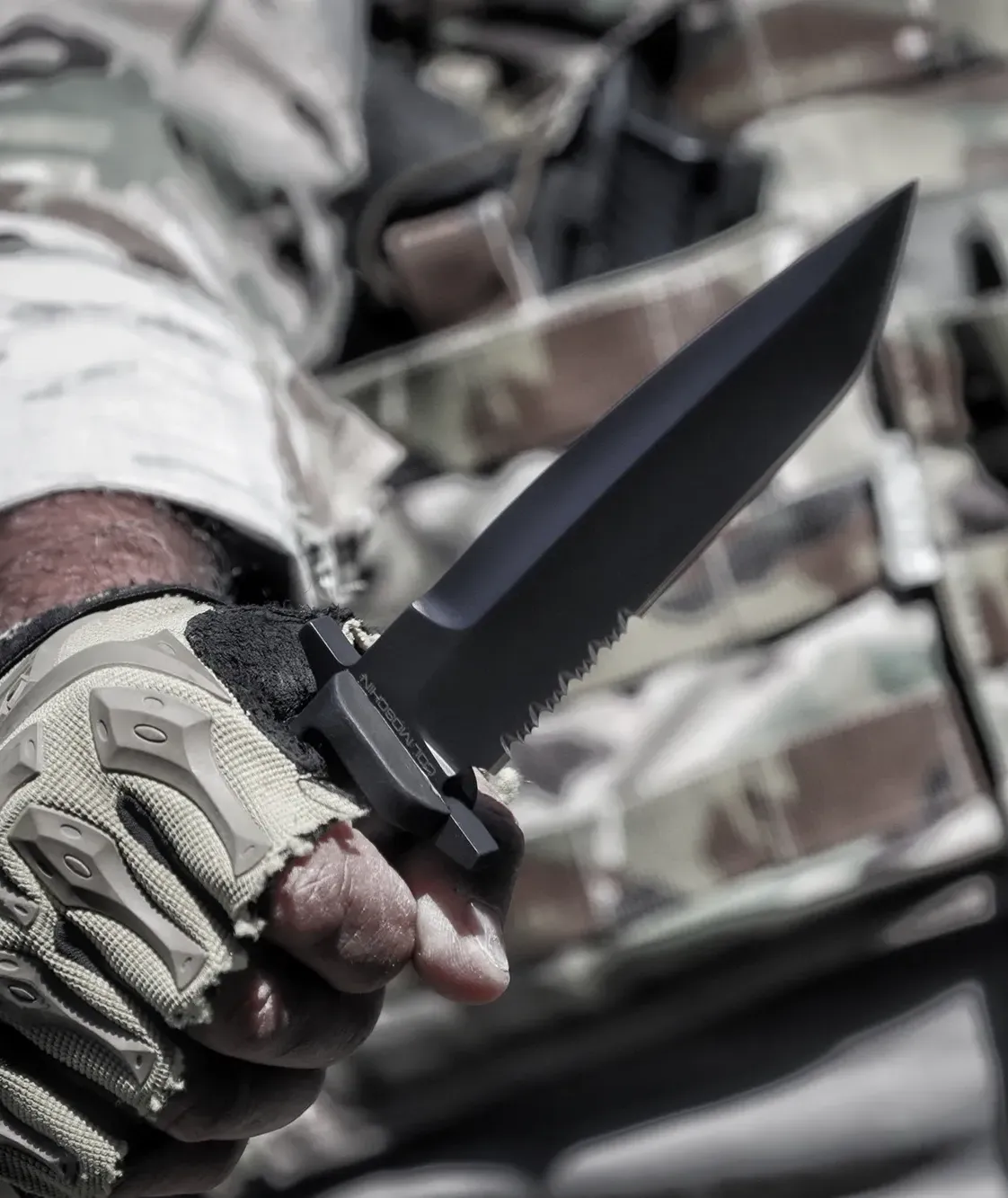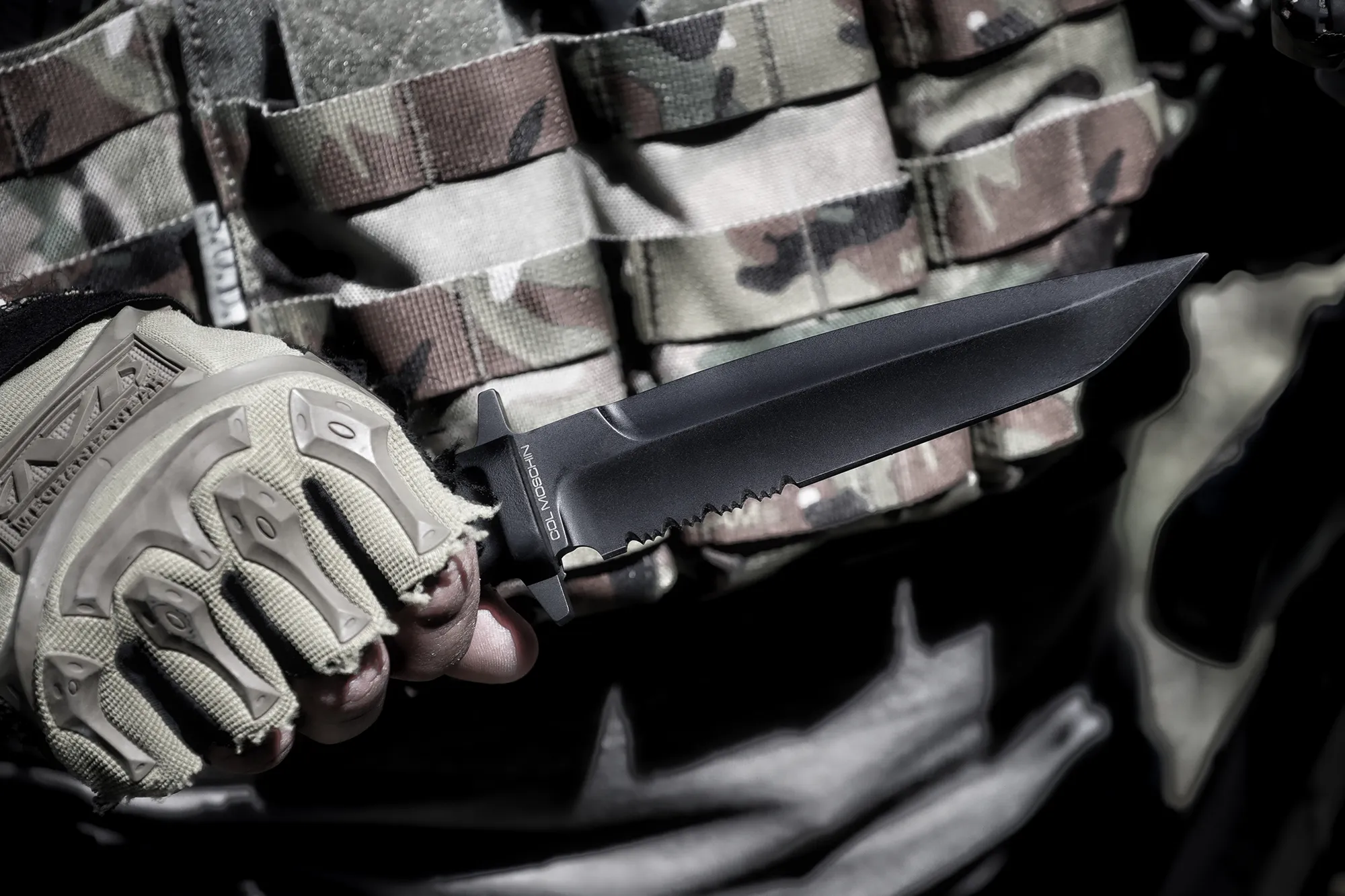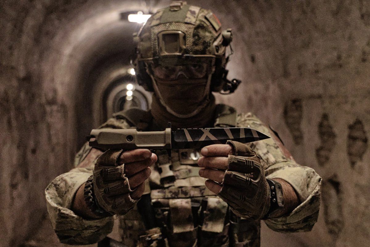 the historical force in whose footsteps the 9th walks – which sported asymmetrical blades and straight but direction-sensitive hilts. Designed to be light and handy, balanced decidedly toward the hilt, with a highly perforating blade-tip. Each new “Incursore” (assault paratrooper) is issued one of these knives and trained to use it to its best. Available versions: COL MOSCHIN BLACK, COL MOSCHIN DESERT WARFARE, COL MOSCHIN COLLECTOR EDITION (it comes with special plexiglass diplay case)