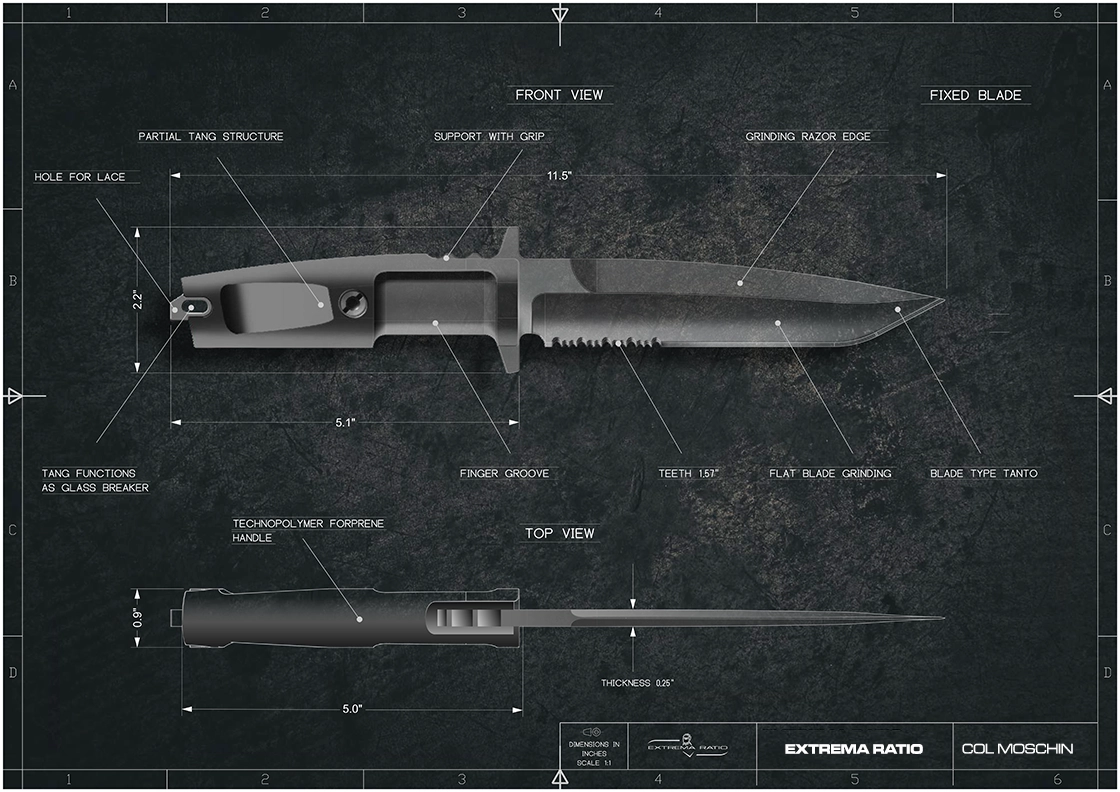 Unlike the other DOBERMANN IVs, the DOBERMANN IV S600 is made of Böhler S600 steel. This material is used for manufacturing metalwork and stamp-creation tools. The high content of molybdenum, tungsten and a good presence of vanadium in its chemical composition provide excellent qualities of hardness, wear resistance and toughness. The presence of cobalt stimulates the growth of small uniformly distributed carbides, which enhance mechanical qualities such as bending capacity. The blade of DOBERMANN IV S600 is hardened and cryogenically treated, thus reaching an exceptional hardness of 64 HRC; this makes it very resistant to wear and gives the edge a lasting sharpening. Böhler S600 has 4.5% of chrome, which makes it oxidizable. For this reason, Extrema Ratio has chosen the new EXP DARK Teflon-based finish.