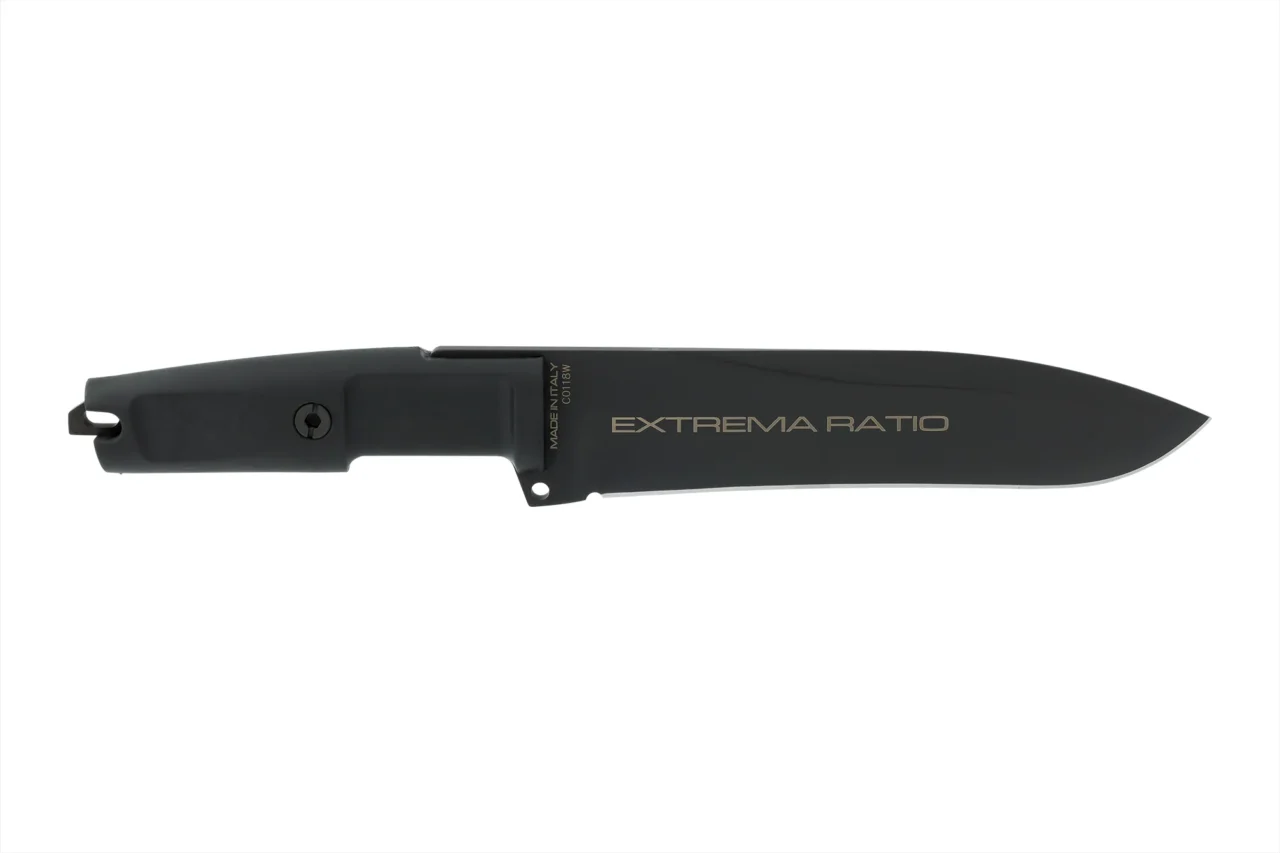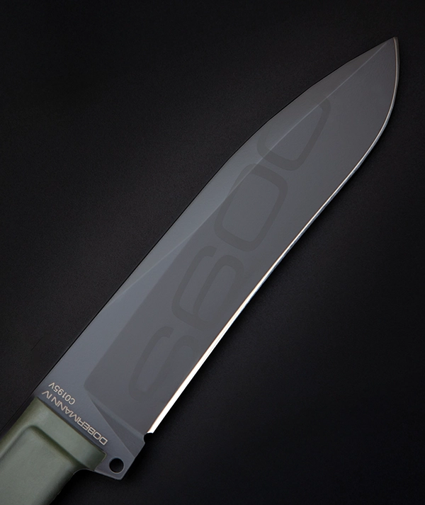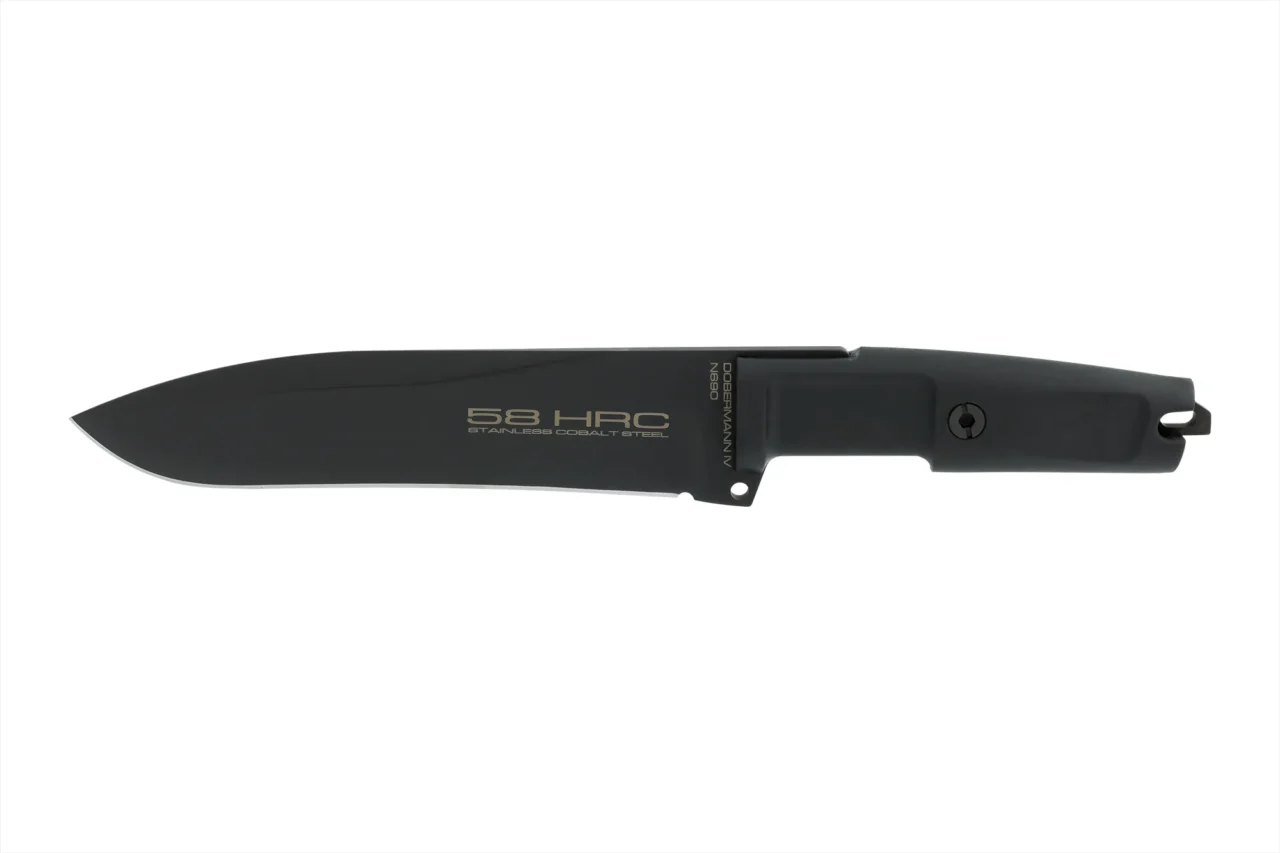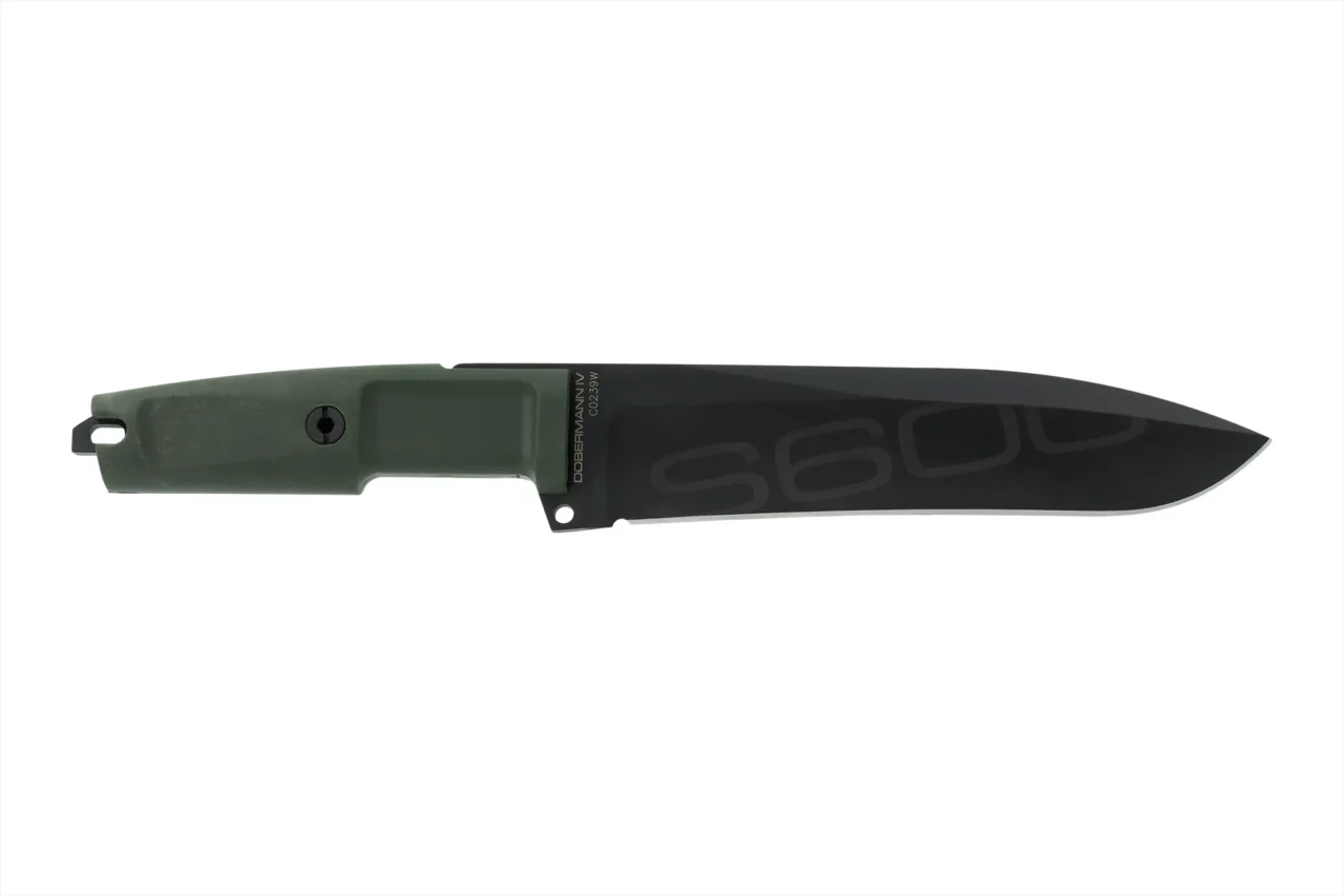 Unlike the other DOBERMANN IVs, the DOBERMANN IV S600 is made of Böhler S600 steel. This material is used for manufacturing metalwork and stamp-creation tools. The high content of molybdenum, tungsten and a good presence of vanadium in its chemical composition provide excellent qualities of hardness, wear resistance and toughness. The presence of cobalt stimulates the growth of small uniformly distributed carbides, which enhance mechanical qualities such as bending capacity. The blade of DOBERMANN IV S600 is hardened and cryogenically treated, thus reaching an exceptional hardness of 64 HRC; this makes it very resistant to wear and gives the edge a lasting sharpening. Böhler S600 has 4.5% of chrome, which makes it oxidizable. For this reason, Extrema Ratio has chosen the new EXP DARK Teflon-based finish.