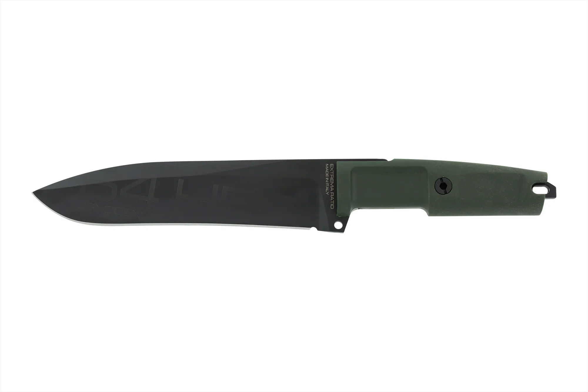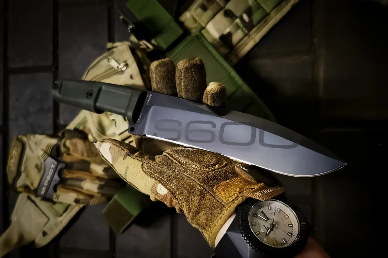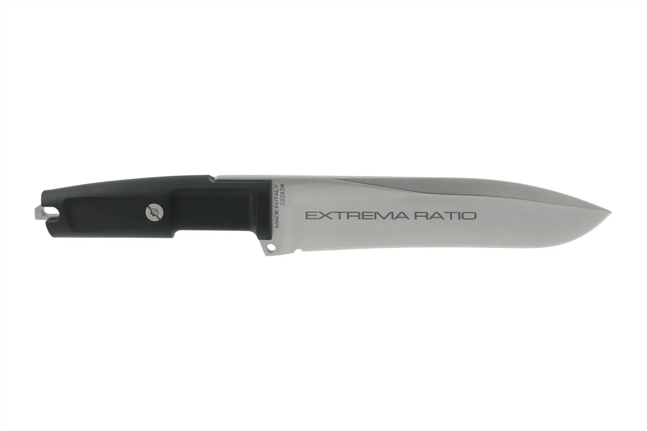 Unlike the other DOBERMANN IVs, the DOBERMANN IV S600 is made of Böhler S600 steel. This material is used for manufacturing metalwork and stamp-creation tools. The high content of molybdenum, tungsten and a good presence of vanadium in its chemical composition provide excellent qualities of hardness, wear resistance and toughness. The presence of cobalt stimulates the growth of small uniformly distributed carbides, which enhance mechanical qualities such as bending capacity. The blade of DOBERMANN IV S600 is hardened and cryogenically treated, thus reaching an exceptional hardness of 64 HRC; this makes it very resistant to wear and gives the edge a lasting sharpening. Böhler S600 has 4.5% of chrome, which makes it oxidizable. For this reason, Extrema Ratio has chosen the new EXP DARK Teflon-based finish.