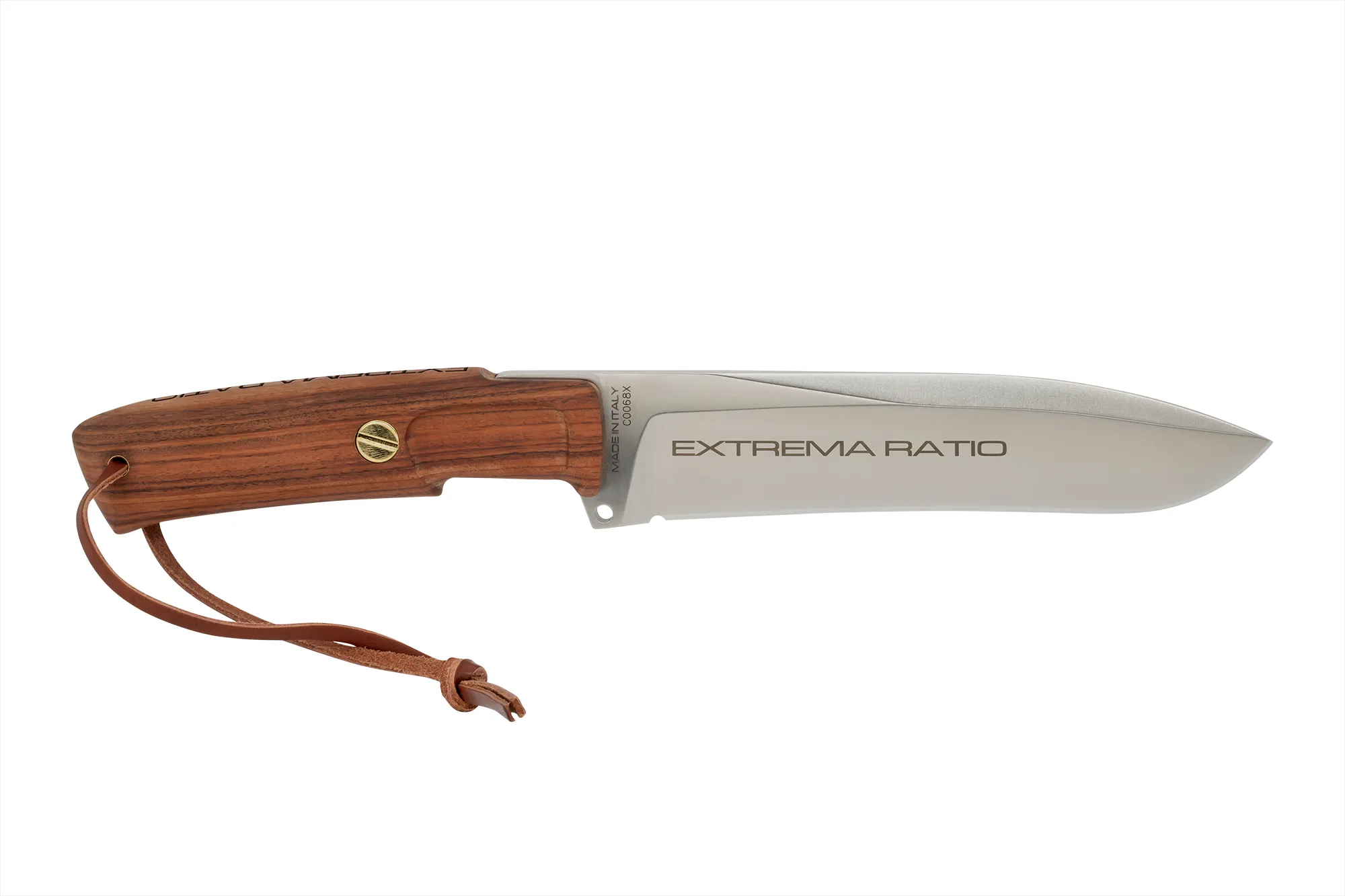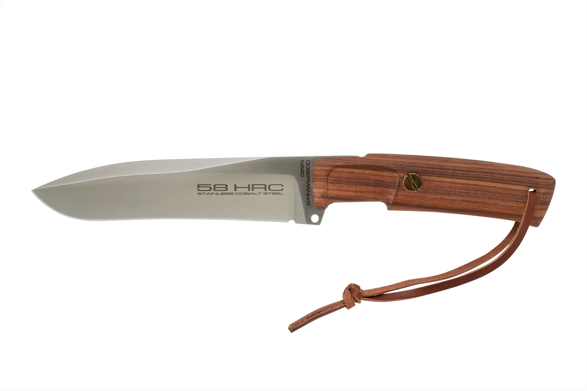 DOBERMANN IV Africa is a knife dedicated to hunting professionals. It is equipped with a Santos Rosewood handle and a blade made of Böhler N690 steel, the time-tested Austrian steel enriched with chromium, vanadium, molybdenum and cobalt. Used by Extrema Ratio to produce its blades, this steel is characterized by the perfect balance between hardness, resistance and resilience, which are essential to obtain effective and long-lasting sharpening.