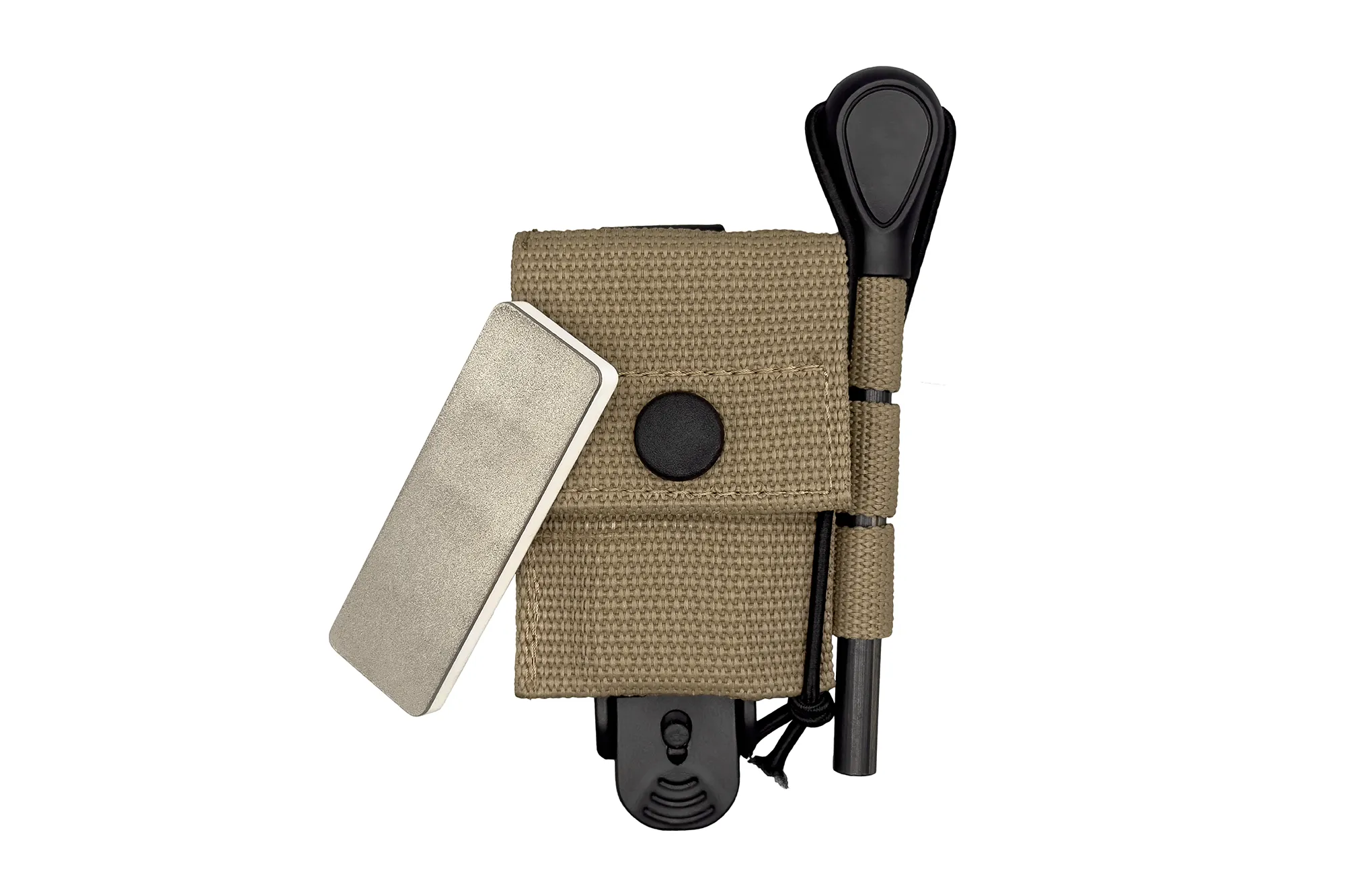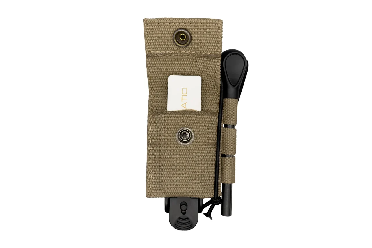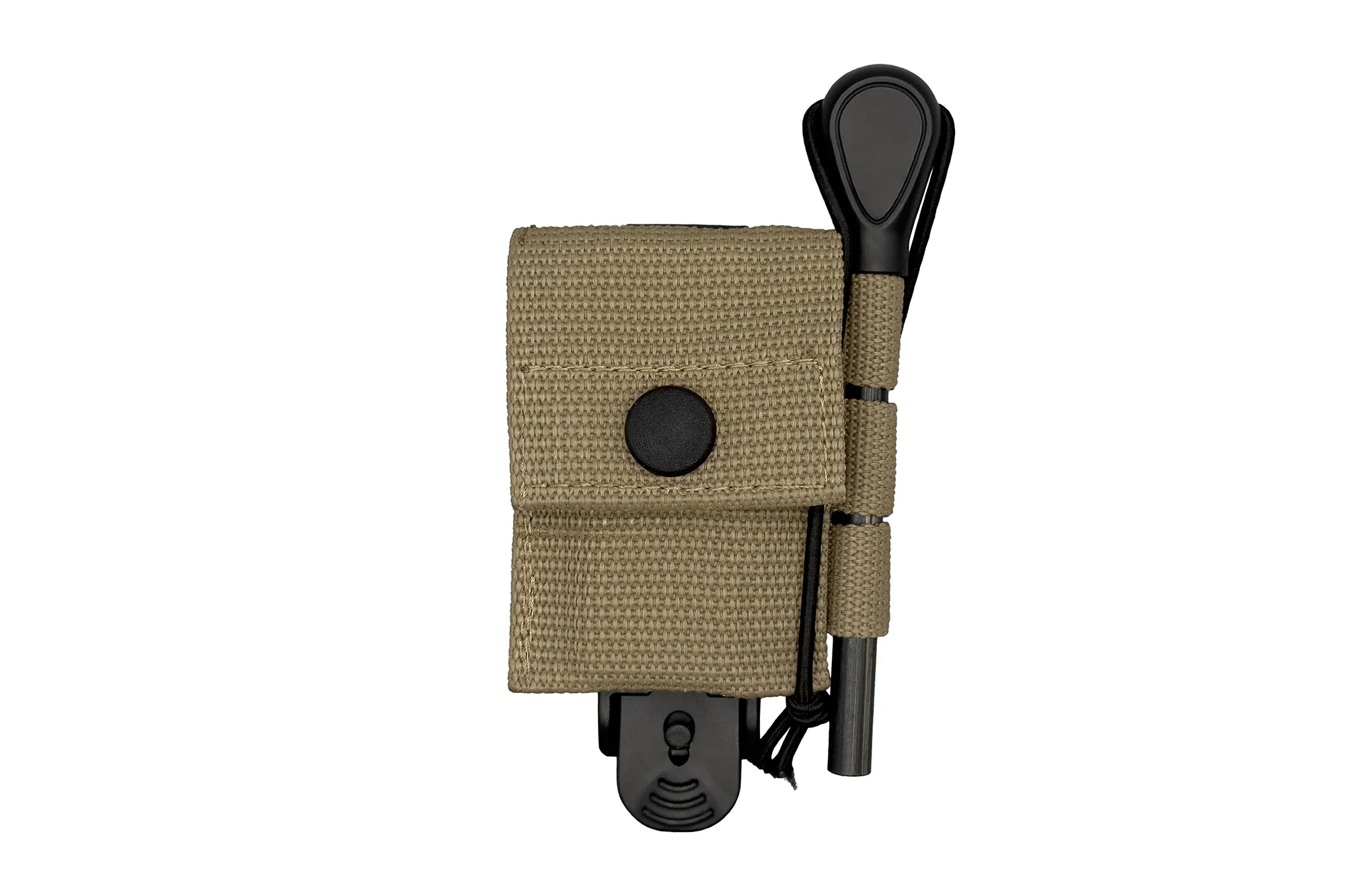 It comes inside a mini pouch in desert-coloured textile, equipped with a malice clip and M.O.L.L.E. system webbing. It includes a firesteel for lighting fires.
