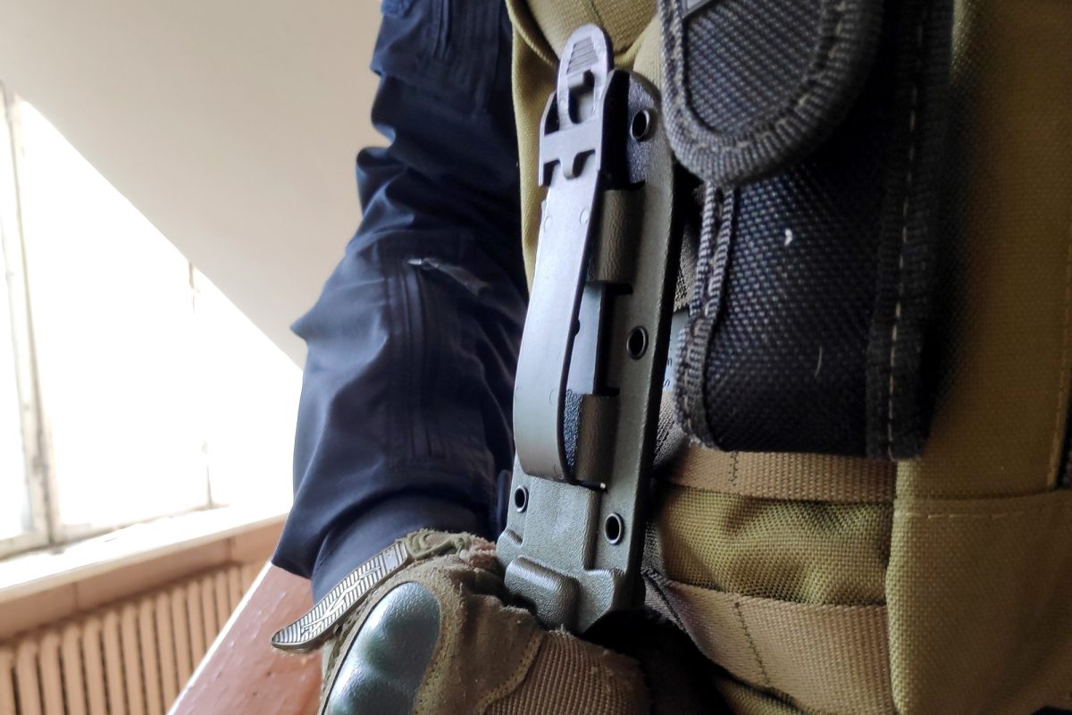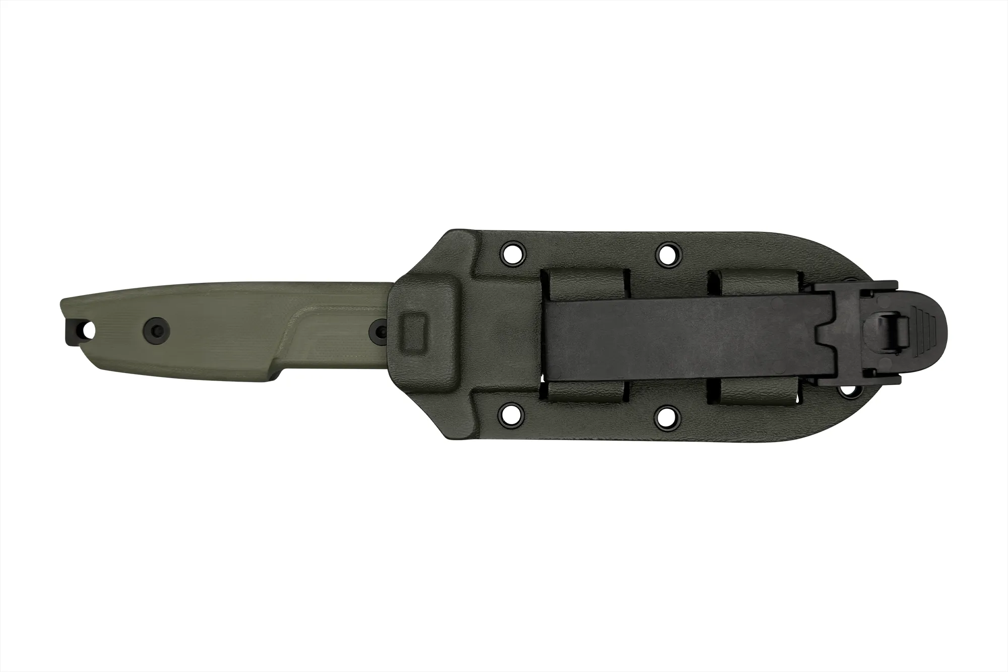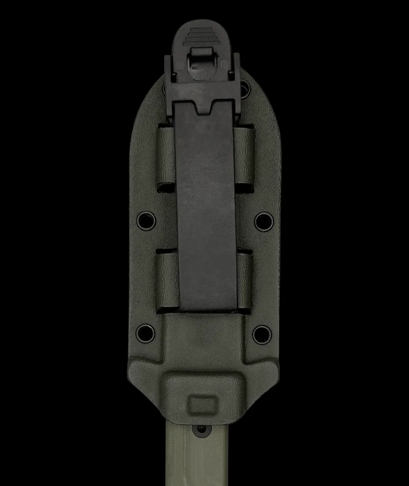 The polymeric sheath is adaptable and can be carried on a service belt or mounted on M.O.L.L.E. panel of tactical vests, backpacks or other equipment.