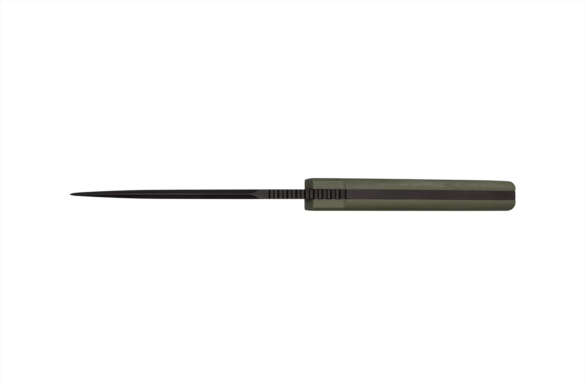 The profile of the blade is of the modified spearpoint type, with a false counter-thread ¾ in length on the back and a lower guard to protect the hand during use.