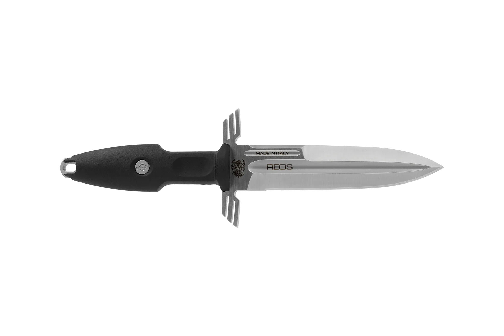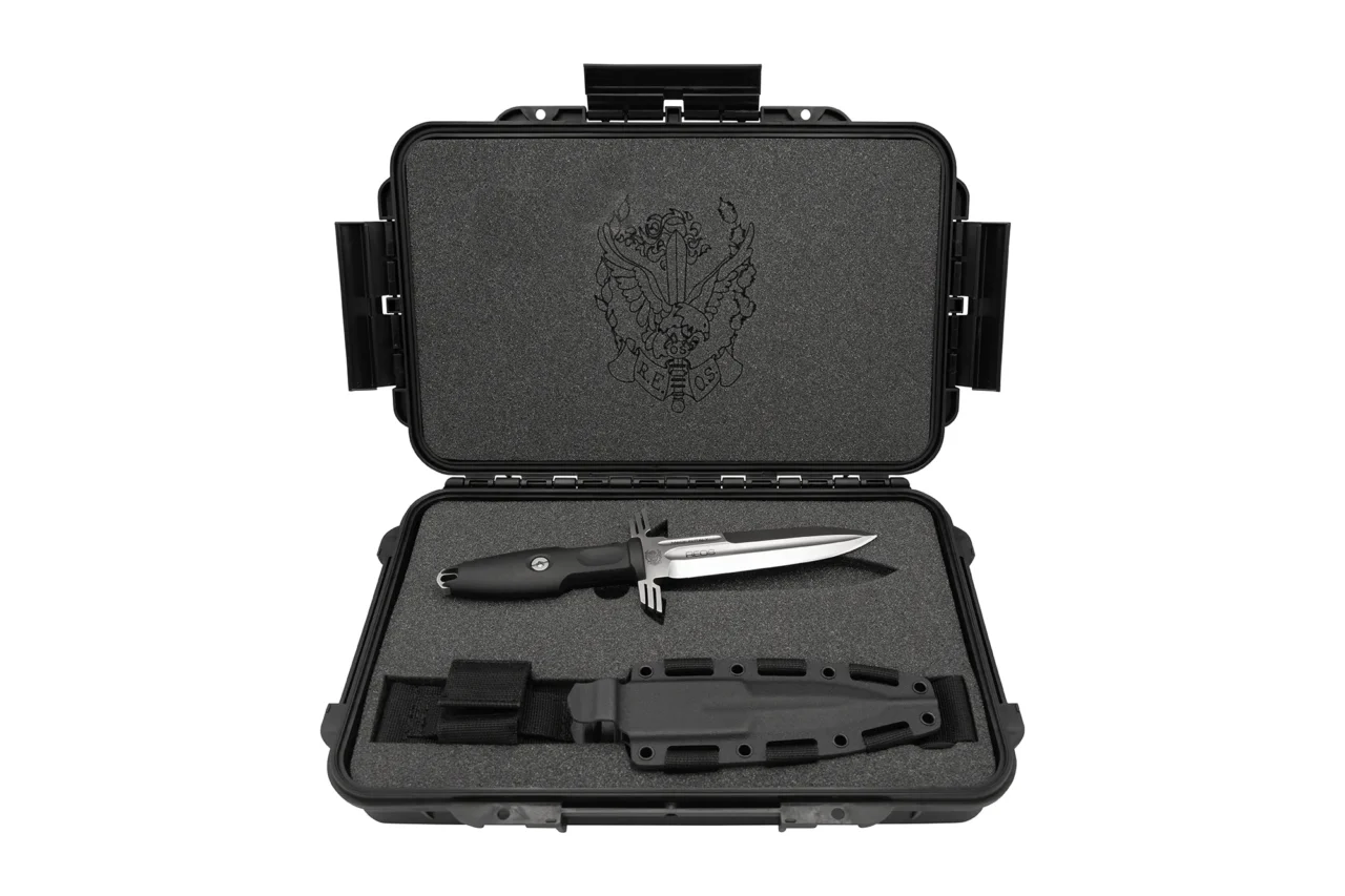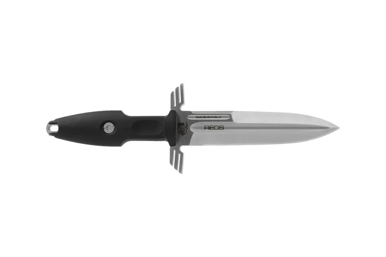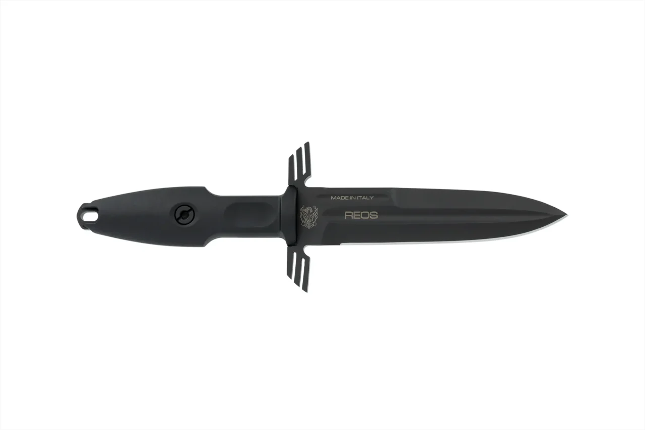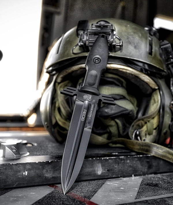 R.E.O.S. is the operational unit of helicopters supporting the special forces composed by specifically trained staff, particularly trained and equipped in order to support military activities in every operational context. It is available in two different versions: “ERMES ORDINANZA” with satin blade and ABS suitcase “ERMES OPERATIVO” with burnished blade The steel used is the reliable Bölher N690Co heat treated at 58 HRC. Fiberglass-reinforced polyamide FRN (Fiber Reinforced Nylon) was chosen for the handle. The hybrid sheath in Kydex and fabric has a belt attachment with MOLLE system.