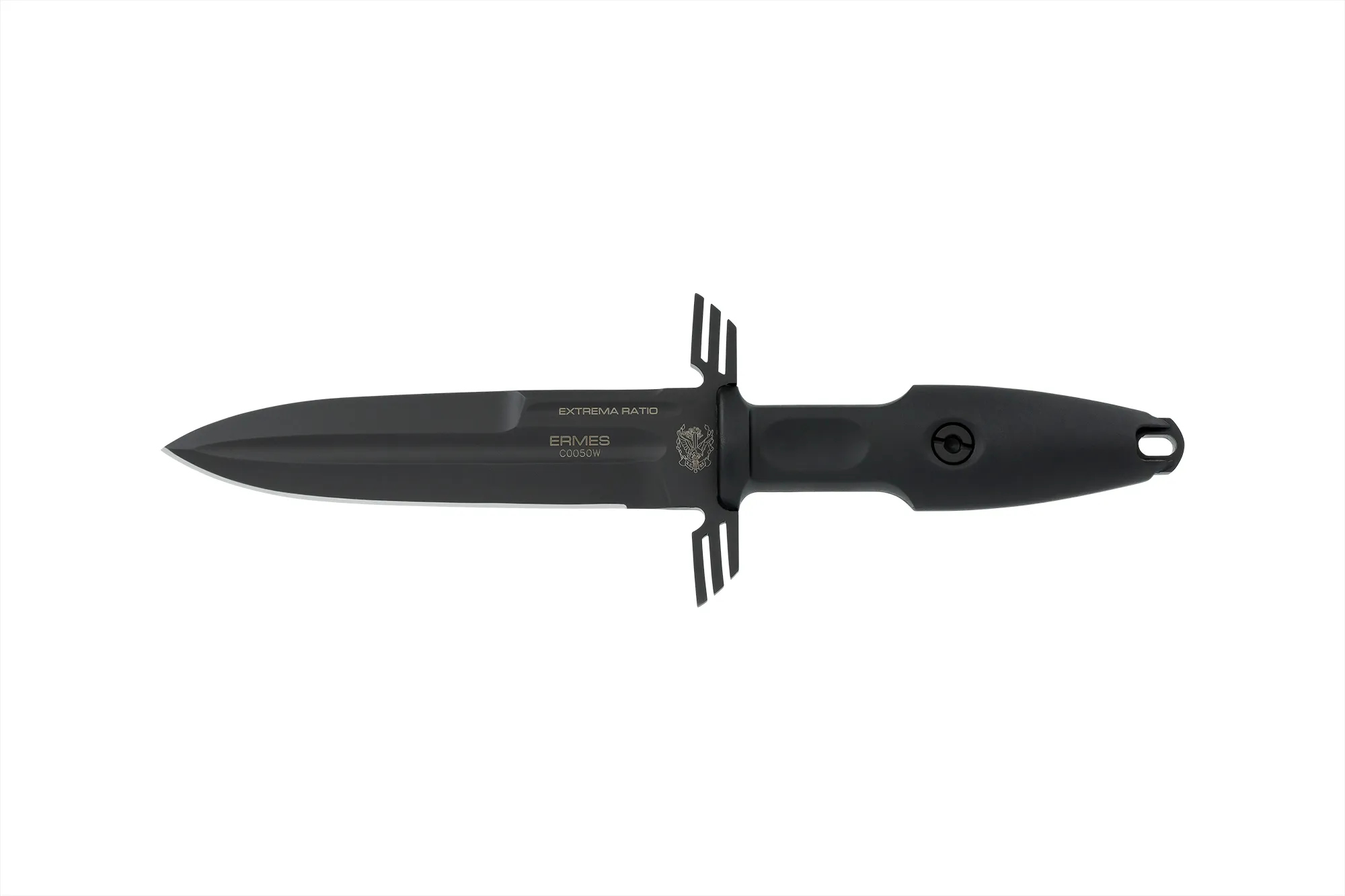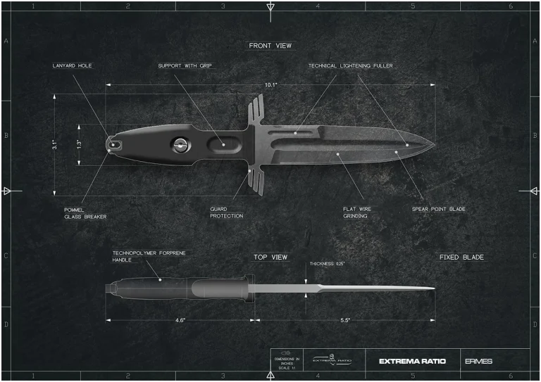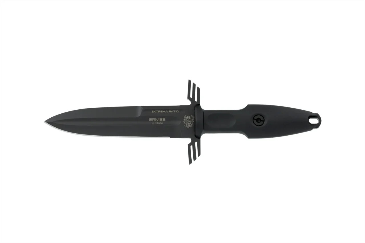Unlike the other DOBERMANN IVs, the DOBERMANN IV S600 is made of Böhler S600 steel. This material is used for manufacturing metalwork and stamp-creation tools. The high content of molybdenum, tungsten and a good presence of vanadium in its chemical composition provide excellent qualities of hardness, wear resistance and toughness. The presence of cobalt stimulates the growth of small uniformly distributed carbides, which enhance mechanical qualities such as bending capacity. The blade of DOBERMANN IV S600 is hardened and cryogenically treated, thus reaching an exceptional hardness of 64 HRC; this makes it very resistant to wear and gives the edge a lasting sharpening. Böhler S600 has 4.5% of chrome, which makes it oxidizable. For this reason, Extrema Ratio has chosen the new EXP DARK Teflon-based finish.