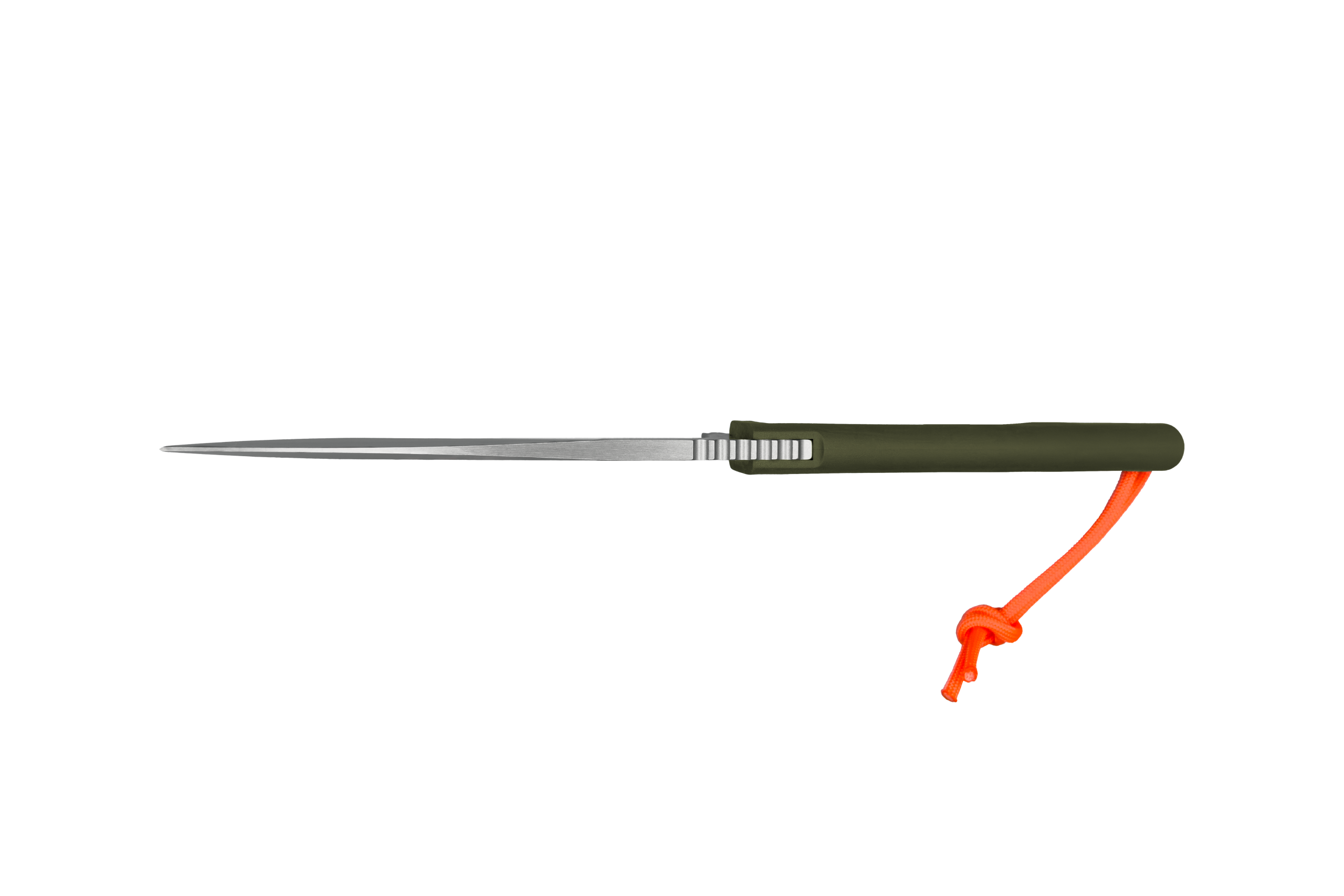 The high‑visibility orange paracord is a safety feature: when the knife falls, when the terrain hides it, finding it again becomes essential.