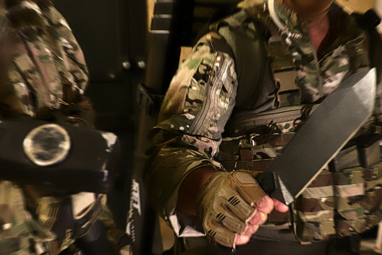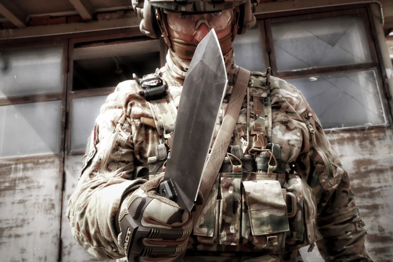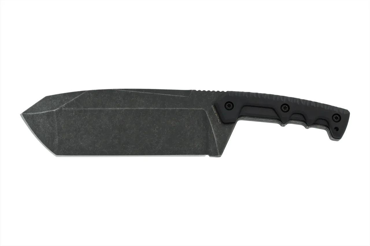 The blade, characterized by a full flat grind, has a particular tip structure that protects the main cutting edge and combines the ability to penetrate with the possibility of using it as a lever. Its shape and width also allow it to dig small holes in the ground in emergency situations.