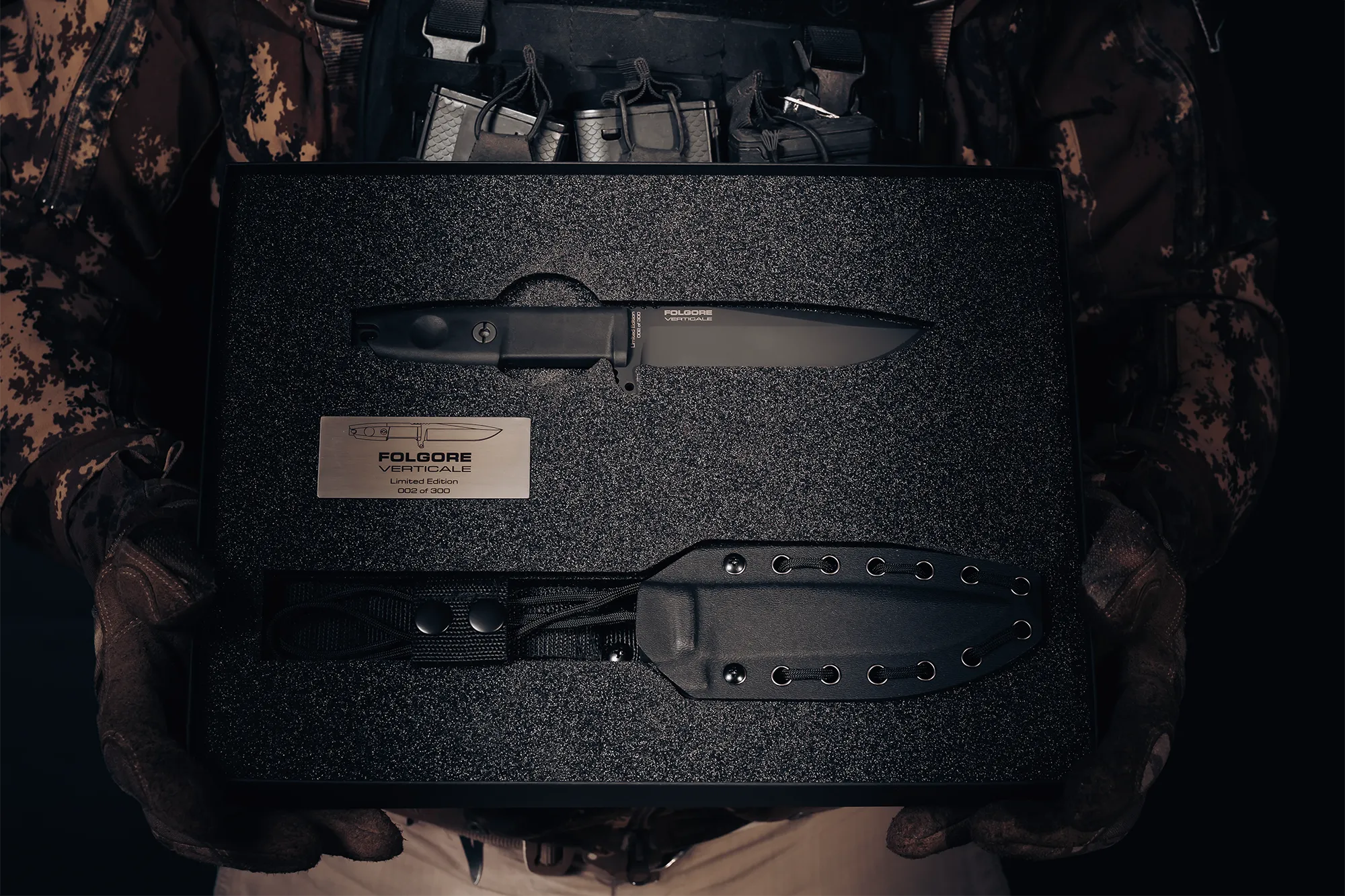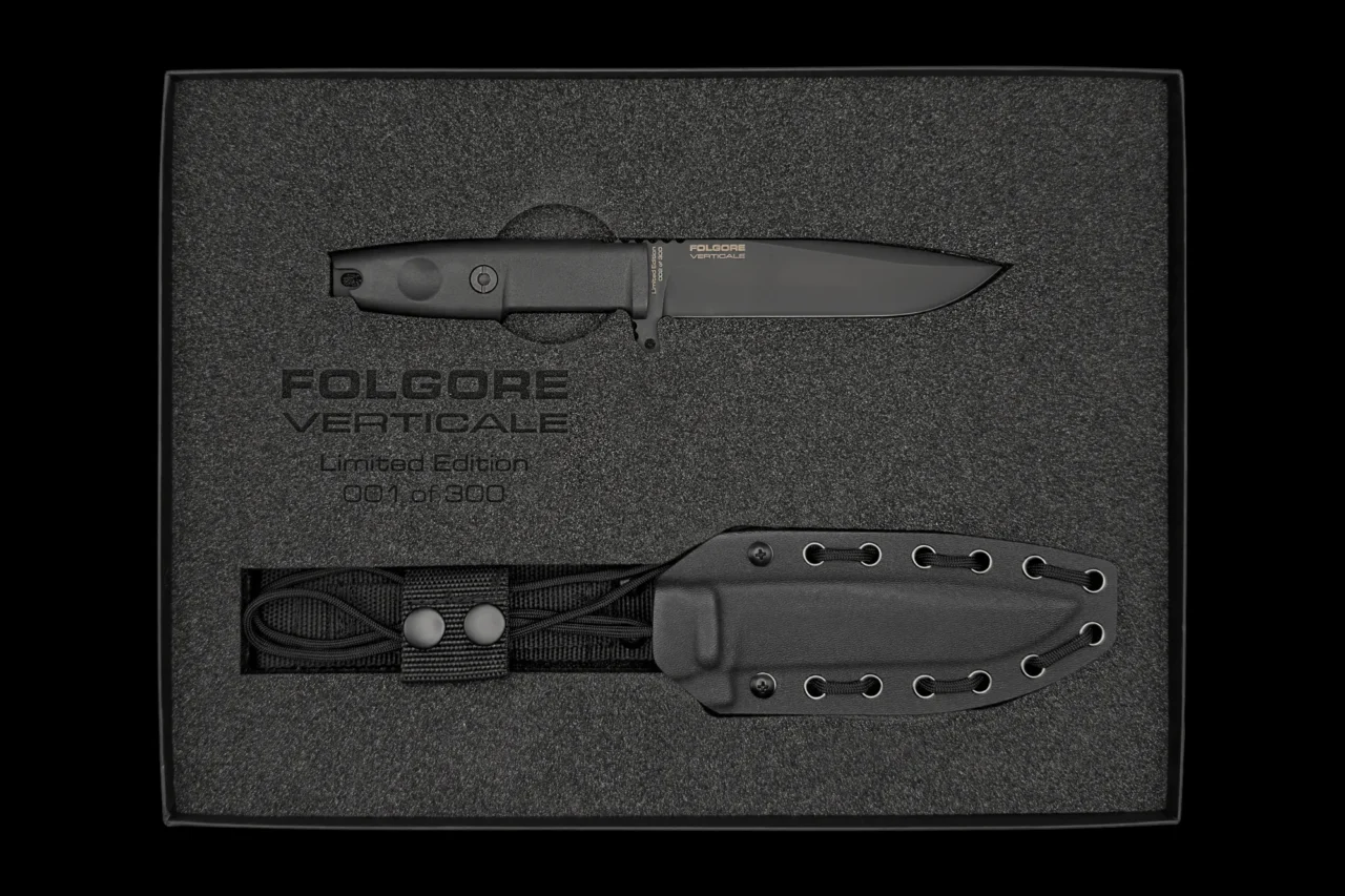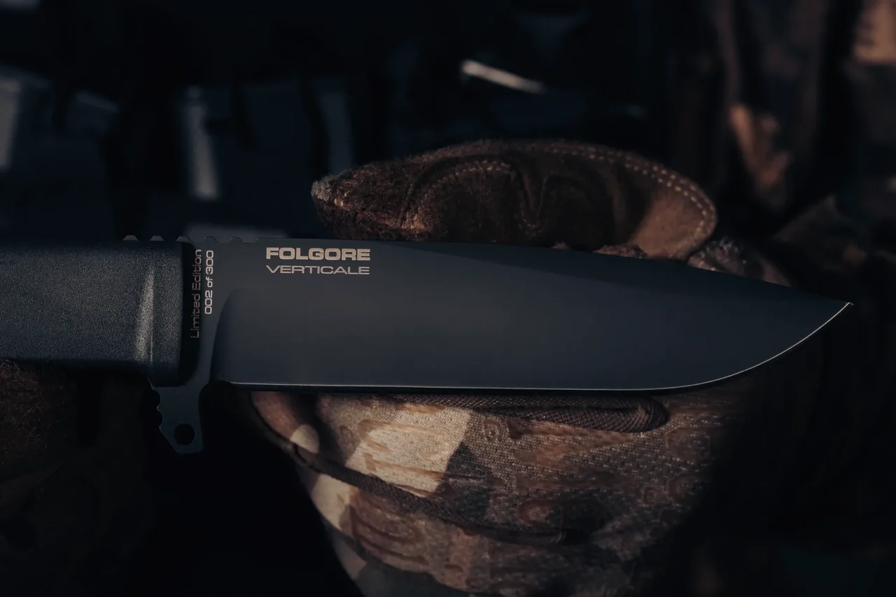 Operational altitude. Thin air. Silence. The body descends vertically; every movement is control. No margin, no second chances. In that moment, everything you carry must work. No unnecessary weight. No compromise. FOLGORE VERTICALE is the technical evolution of a project developed to operate in environments where every gram and every millimeter make a difference. The name reflects the vertical discipline of military parachuting: a phase where precision, control, and discipline define survival. It shares the DNA of the FOLGORE model, born from a collaboration with the Italian Army Paratroopers Brigade “Folgore” and developed through field testing alongside qualified operational personnel. Nothing more needs to be said. Those who know, choose it. Balance, speed, control The blade is made of Böhler M390 steel (61 HRC), a choice that ensures extreme resistance, edge retention, and uncompromising reliability. The dark finish eliminates reflections, defining a tool that is technical, essential, and purely operational. Weight is reduced to the absolute minimum. Less fatigue during extended carry, even in full tactical loadouts. More speed. More control. More immediacy. FOLGORE VERTICALE is designed to go unnoticed. Until it’s needed. The drop point blade and ergonomic handle ensure total control for movements that are clean, controlled, immediate. Limited Edition FOLGORE VERTICALE is a Limited Edition of only 300 numbered pieces. Once gone, no more.