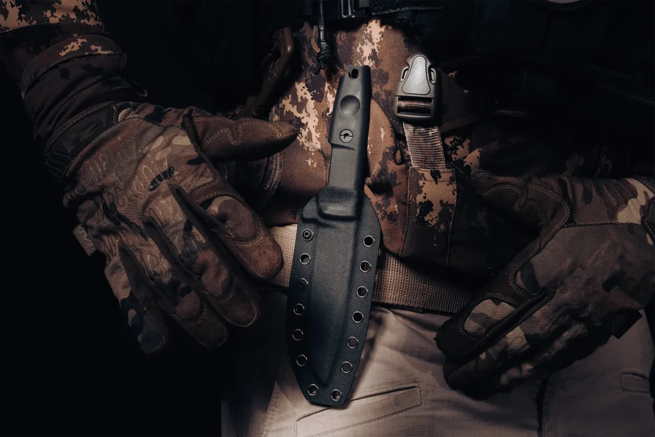 - Kydex Sheath: with adjustable textile extension for belt carry and paracord for thigh carry configuration.