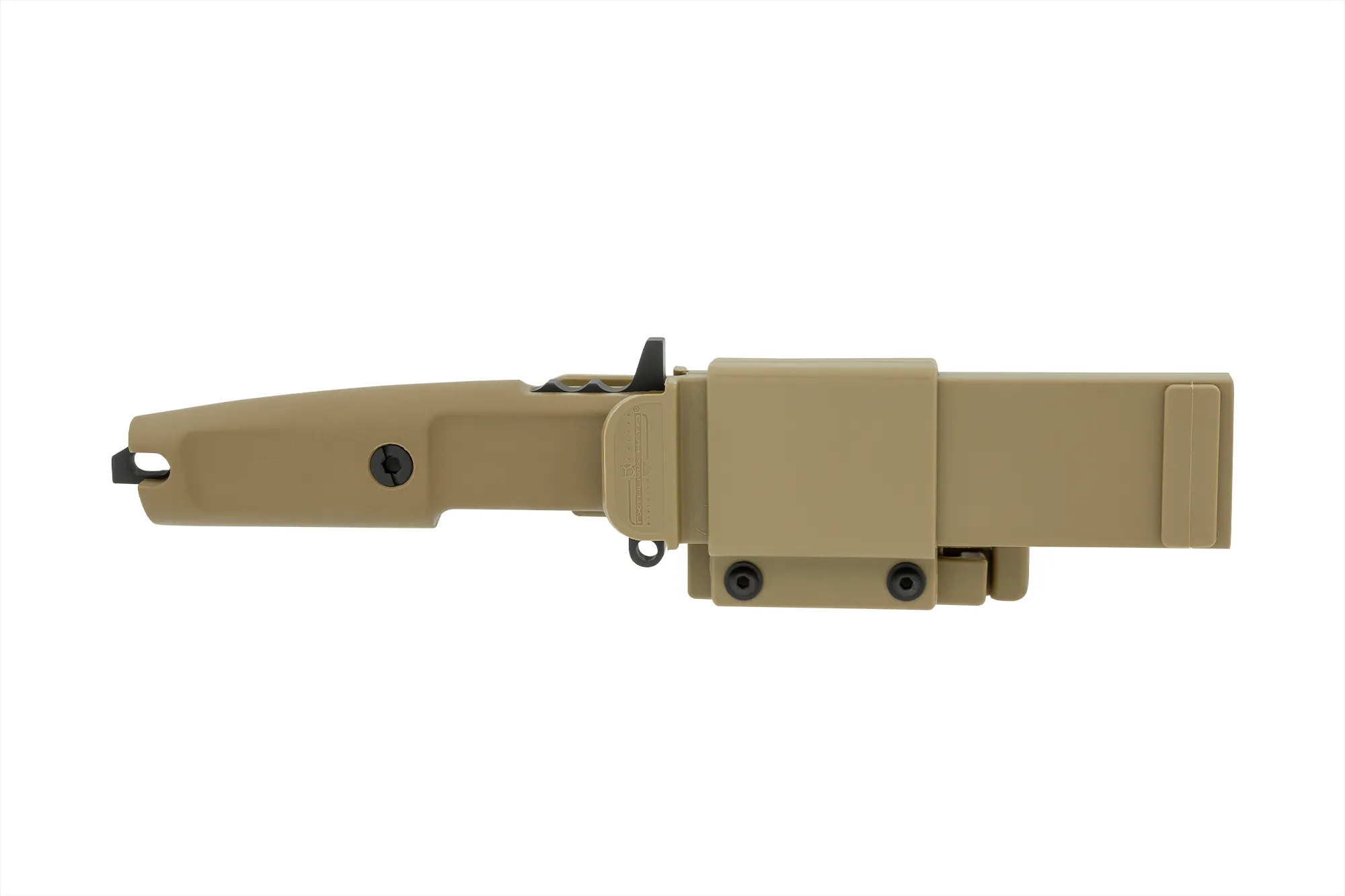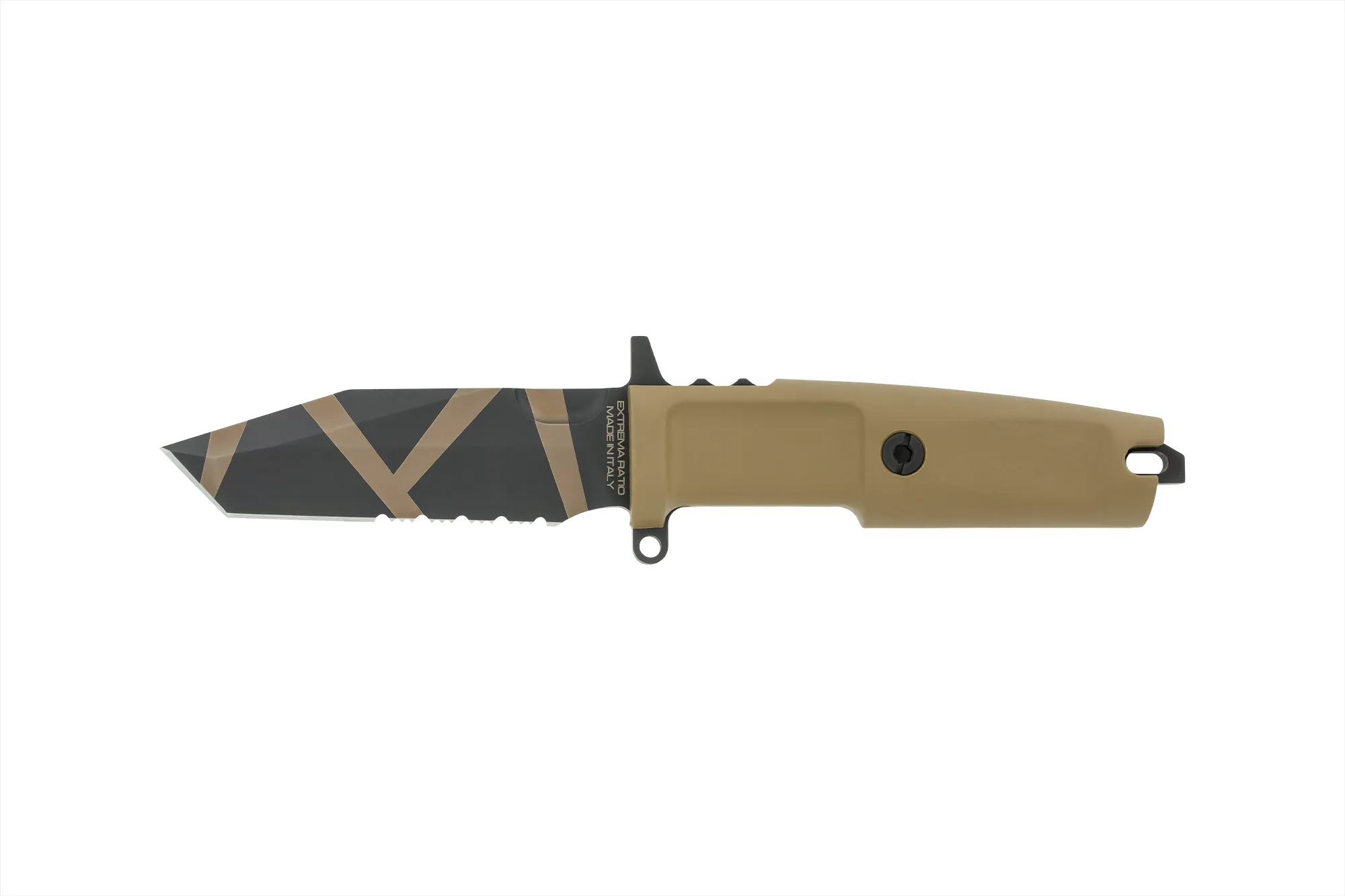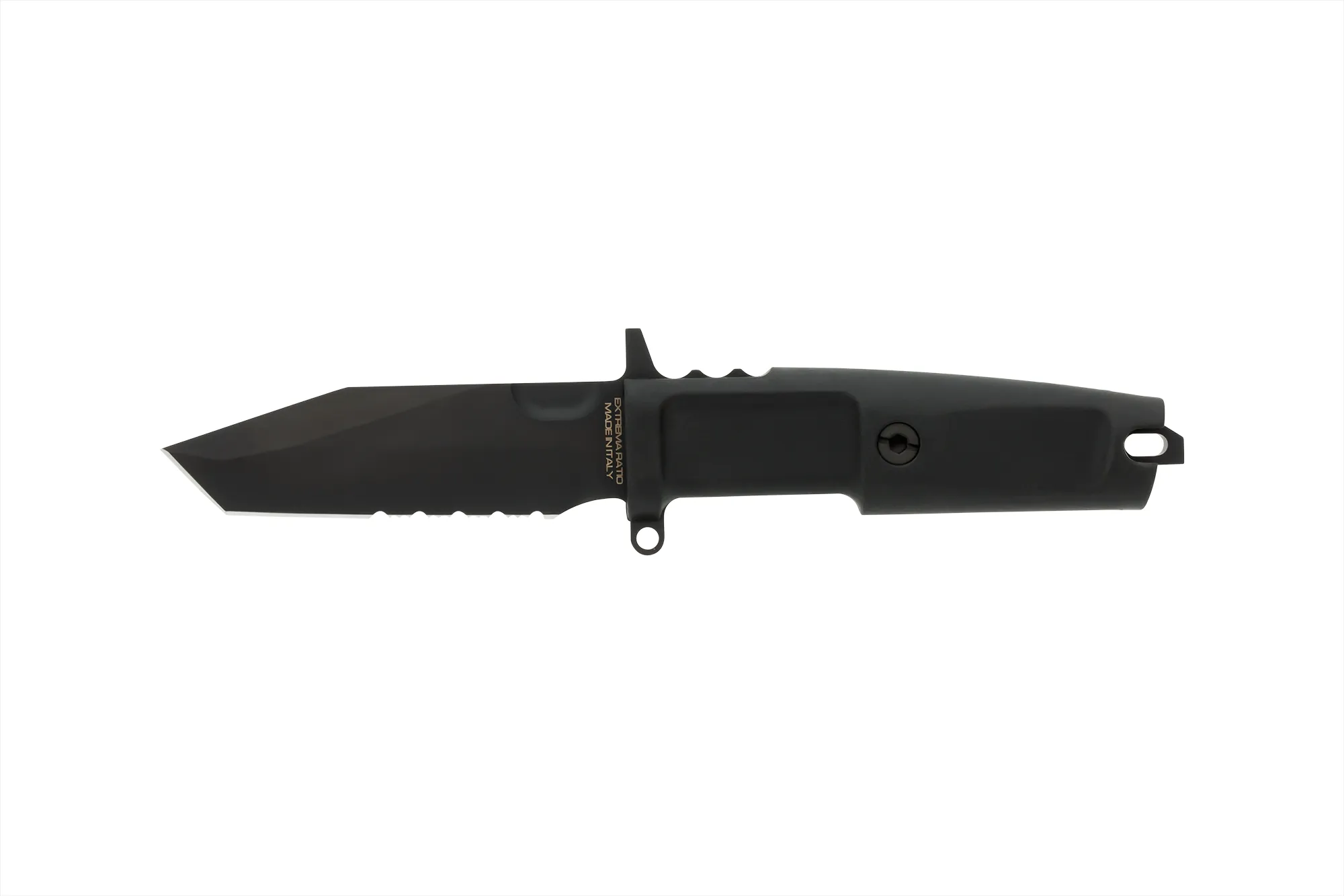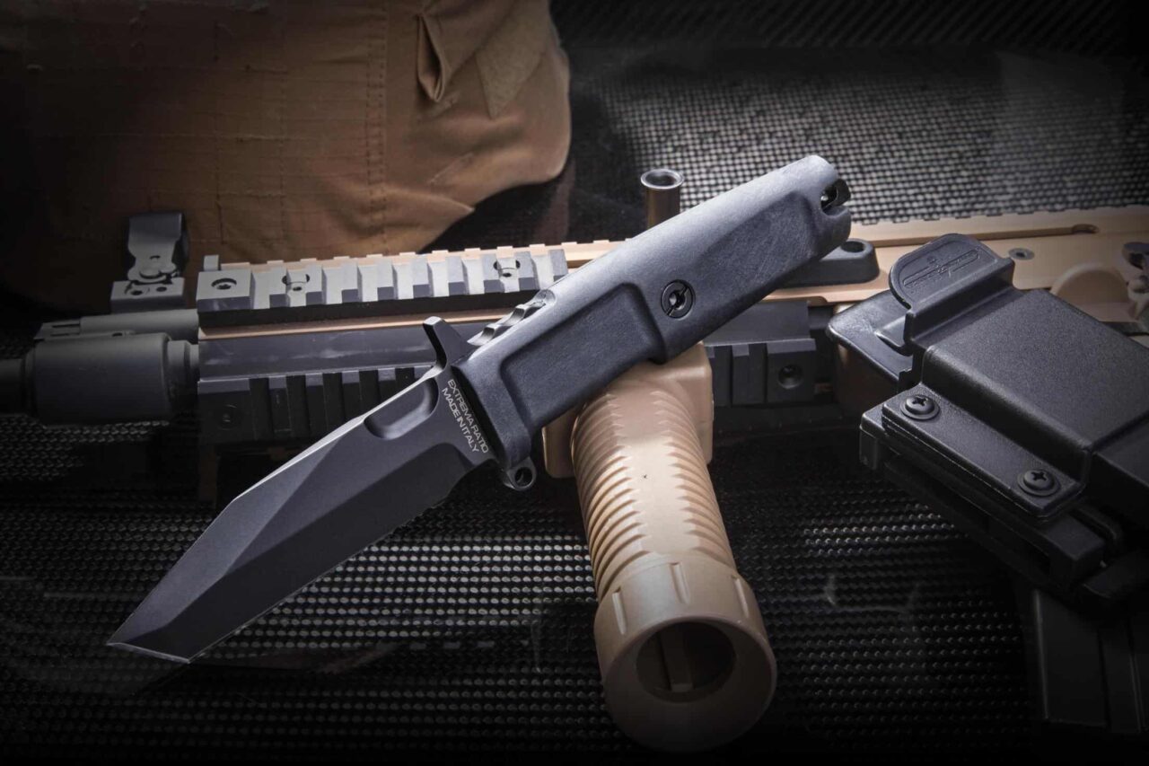 Unlike the other DOBERMANN IVs, the DOBERMANN IV S600 is made of Böhler S600 steel. This material is used for manufacturing metalwork and stamp-creation tools. The high content of molybdenum, tungsten and a good presence of vanadium in its chemical composition provide excellent qualities of hardness, wear resistance and toughness. The presence of cobalt stimulates the growth of small uniformly distributed carbides, which enhance mechanical qualities such as bending capacity. The blade of DOBERMANN IV S600 is hardened and cryogenically treated, thus reaching an exceptional hardness of 64 HRC; this makes it very resistant to wear and gives the edge a lasting sharpening. Böhler S600 has 4.5% of chrome, which makes it oxidizable. For this reason, Extrema Ratio has chosen the new EXP DARK Teflon-based finish.