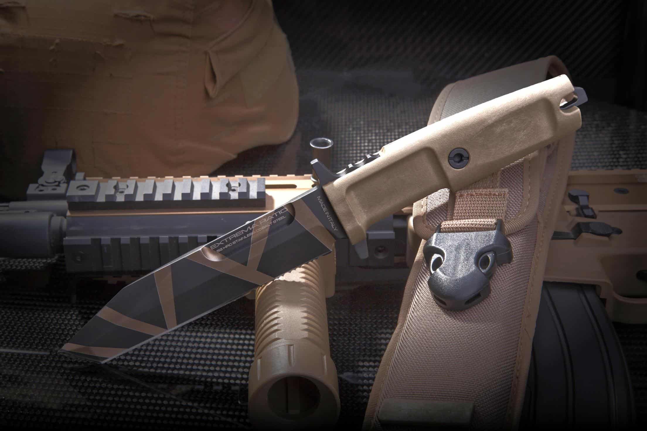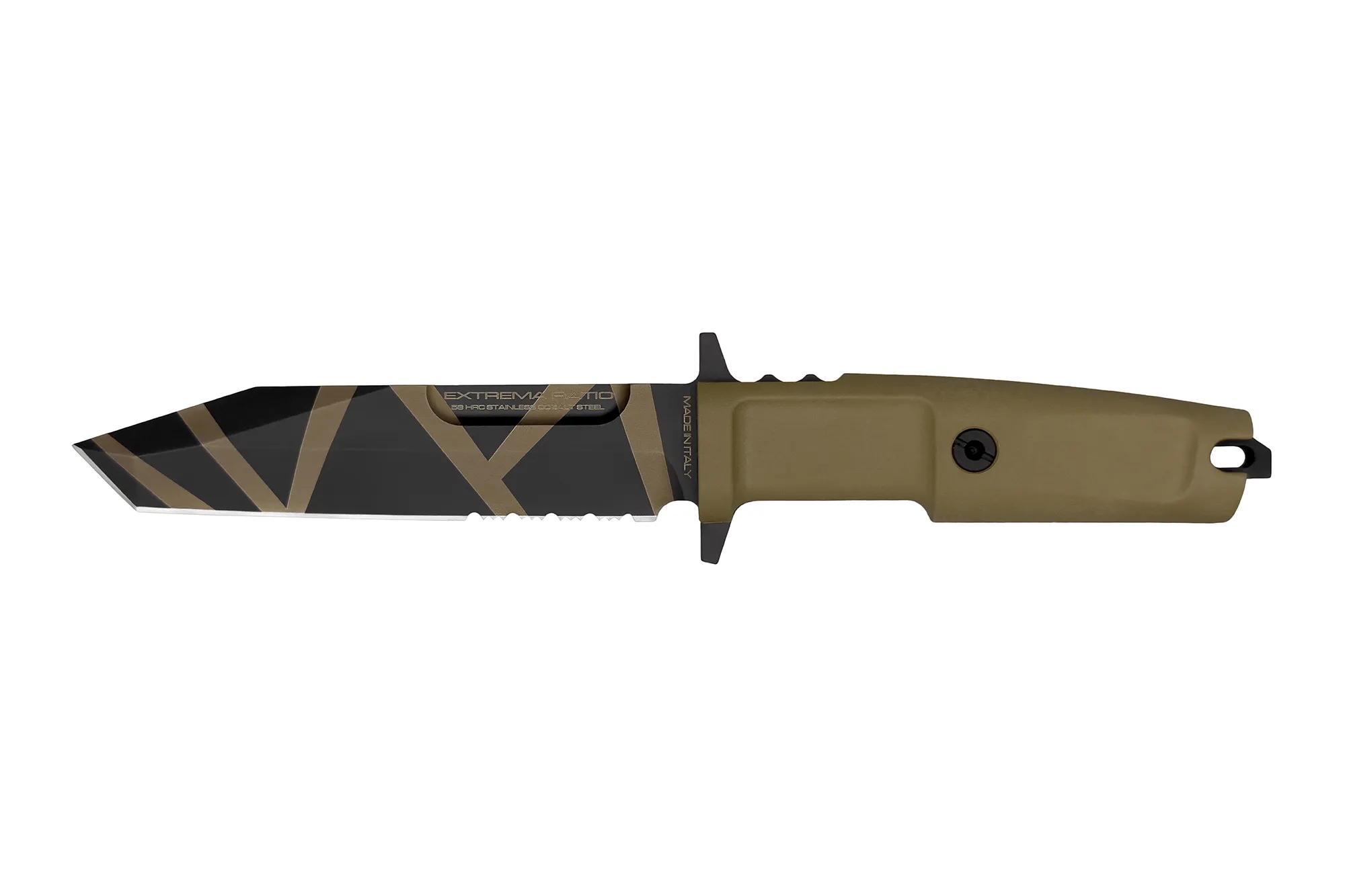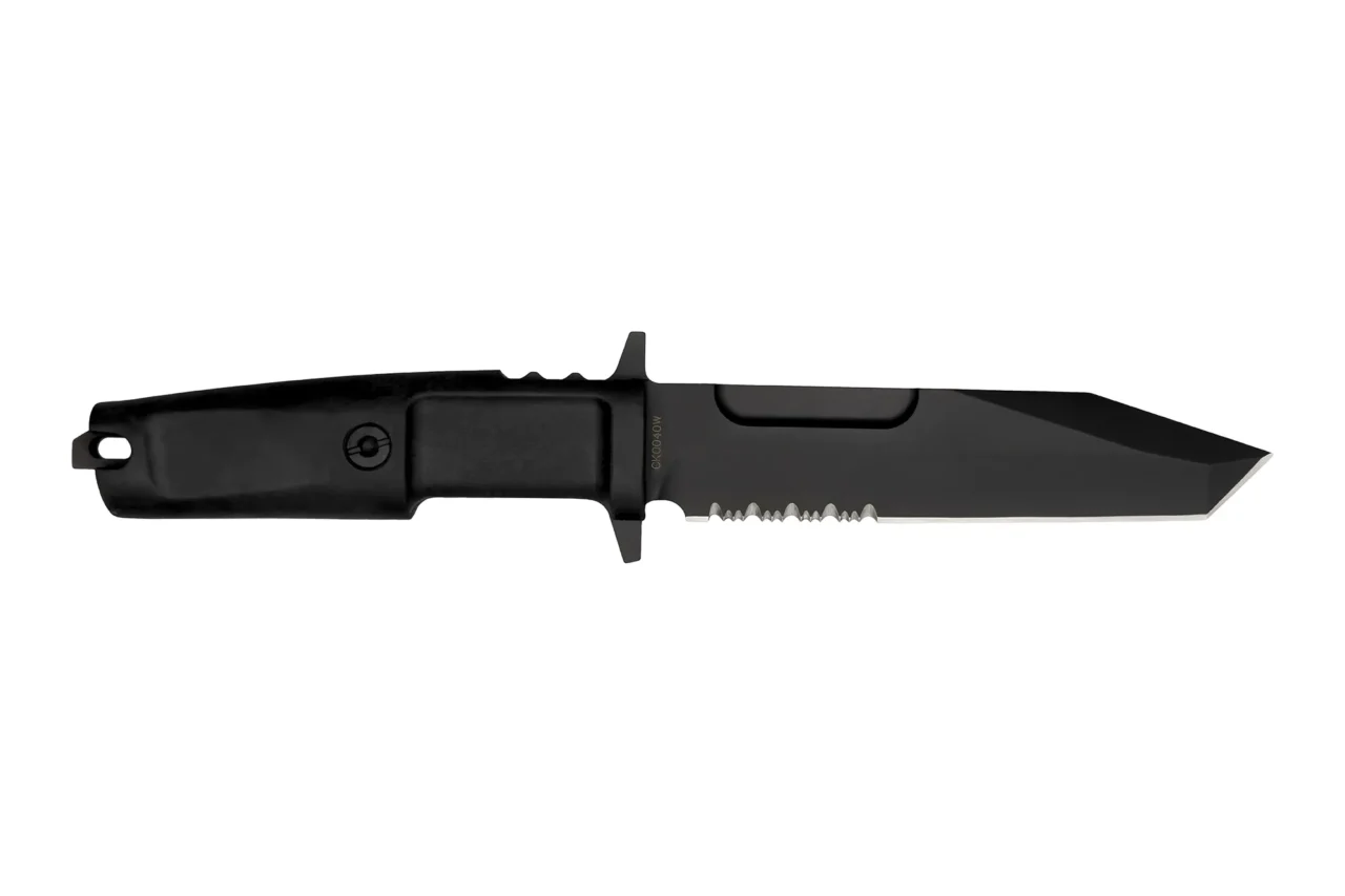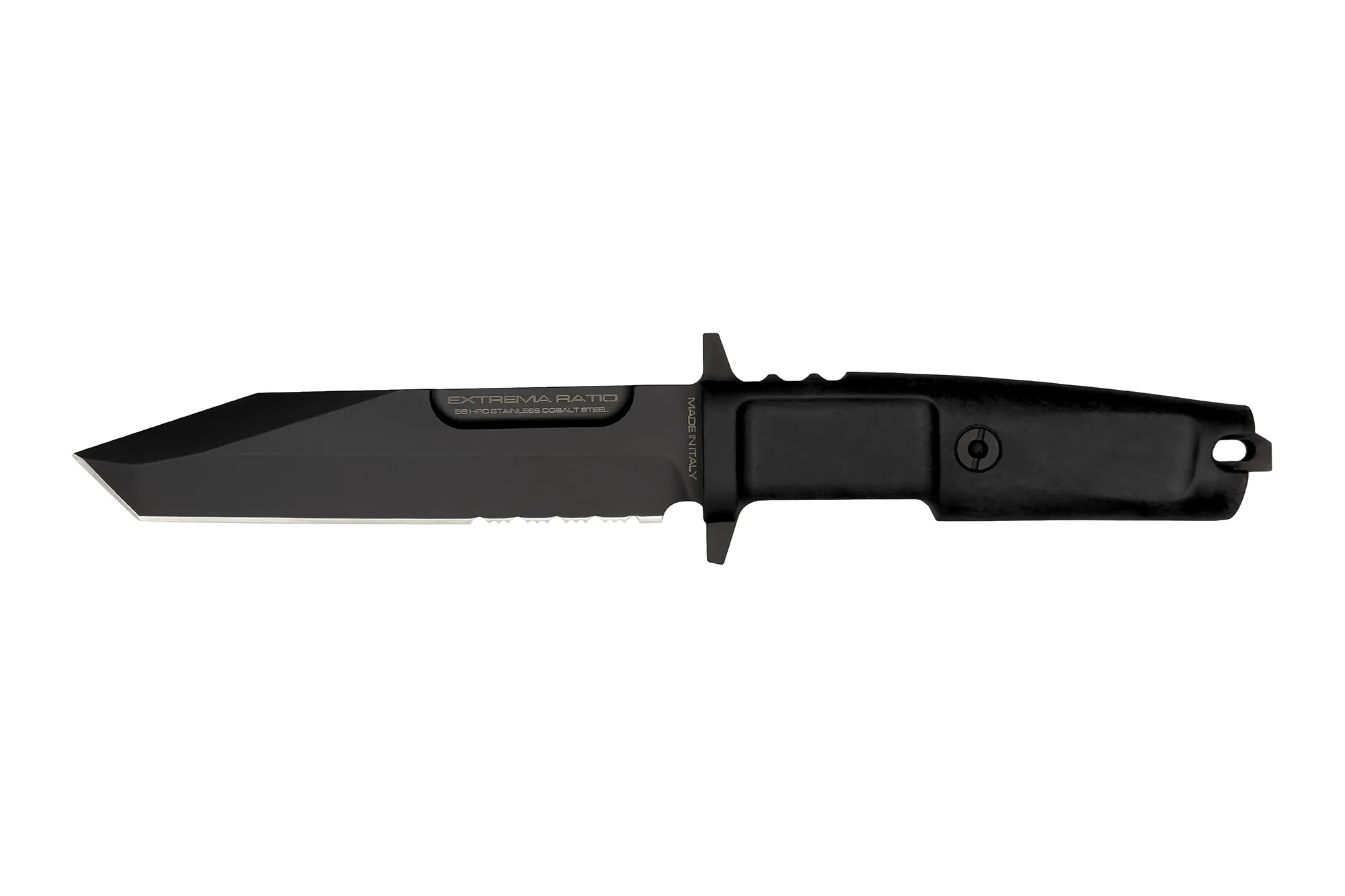 Unlike the other DOBERMANN IVs, the DOBERMANN IV S600 is made of Böhler S600 steel. This material is used for manufacturing metalwork and stamp-creation tools. The high content of molybdenum, tungsten and a good presence of vanadium in its chemical composition provide excellent qualities of hardness, wear resistance and toughness. The presence of cobalt stimulates the growth of small uniformly distributed carbides, which enhance mechanical qualities such as bending capacity. The blade of DOBERMANN IV S600 is hardened and cryogenically treated, thus reaching an exceptional hardness of 64 HRC; this makes it very resistant to wear and gives the edge a lasting sharpening. Böhler S600 has 4.5% of chrome, which makes it oxidizable. For this reason, Extrema Ratio has chosen the new EXP DARK Teflon-based finish.