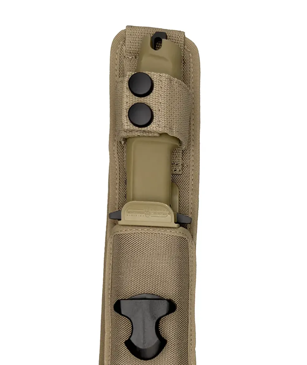 DOBERMANN IV S600 is equipped with a green forprene handle. DOBERMANN IV S600 is equipped with a cordura thigh sheath, also in green colour; it comes with a M.O.L.L.E. fixing system and can be adapted to both left-handed and right-handed people.