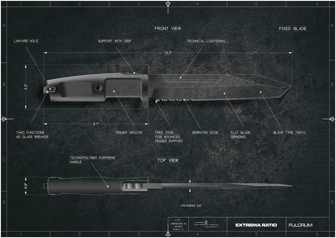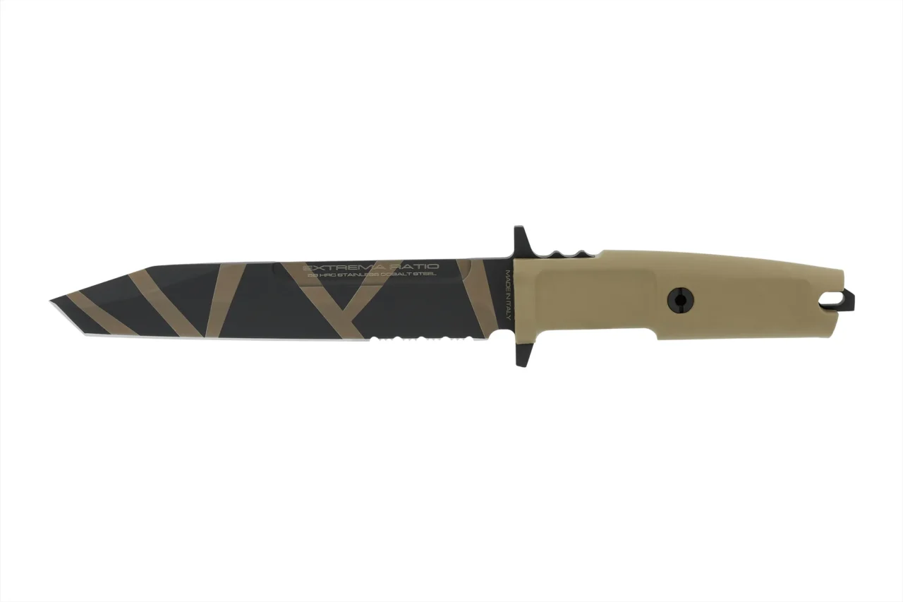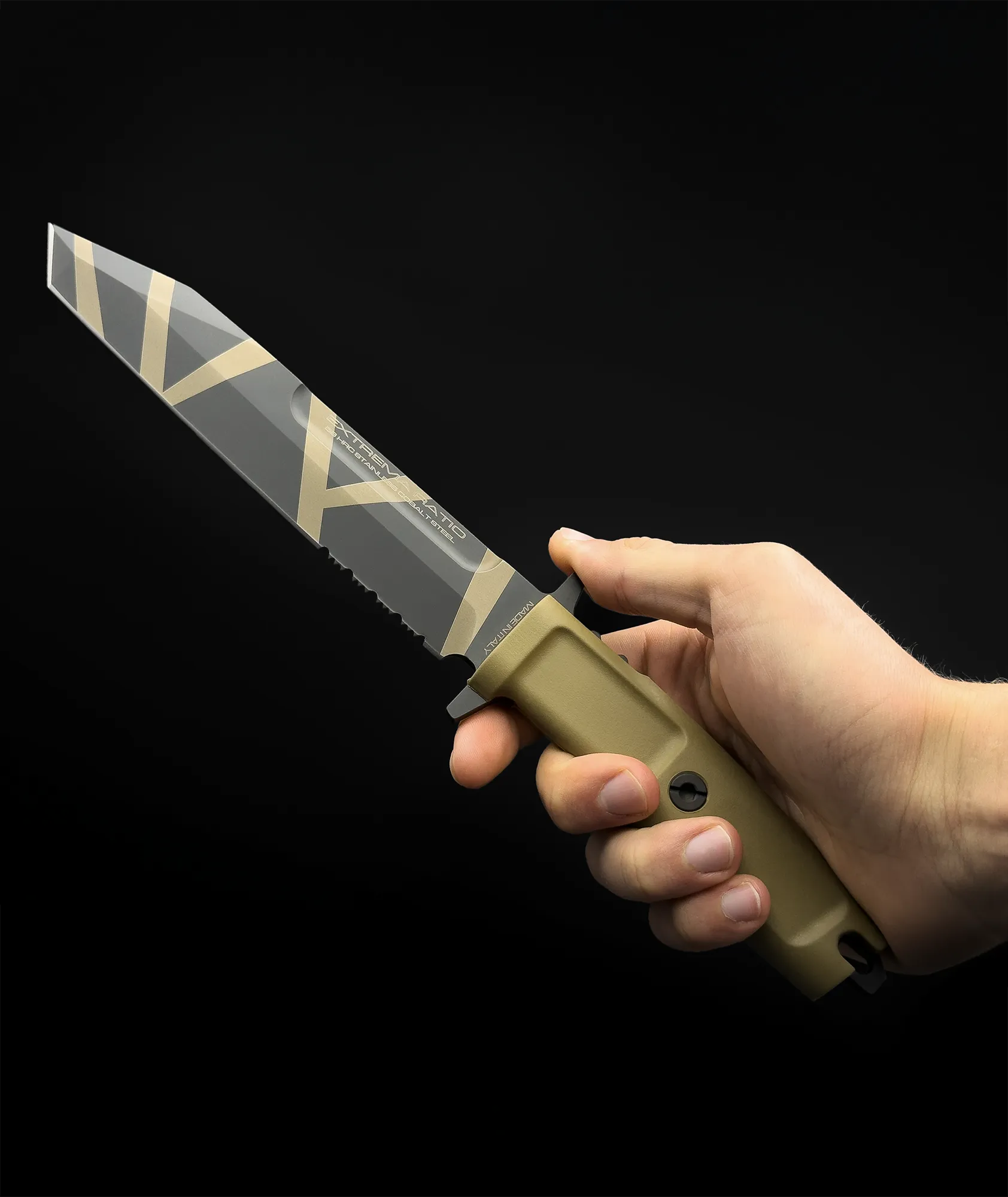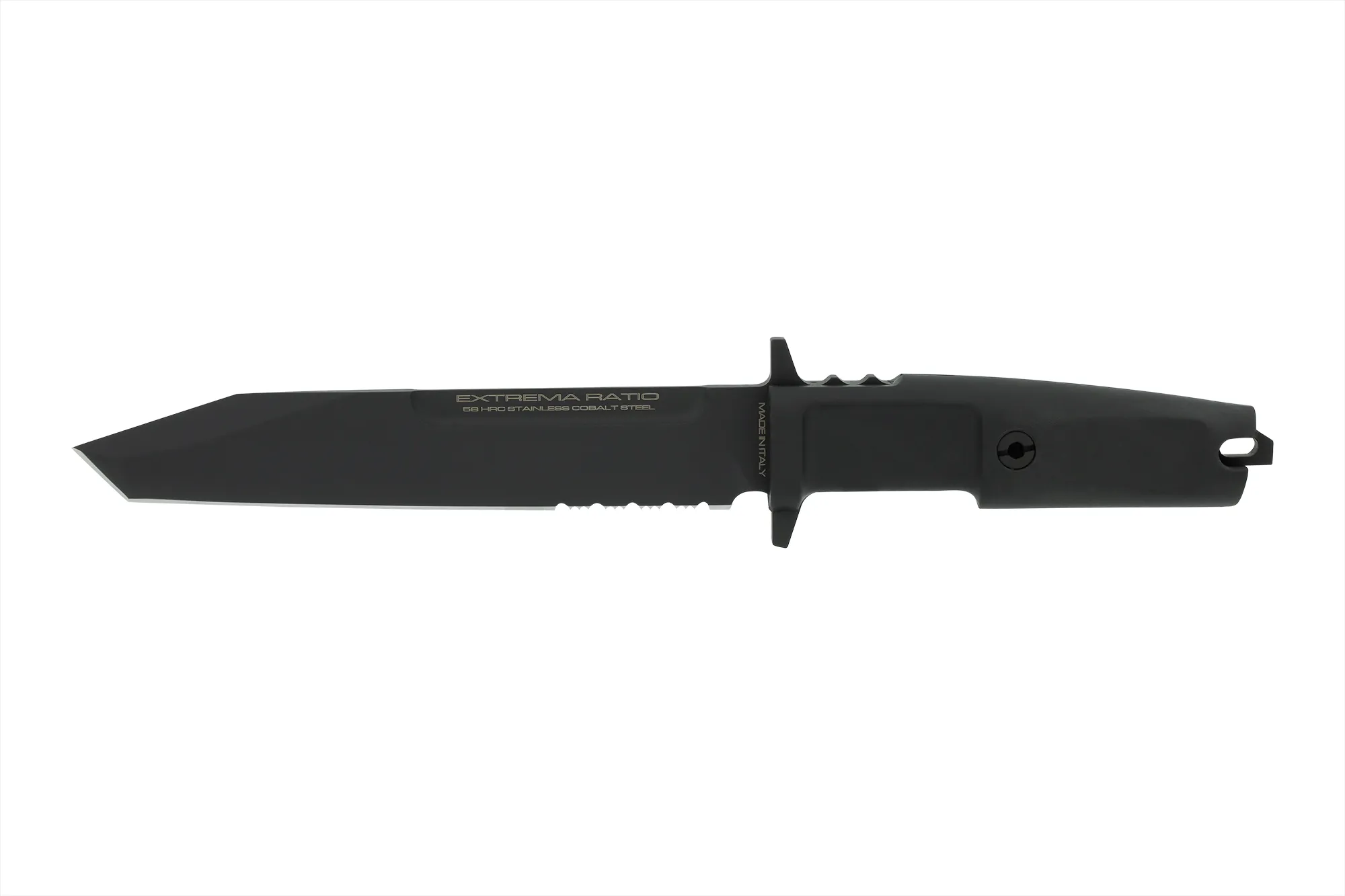 As part of preparing for the mission, COMALP coordinated a team of companies toward creating a full experimental set of newly designed equipment for the individual trooper. Extrema Ratio was chosen by COMALP to develop a new multipurpose knife suitable for the infantry – a knife to be used in any operations anywhere, capable of successfully completing tasks that more specialized tools fail at. So successful were we that after this multipurpose knife followed the development of the Fulcrum Bayonet, an implementation of the same which can be mounted onto a trooper’s standard-issue rifle. An extremely tough and versatile knife, the Fulcrum’s blade can sustain loads of over 150 kilograms without breaking. The tanto-shaped blade allows for large amounts of work and wear while still retaining a sharp, penetrating edge at its exceedingly sturdy tip. Thanks to its weight and top-heavy balancing, the Fulcrum is also suitable for hard work on the field. Available versions: FULCRUM BLACK, FULCRUM DESERT WARFARE.