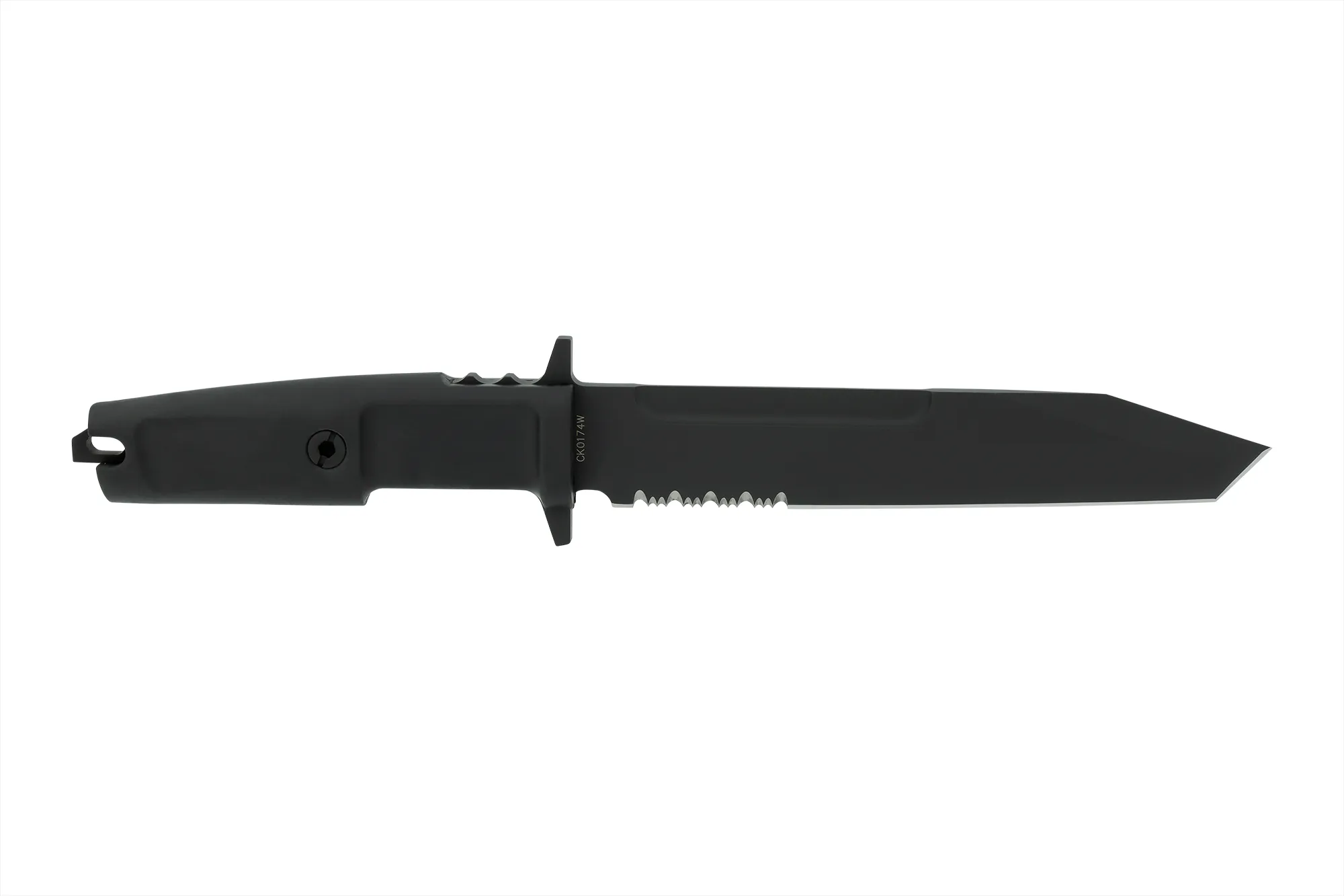 Unlike the other DOBERMANN IVs, the DOBERMANN IV S600 is made of Böhler S600 steel. This material is used for manufacturing metalwork and stamp-creation tools. The high content of molybdenum, tungsten and a good presence of vanadium in its chemical composition provide excellent qualities of hardness, wear resistance and toughness. The presence of cobalt stimulates the growth of small uniformly distributed carbides, which enhance mechanical qualities such as bending capacity. The blade of DOBERMANN IV S600 is hardened and cryogenically treated, thus reaching an exceptional hardness of 64 HRC; this makes it very resistant to wear and gives the edge a lasting sharpening. Böhler S600 has 4.5% of chrome, which makes it oxidizable. For this reason, Extrema Ratio has chosen the new EXP DARK Teflon-based finish.