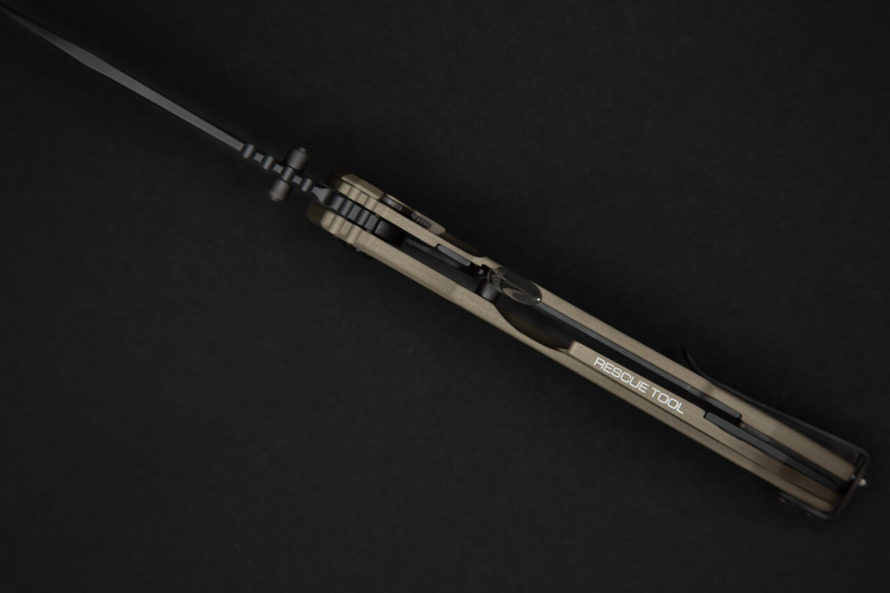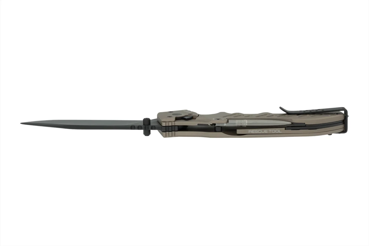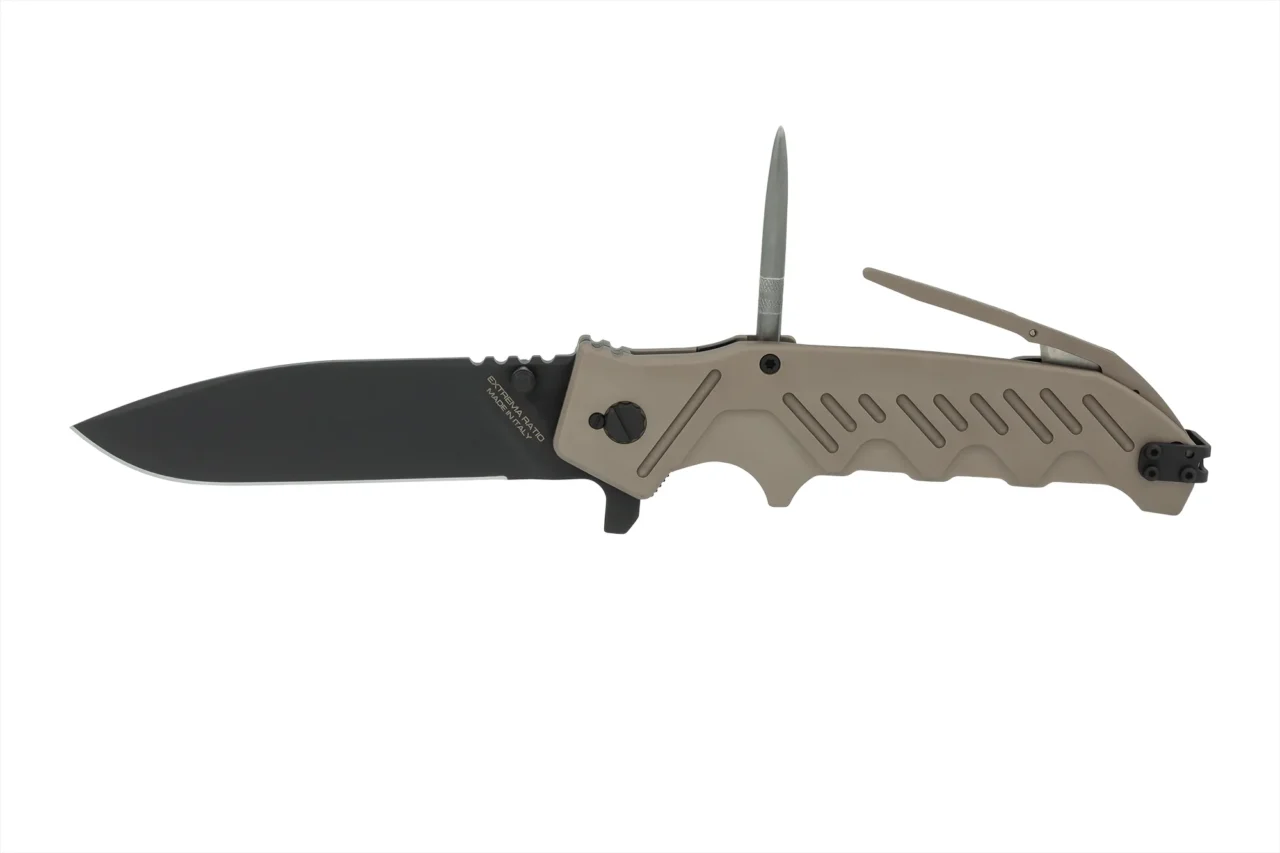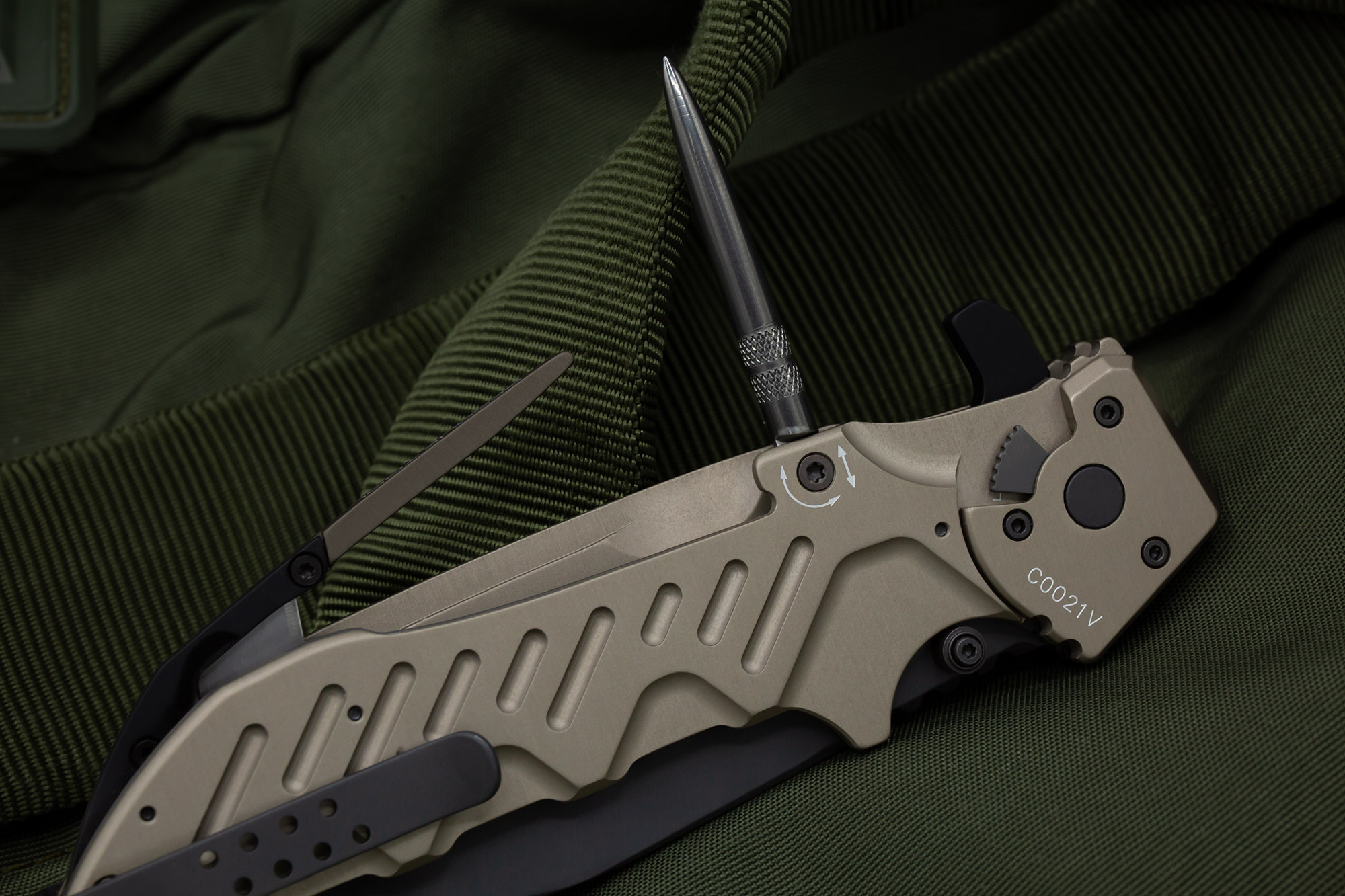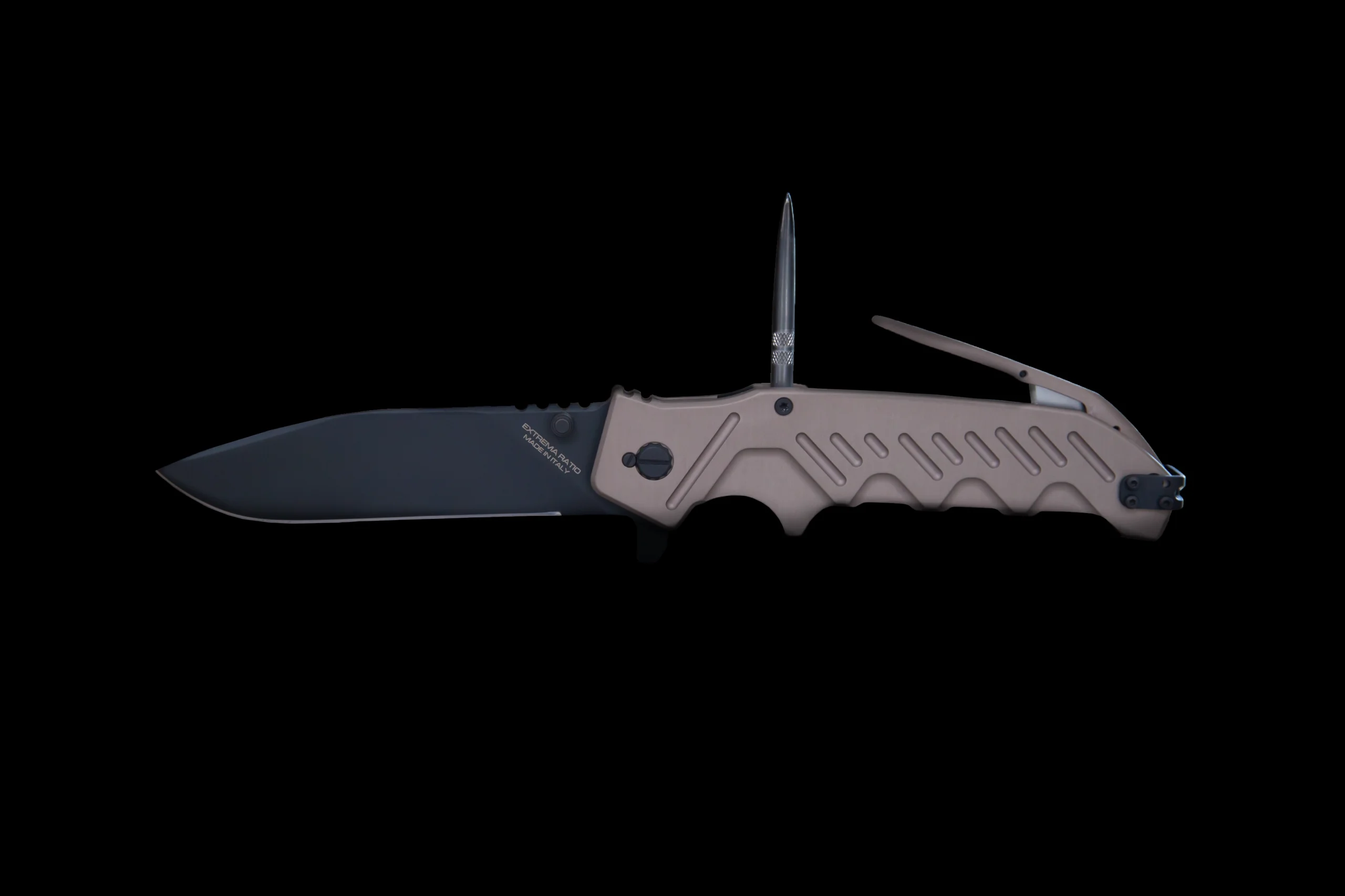 Features characteristics that were specifically designed for the renowned GSG9, special unit of the Bundespolizei, which has officially adopted it. The handle is made of anodized anticorodal aluminum in tactical mud colour. It is equipped with a tungsten carbide glass-breaker on the pommel and a clip that can be set in two different positions (one of which is frontal). On the back there is a stainless-steel marlin spike, which can be locked when open, and a foldable rescue tool which allows the operator to make a quick emergency cut to free any injured from their clothing. This second tool is also excellent as a belt cutter.