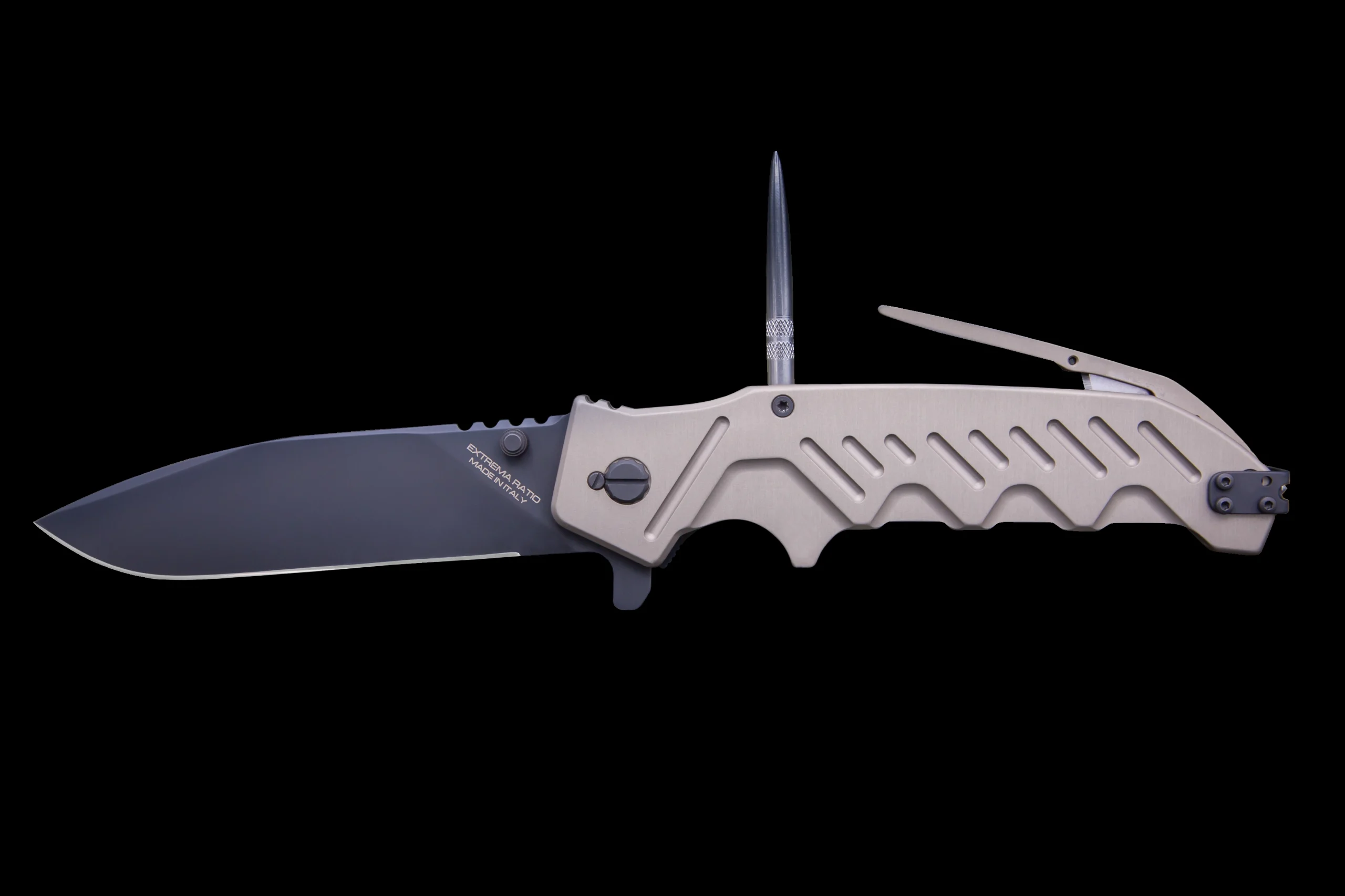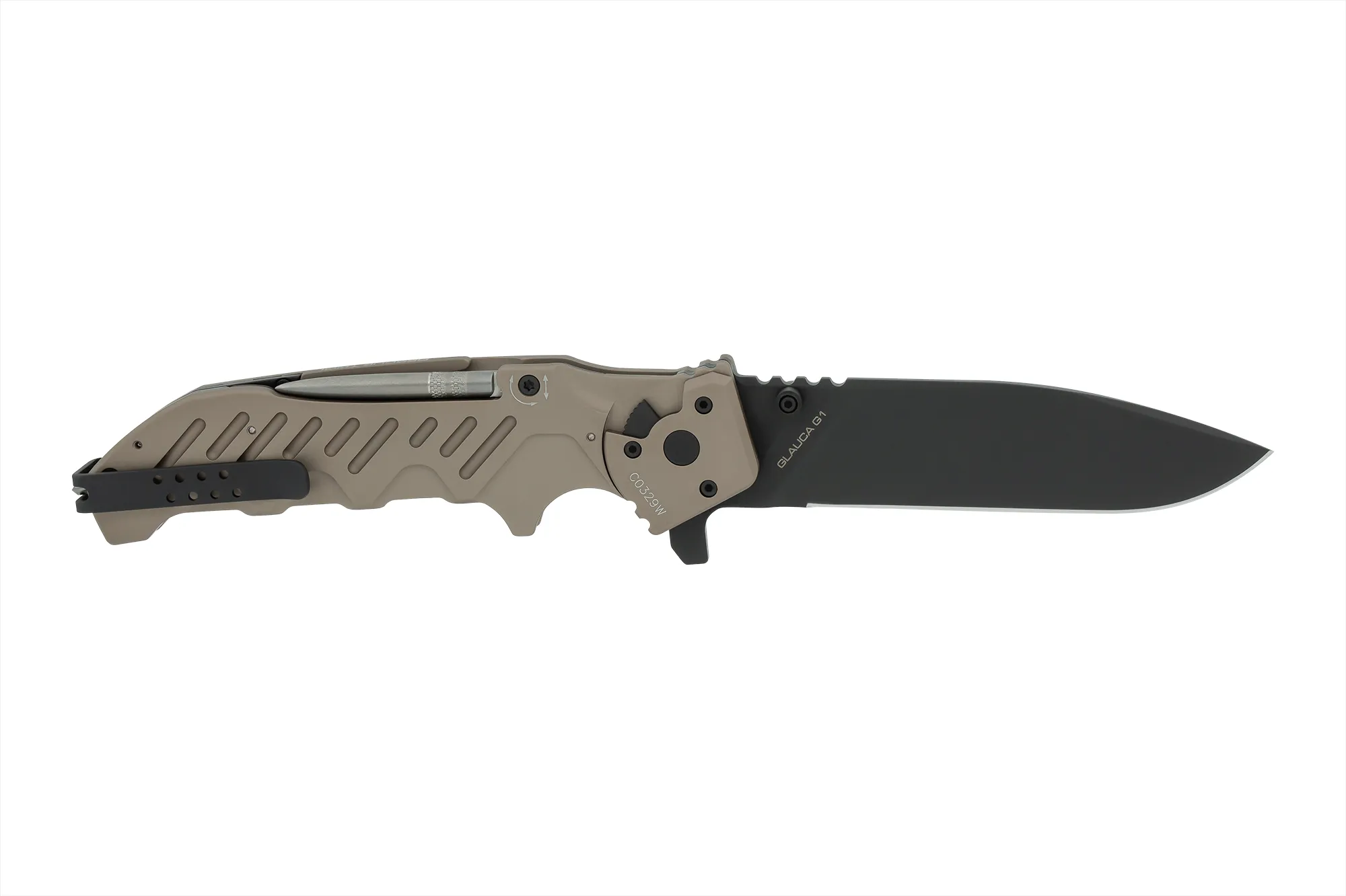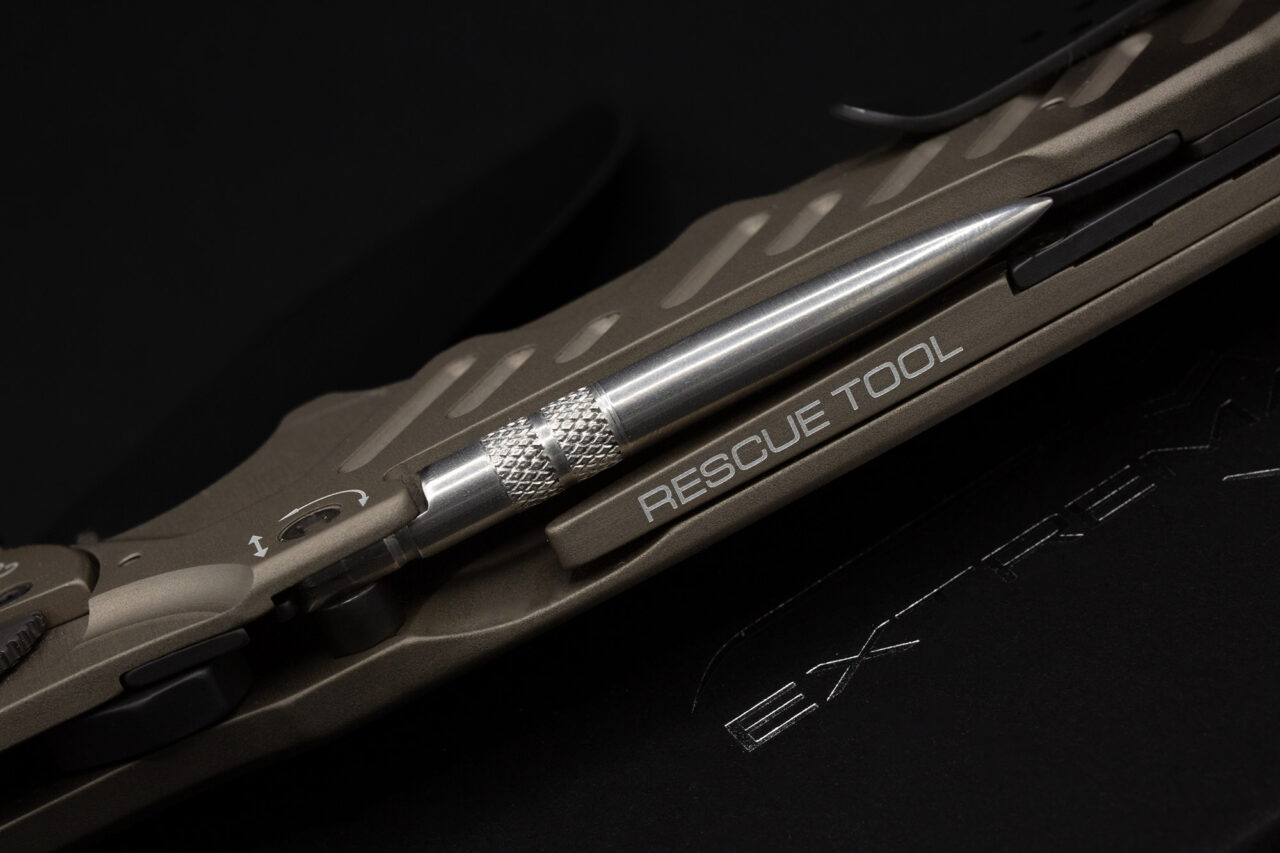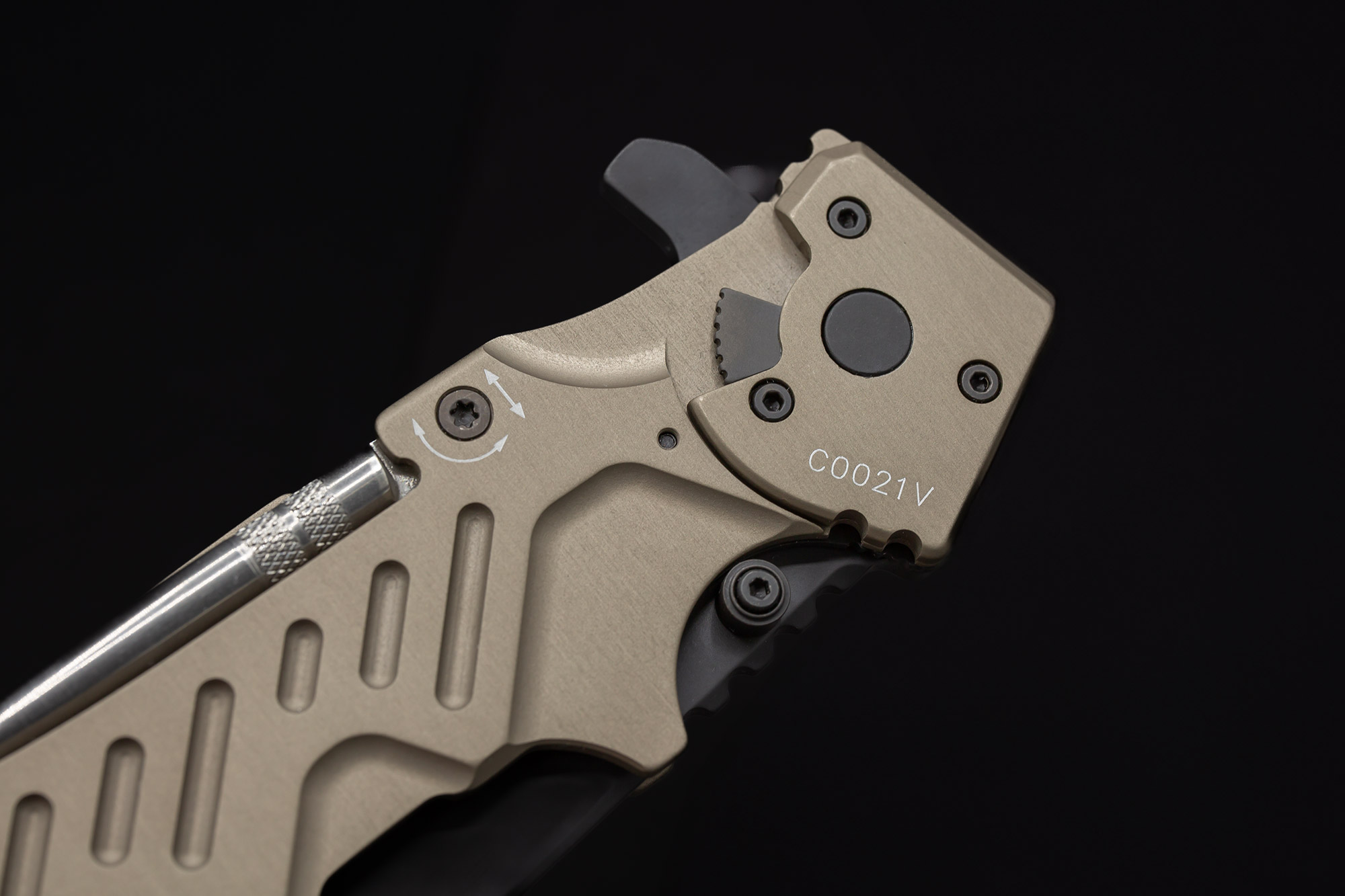 Features characteristics that were specifically designed for the renowned GSG9, special unit of the Bundespolizei, which has officially adopted it. The handle is made of anodized anticorodal aluminum in tactical mud colour. It is equipped with a tungsten carbide glass-breaker on the pommel and a clip that can be set in two different positions (one of which is frontal). On the back there is a stainless-steel marlin spike, which can be locked when open, and a foldable rescue tool which allows the operator to make a quick emergency cut to free any injured from their clothing. This second tool is also excellent as a belt cutter.