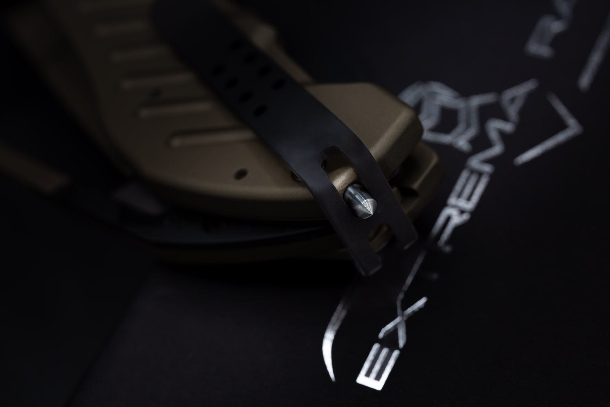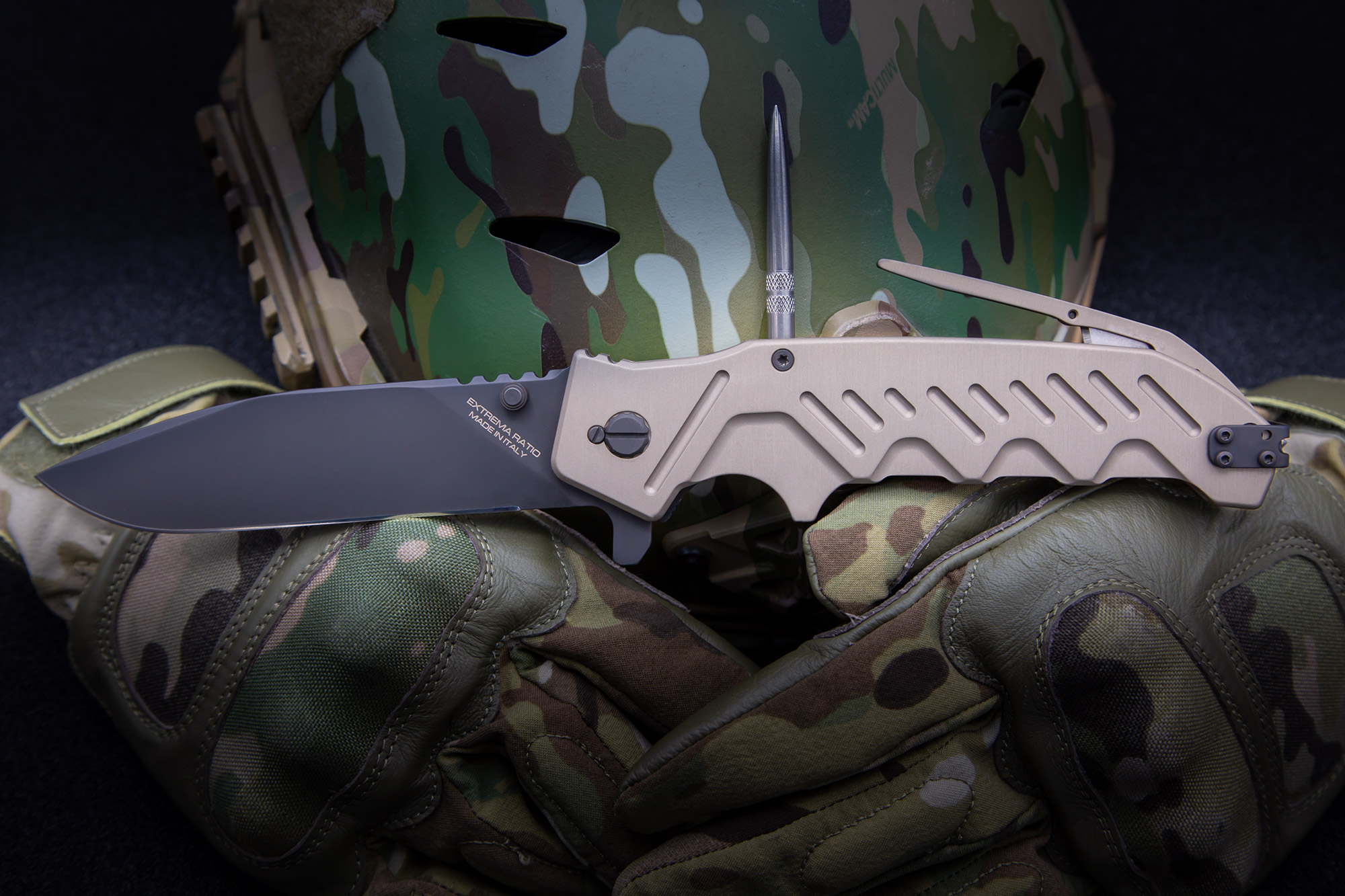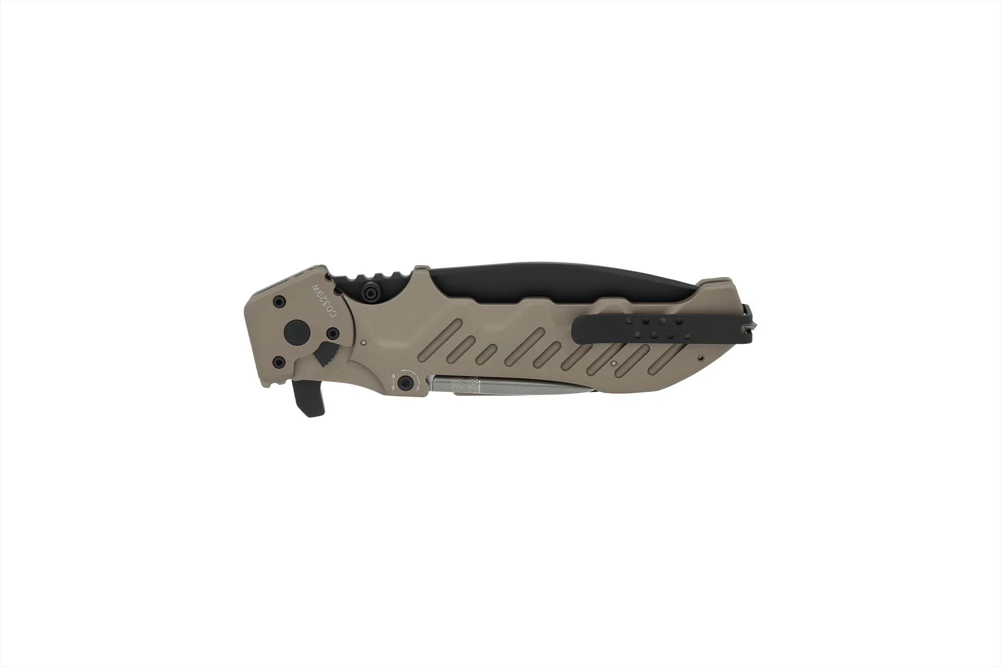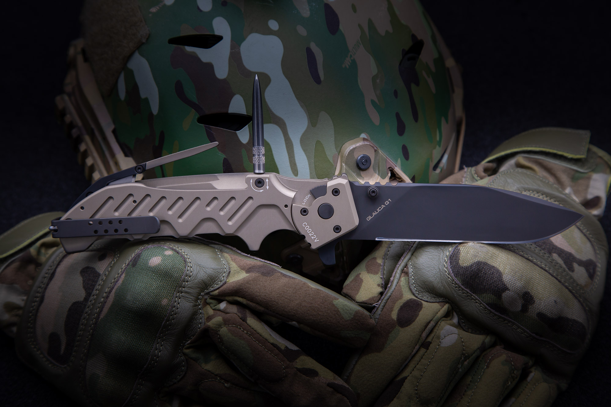Features characteristics that were specifically designed for the renowned GSG9, special unit of the Bundespolizei, which has officially adopted it. The handle is made of anodized anticorodal aluminum in tactical mud colour. It is equipped with a tungsten carbide glass-breaker on the pommel and a clip that can be set in two different positions (one of which is frontal). On the back there is a stainless-steel marlin spike, which can be locked when open, and a foldable rescue tool which allows the operator to make a quick emergency cut to free any injured from their clothing. This second tool is also excellent as a belt cutter.
