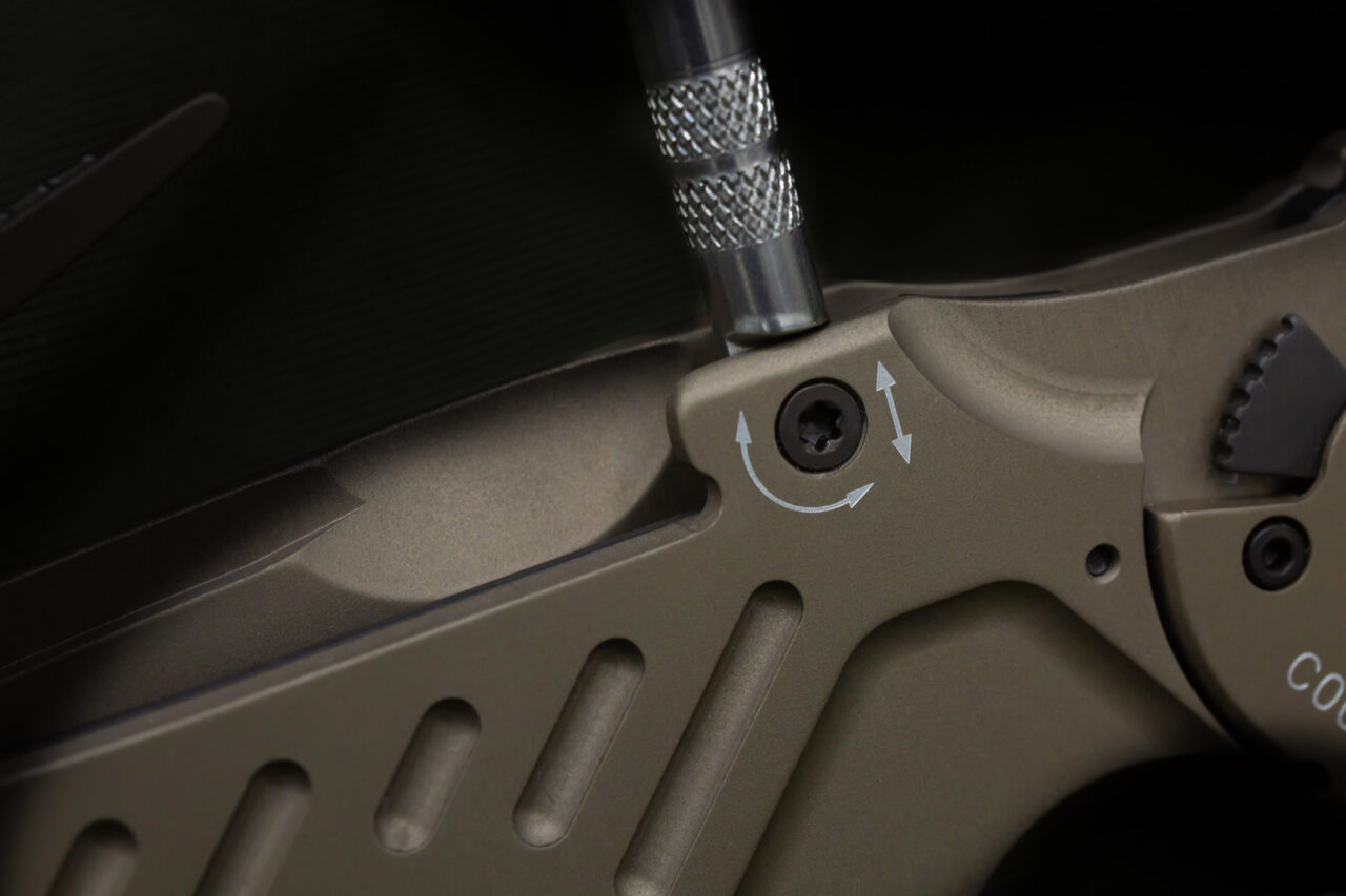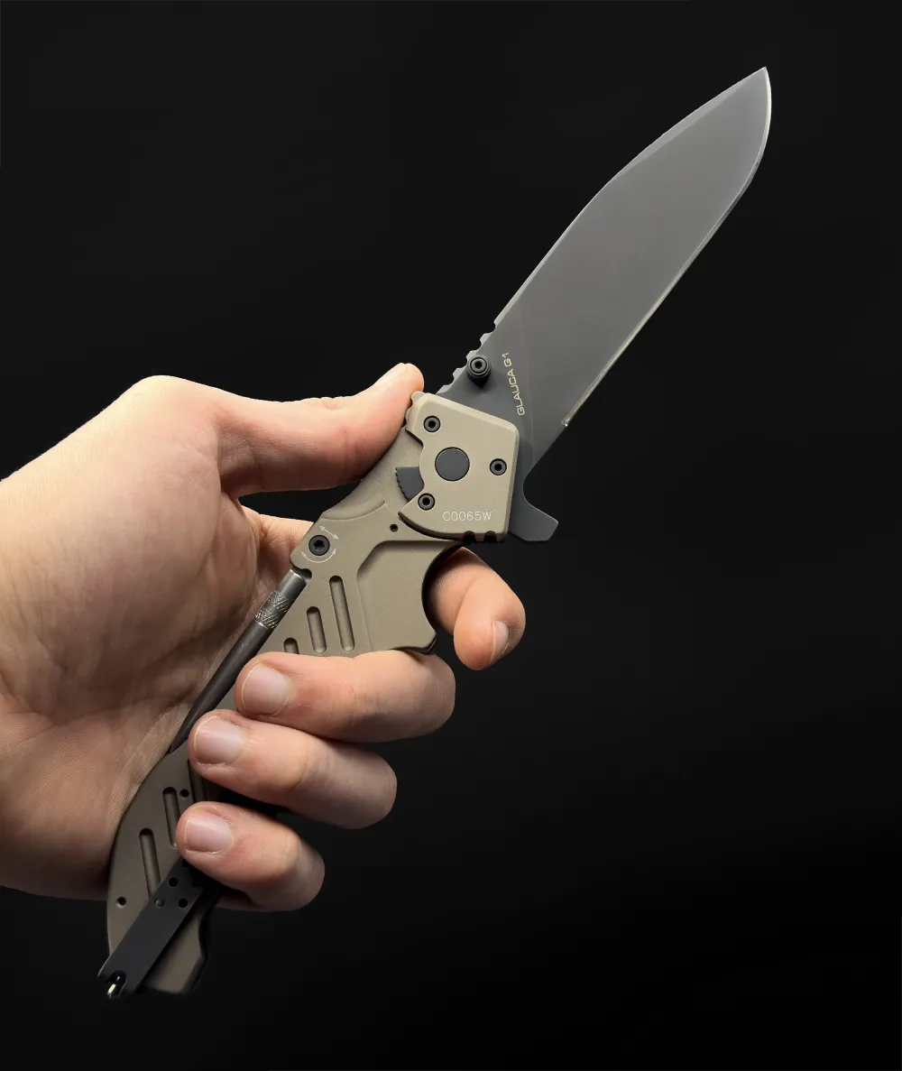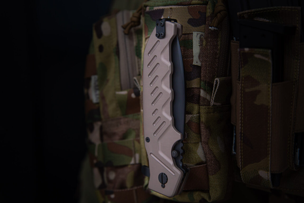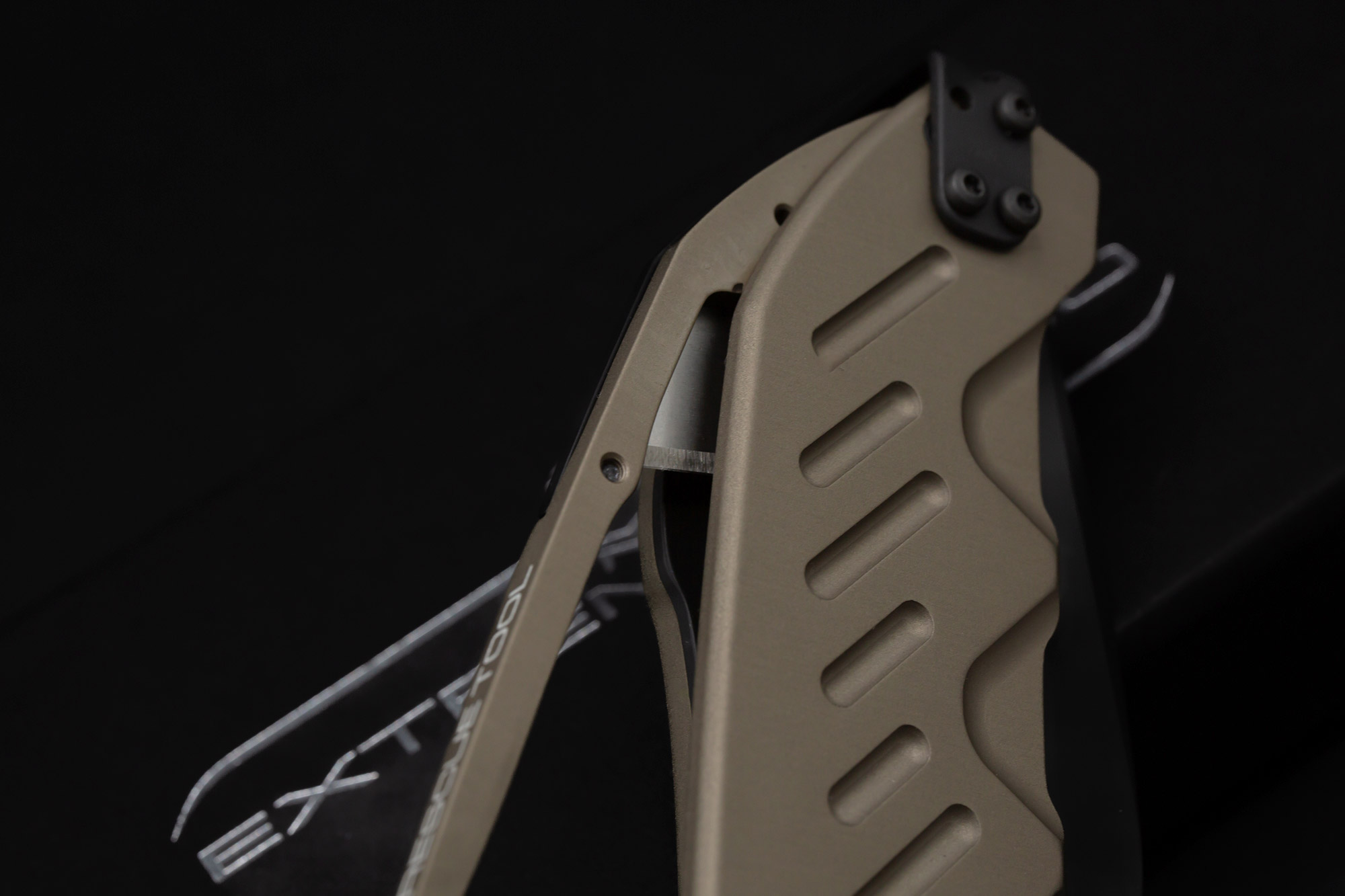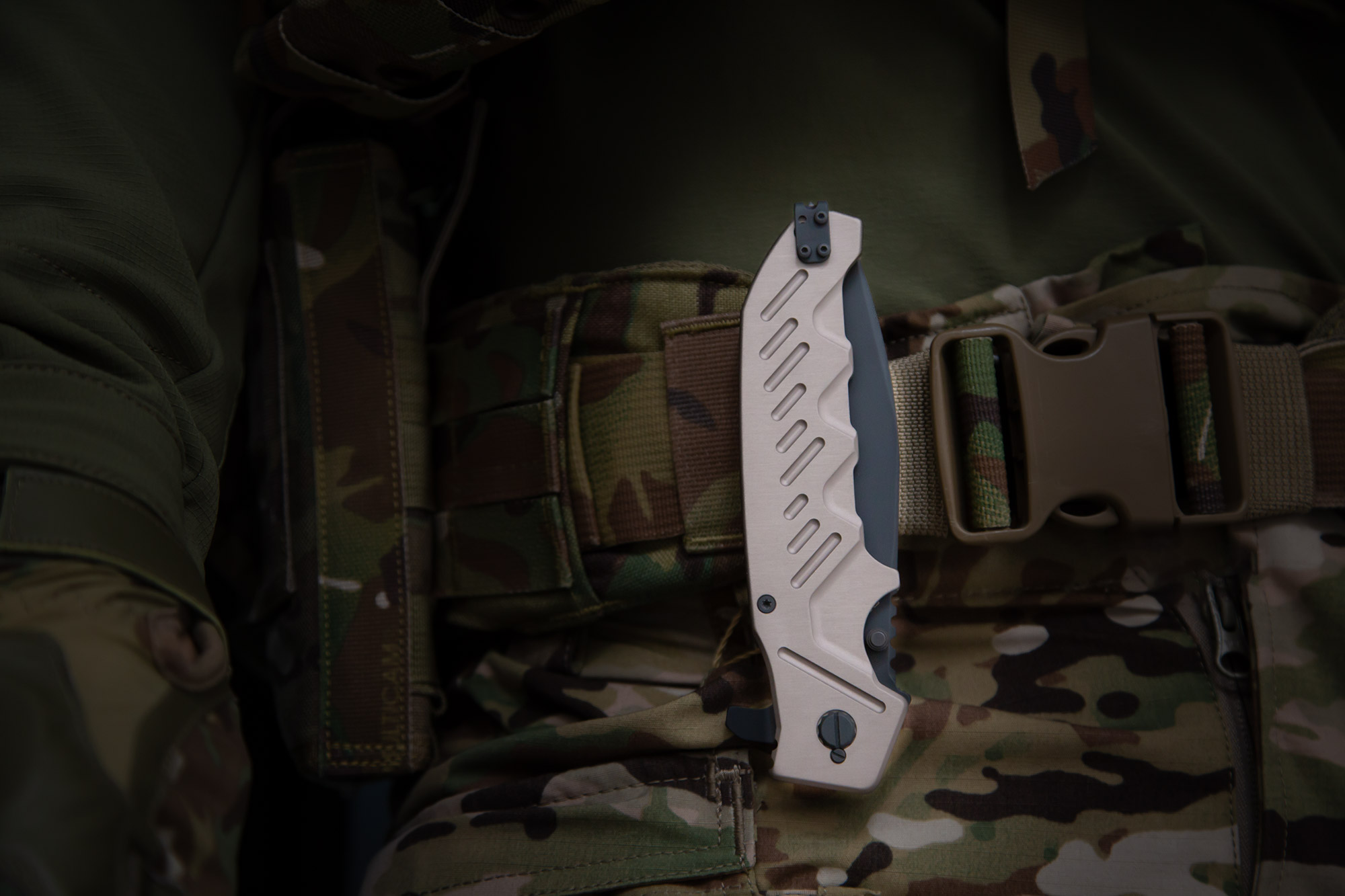 Features characteristics that were specifically designed for the renowned GSG9, special unit of the Bundespolizei, which has officially adopted it. The handle is made of anodized anticorodal aluminum in tactical mud colour. It is equipped with a tungsten carbide glass-breaker on the pommel and a clip that can be set in two different positions (one of which is frontal). On the back there is a stainless-steel marlin spike, which can be locked when open, and a foldable rescue tool which allows the operator to make a quick emergency cut to free any injured from their clothing. This second tool is also excellent as a belt cutter.