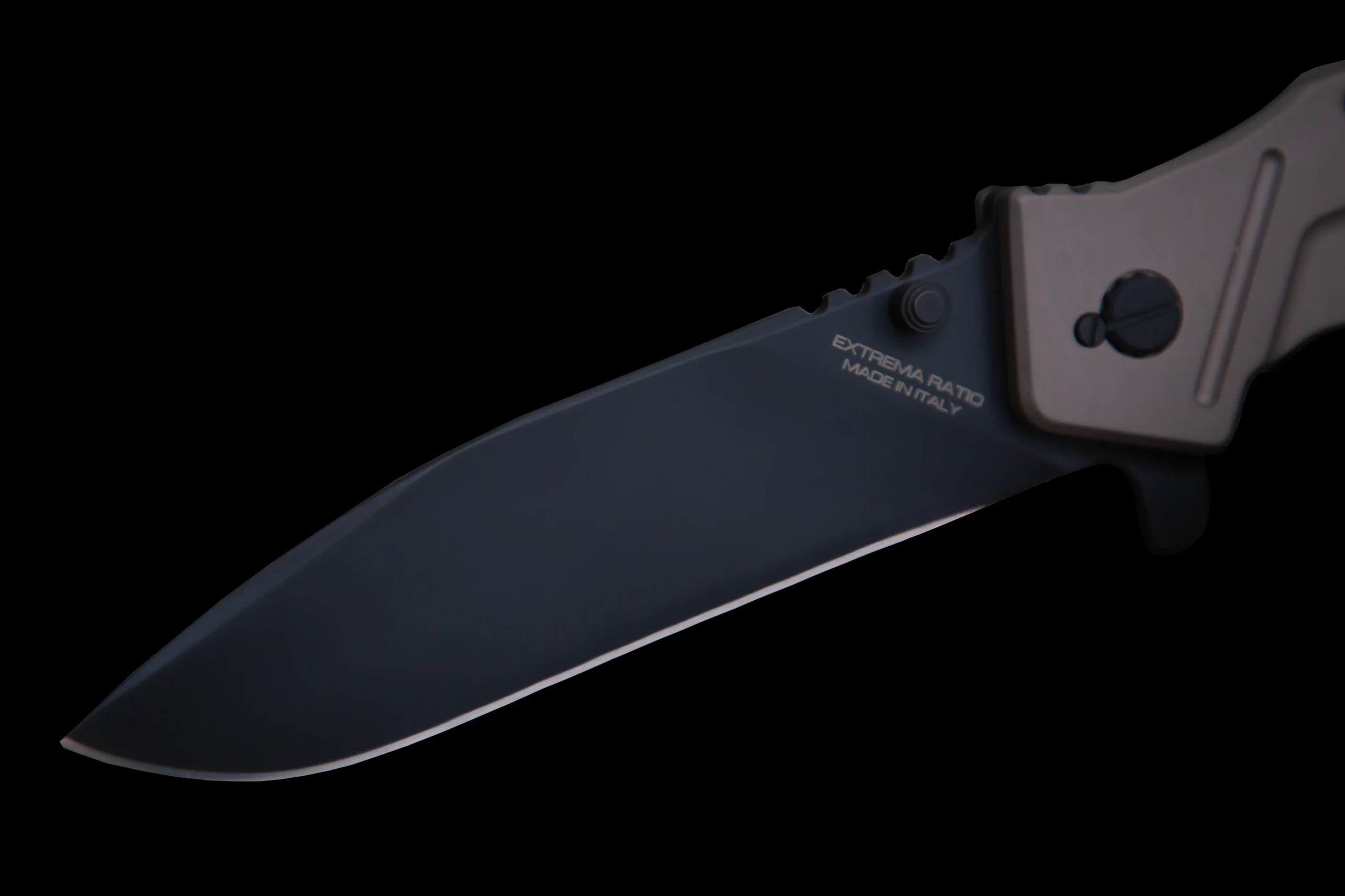 The blade locking system is the time-tested LINER-LOCK supported by a manually operated second safety mechanism. The drop point blade is made of Böhler N690 steel hardened to 58 HRC with the classic Extrema Ratio MIL-C-13924 black finish.