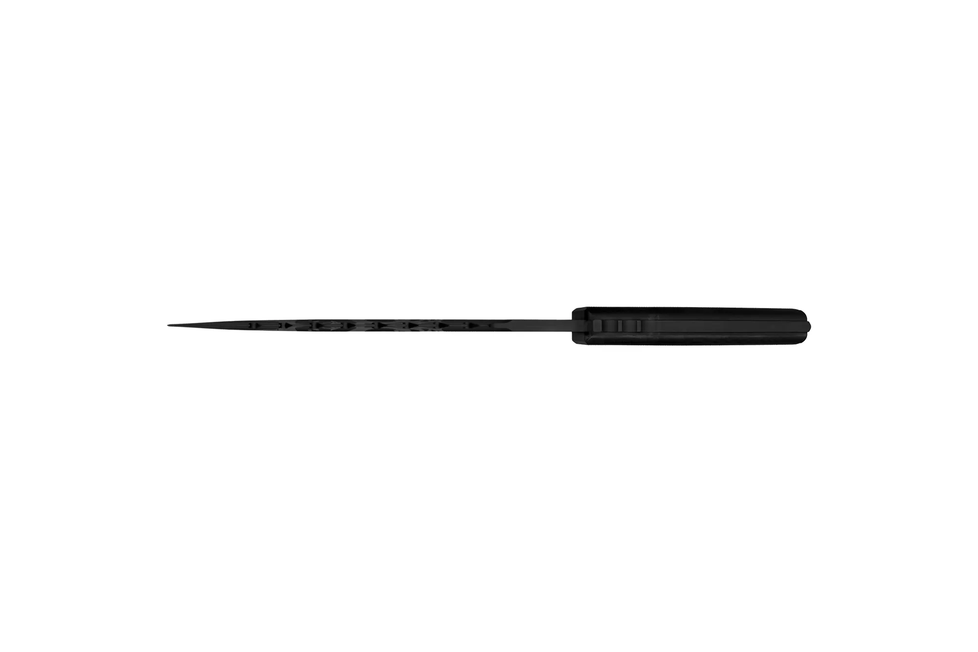 The blade in Böhler N690 steel, 6.3 mm thick, retains the iconic modified spear-point, but is optimized with a tapered profile that: