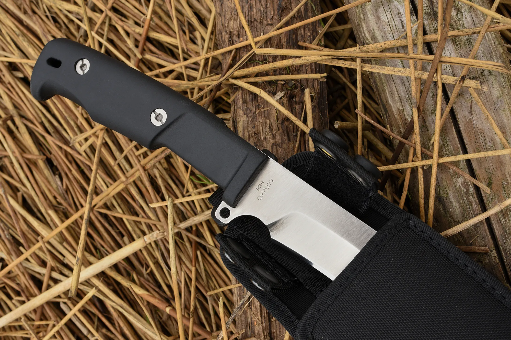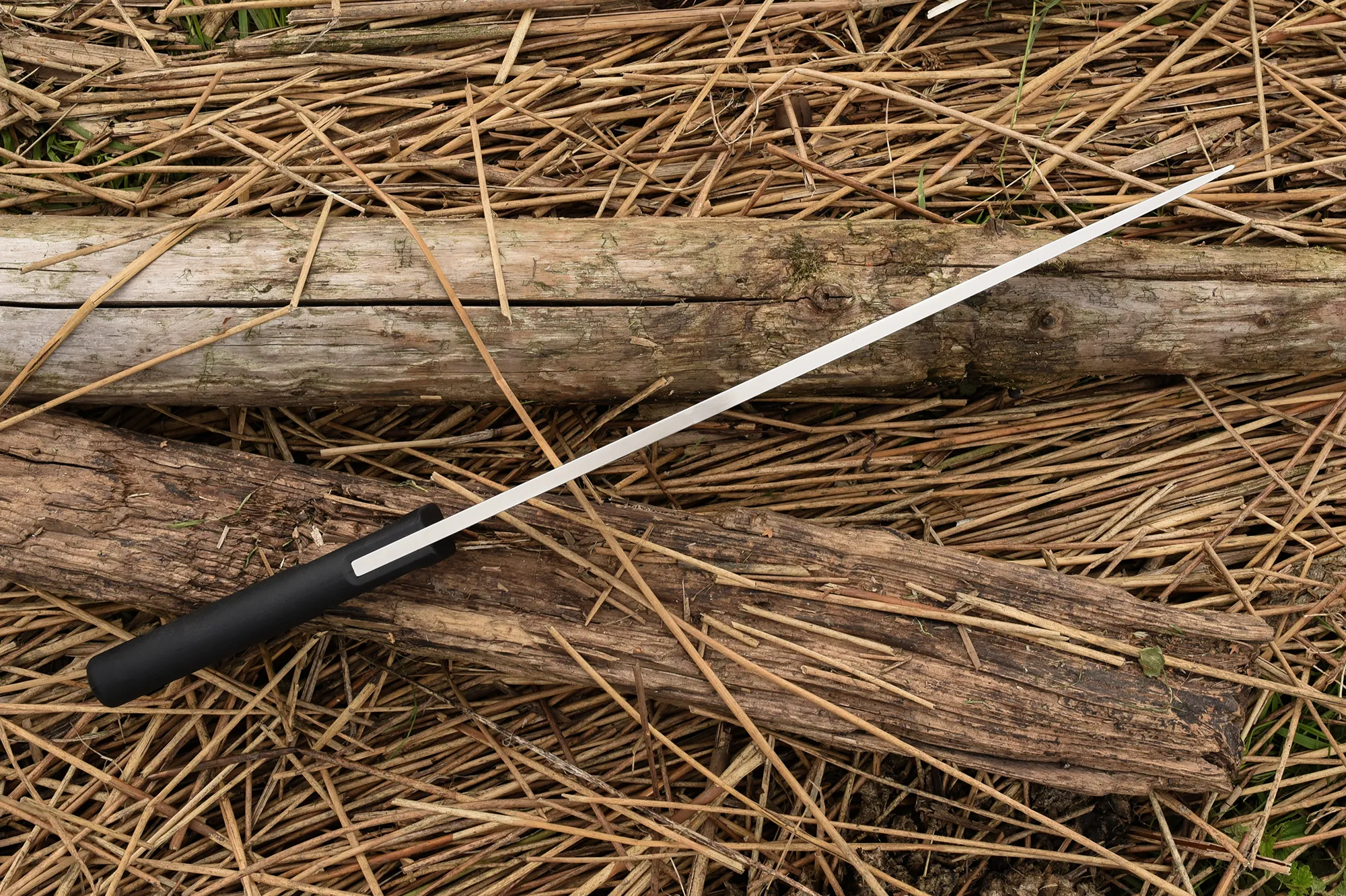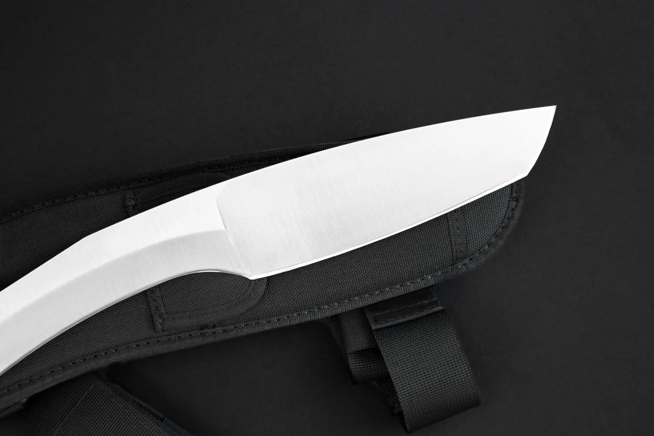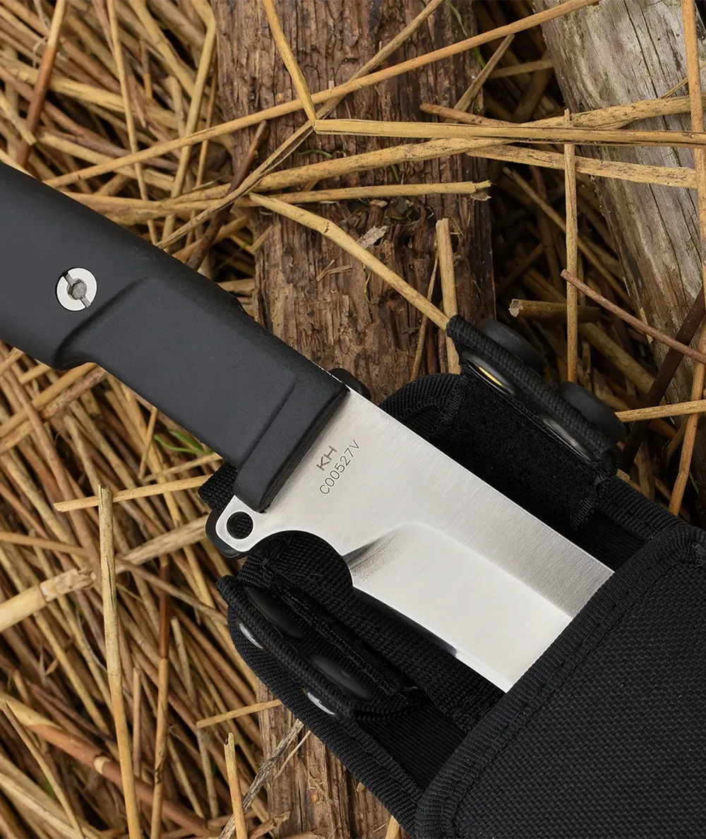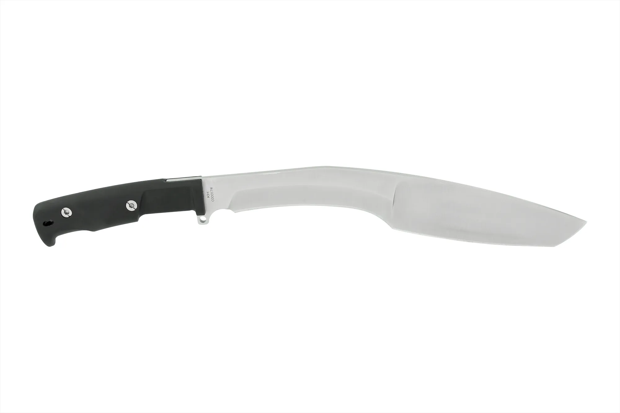 The tip portion of the blade is instead flat ground, well-angled to effortlessly penetrate wood and vegetation. While similar tools are usually made from softer steel alloys for elasticity and ease of honing, we were able to achieve adequate elasticity using hard BÖHLER N690 steel, making for a remarkably durable edge.