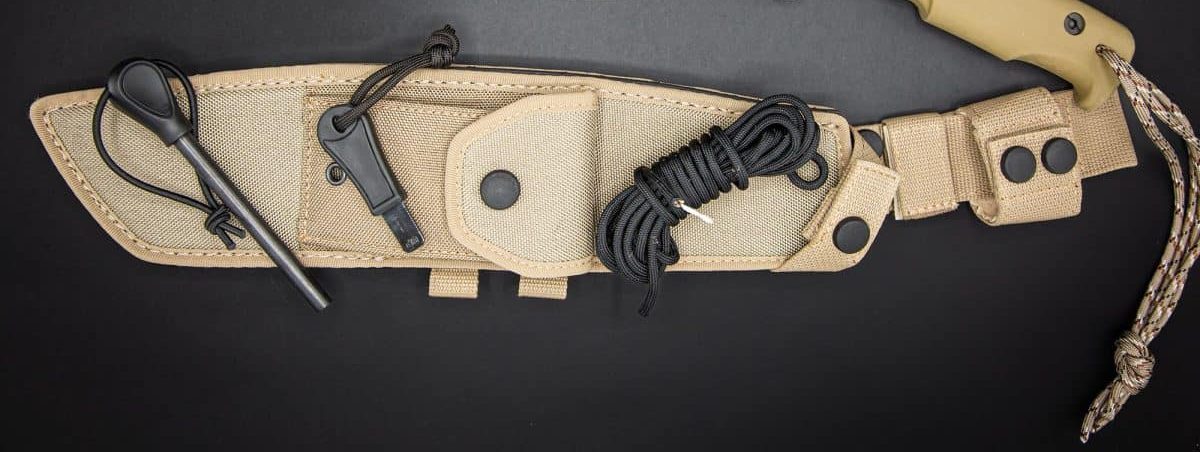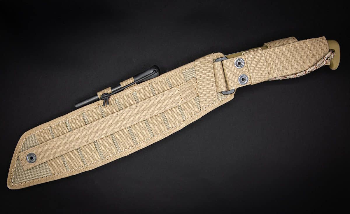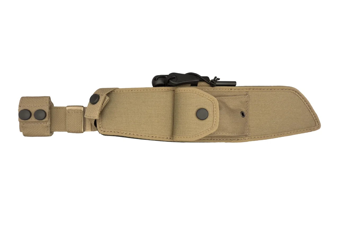 Desert cordura sheath with MOLLE system, a safety carry shoulder belt, a mini pouch containing a paracord with flammable filament, which can be used in case of emergency and/or difficult climatic conditions, and a Firesteel for lighting fires.