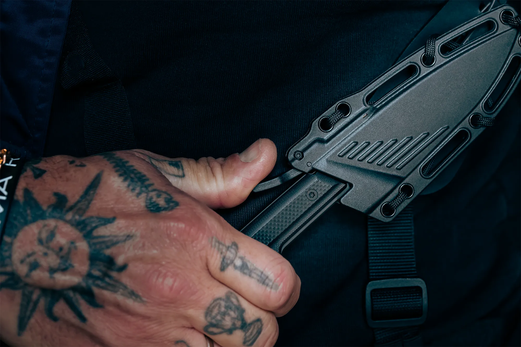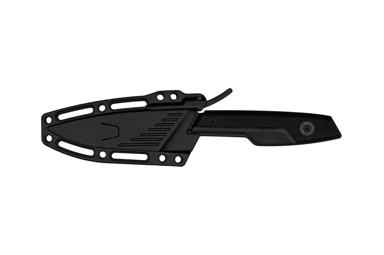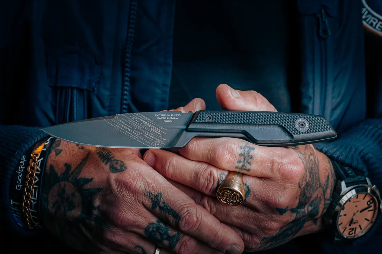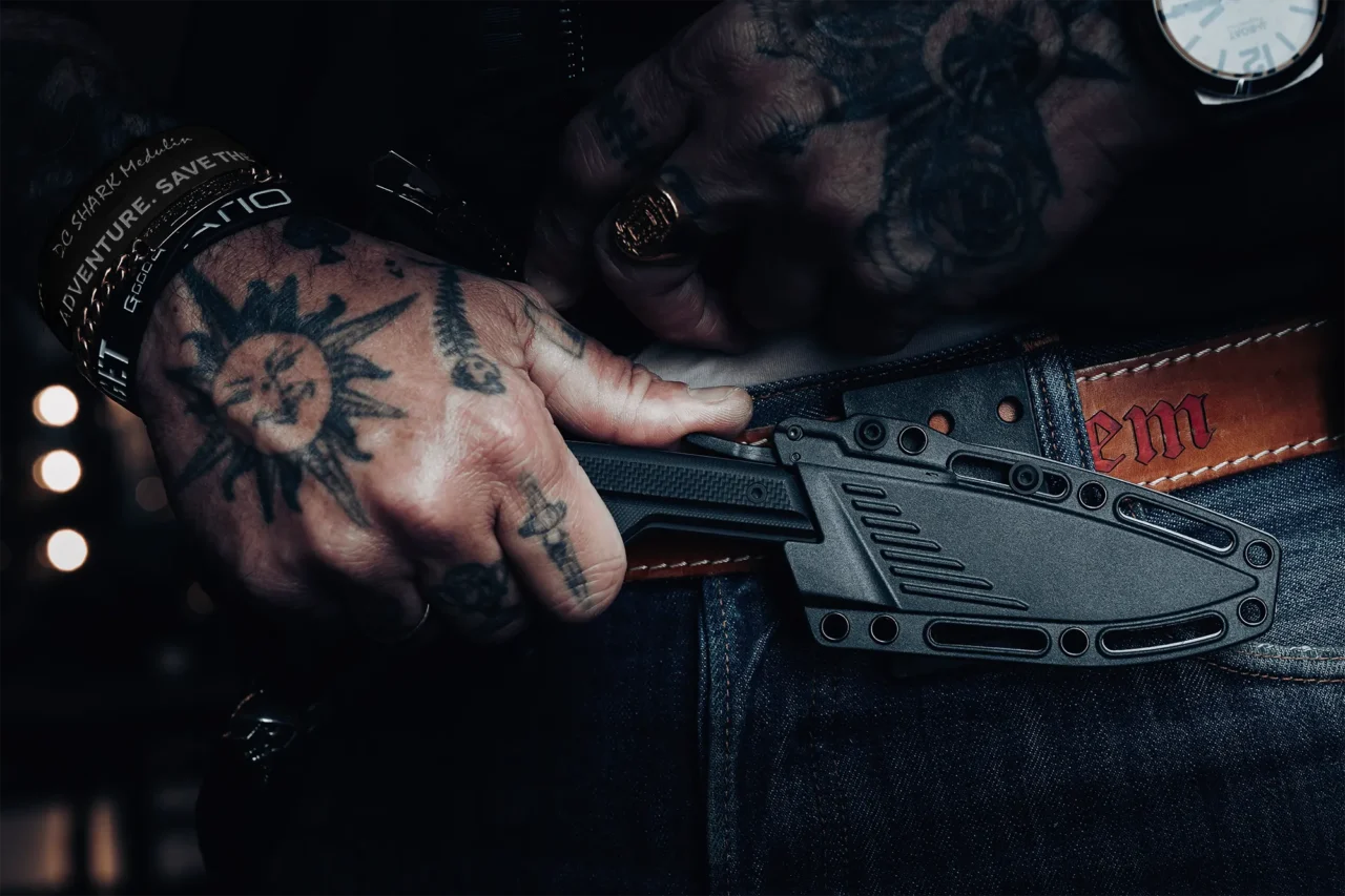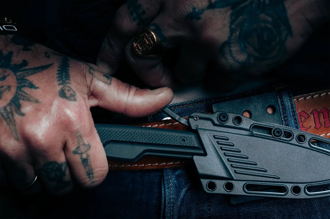 The reverse guard protects the hand during impact, preventing it from sliding toward the blade, even during powerful strikes. The retention system locks the blade into the sheath and requires a deliberate movement to release it; this prevents accidental draws and makes it extremely difficult to seize during close contact