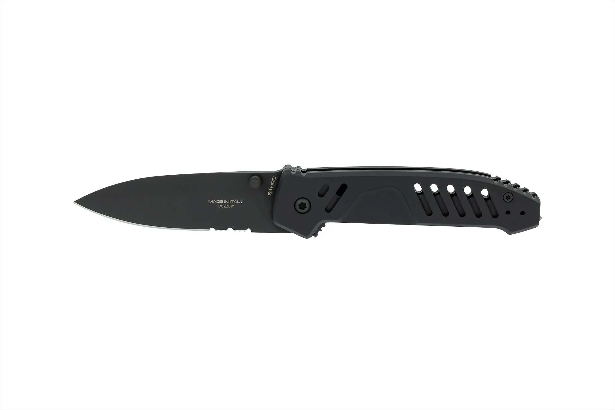 - MF1 EVO D BLACK: with black handle and burnished Böhler N690 steel (58HRC) drop blade