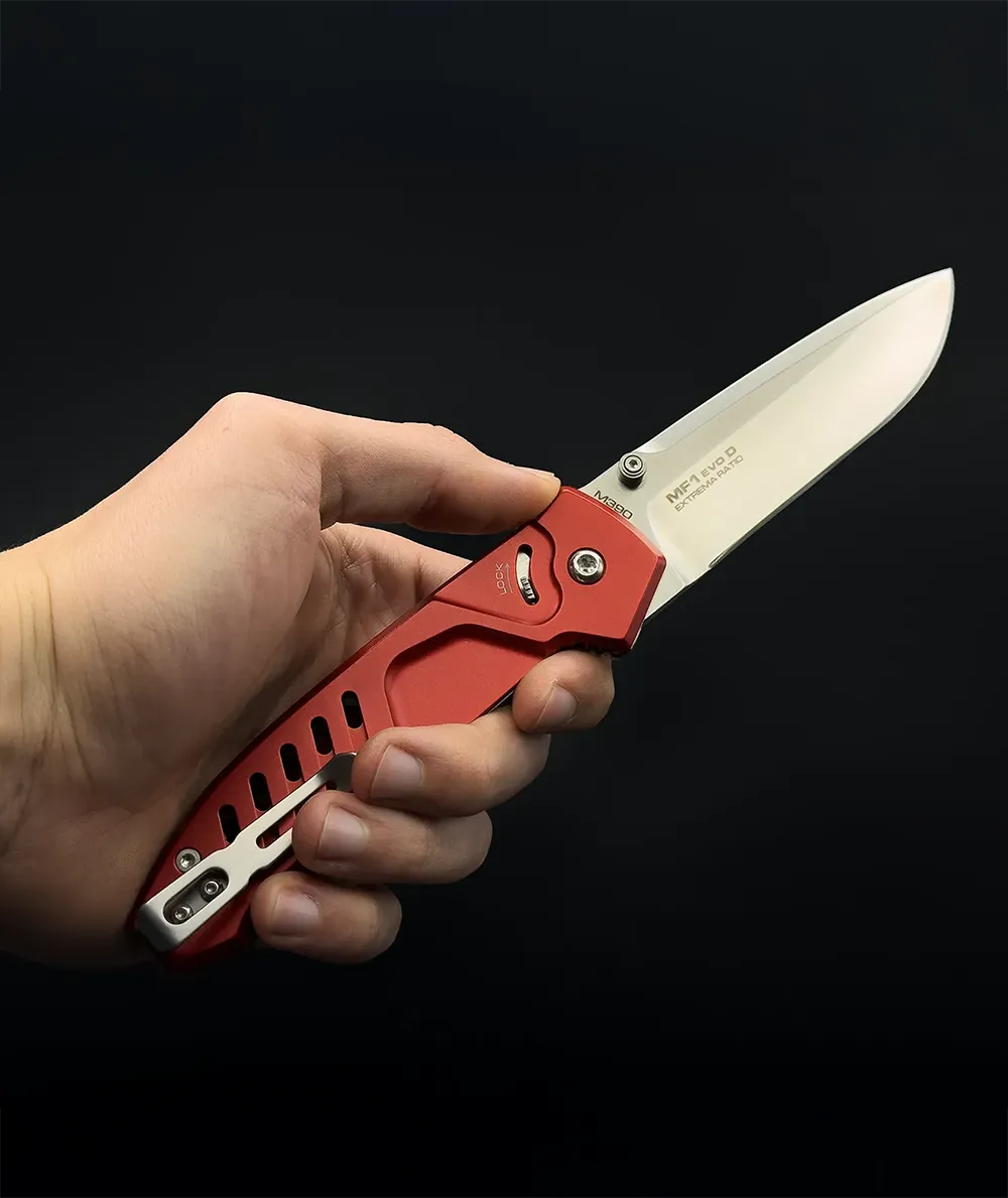 - MF1 EVO D RED SATIN M390: with red handle and Böhler M390 steel (61 HRC) satin drop blade