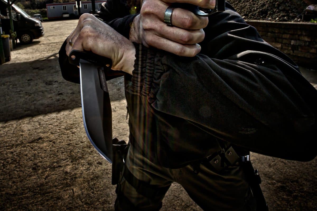 Minor additions include safety-cord holes in the tang and pole-mounting holes on the front guard. Our usual Extrema Ratio “side groove” replaced the traditional blood-groove fuller for improved looks and reduced weight. Includes a standard thigh sheath with automatic retention mechanism and protective flap.