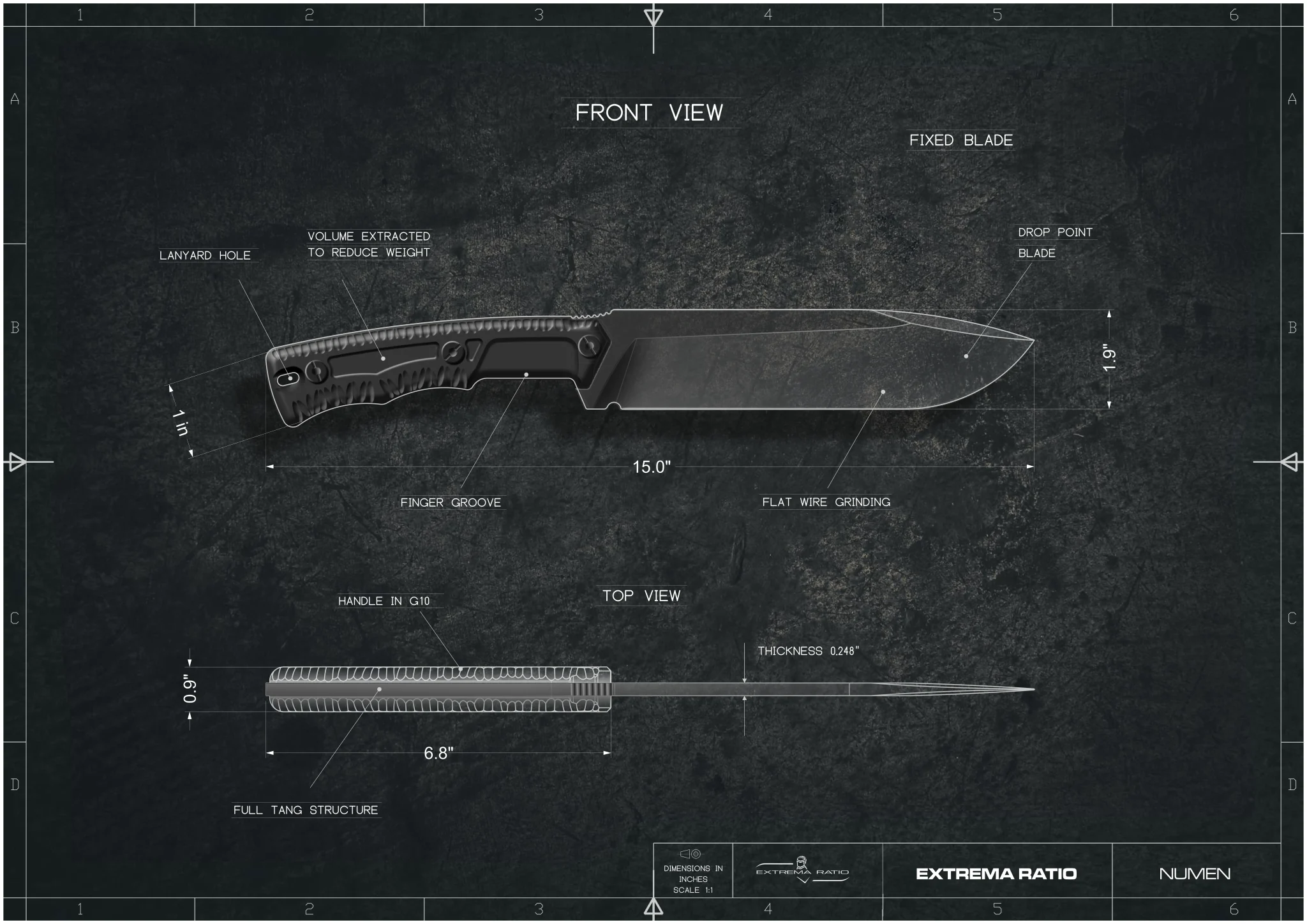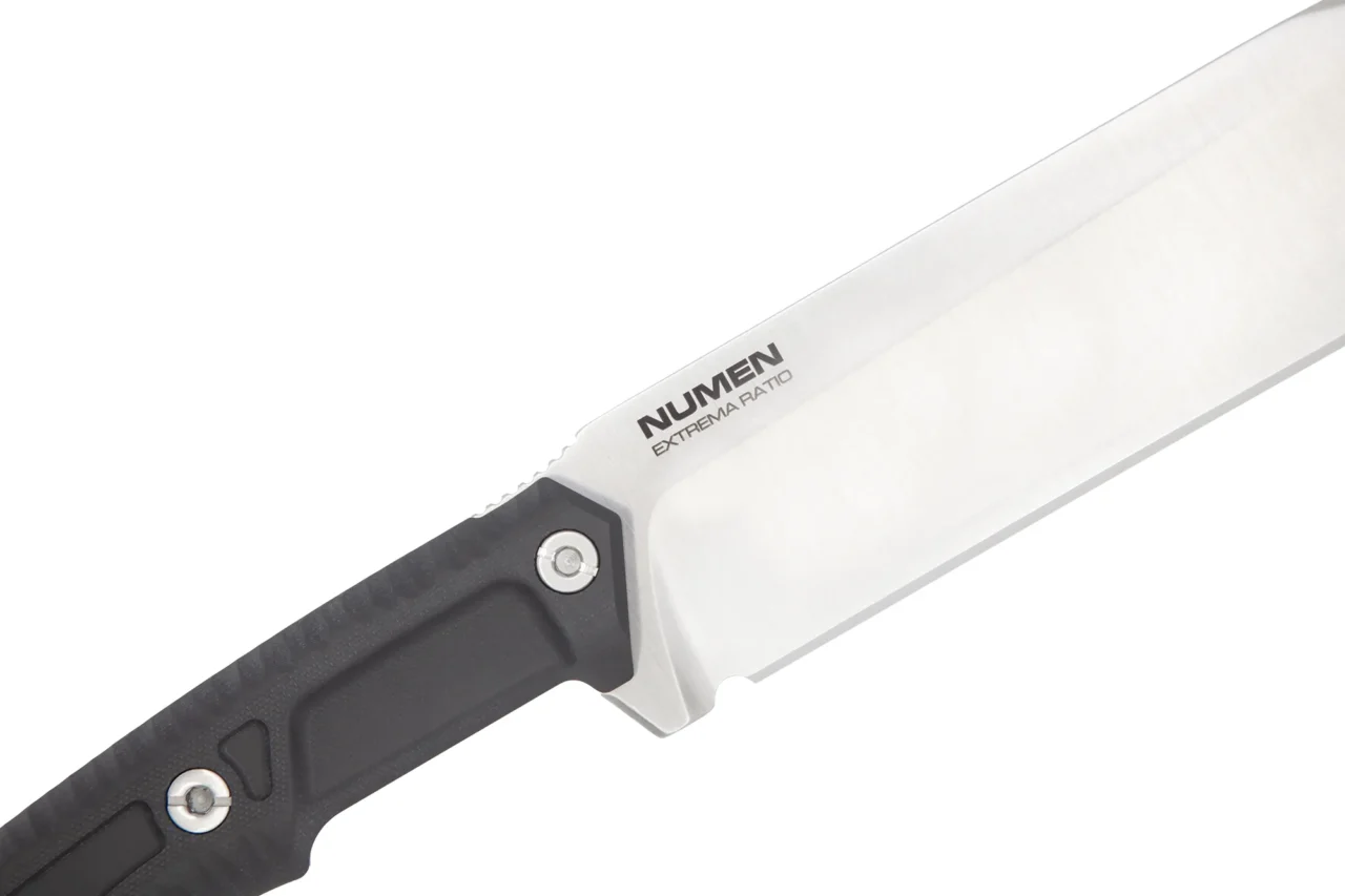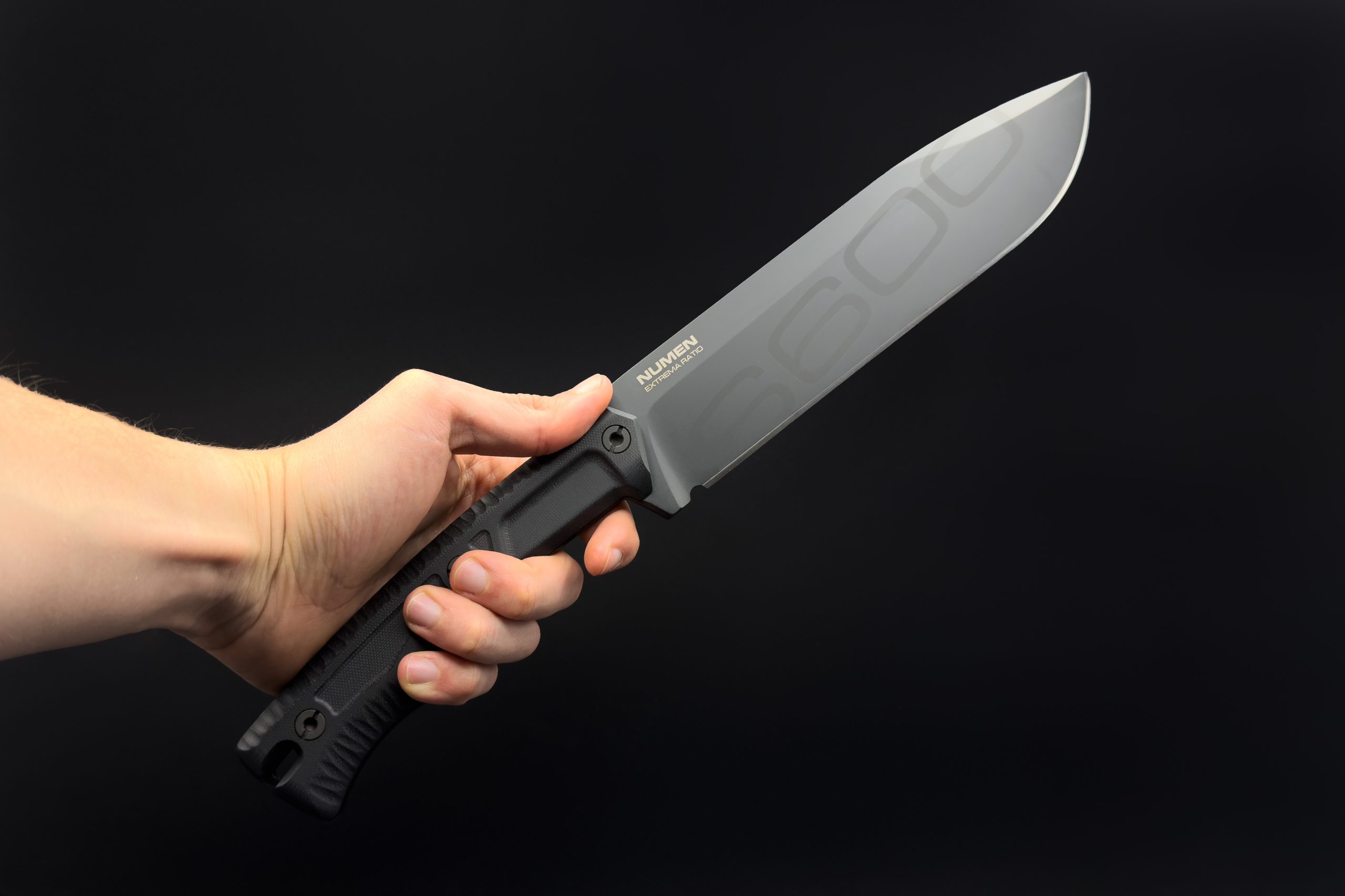 - Numen S600 Black – Ideal for wear resistance and superior performance. This version offers unparalleled toughness. It is manufactured with Böhler S600 steel, an industrial material used in the production of metalworking tools, cryogenically treated to an incredible hardness of 64 HRC. The coating applied is the new EXP DARK with a Teflon base, as introduced by Extrema Ratio.