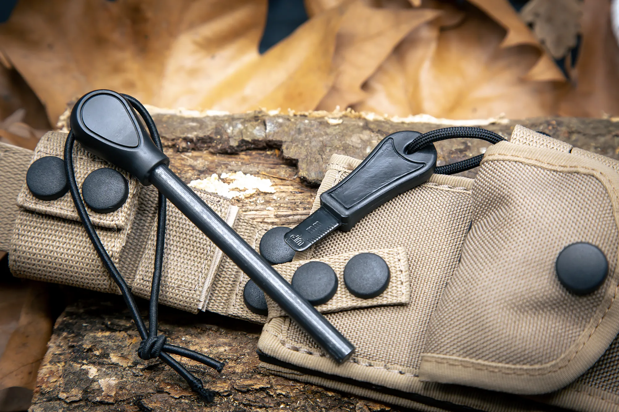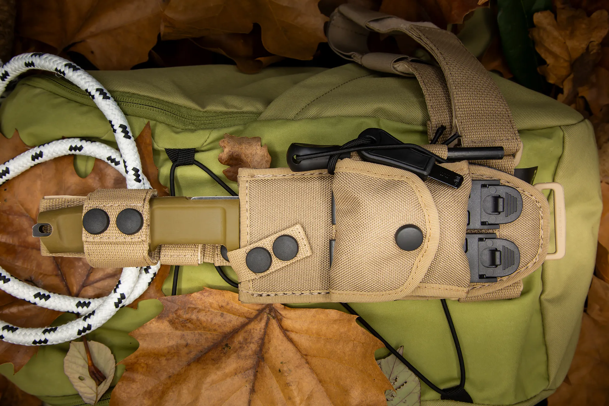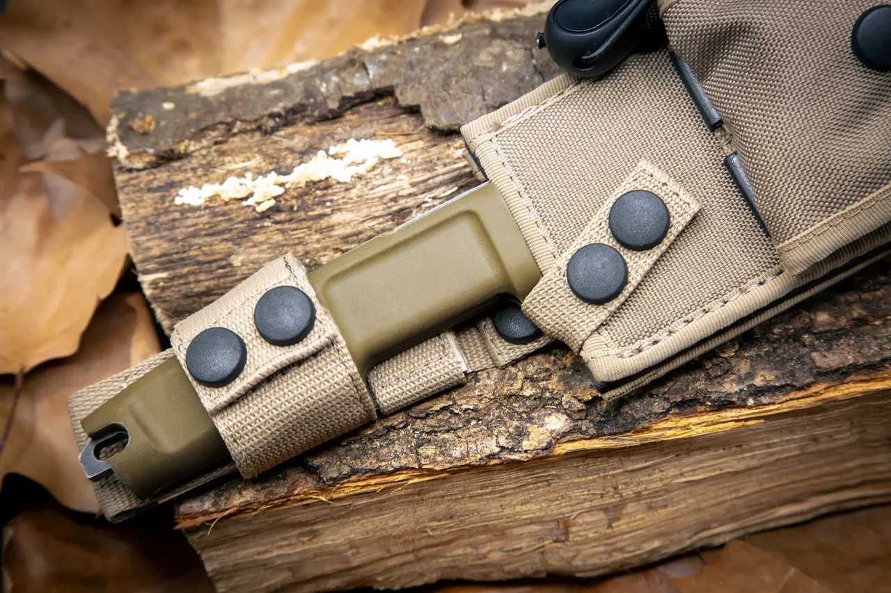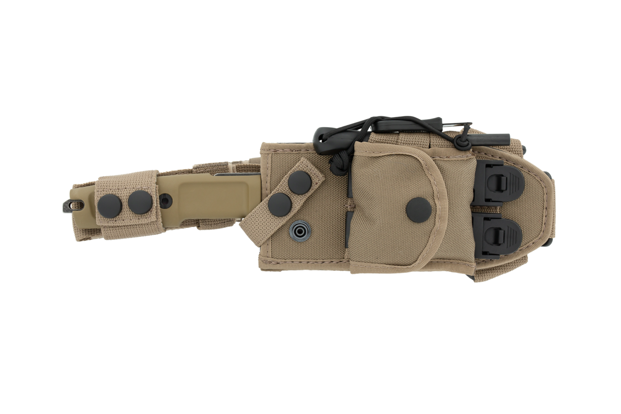 - Comes with a desert Cordura sheath with M.O.L.L.E. system webbings, a mini pouch containing a paracord with flammable filament, which can be used in case of emergency and/or difficult climatic conditions, and a flint for lighting fires.