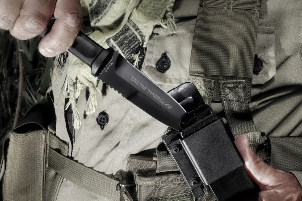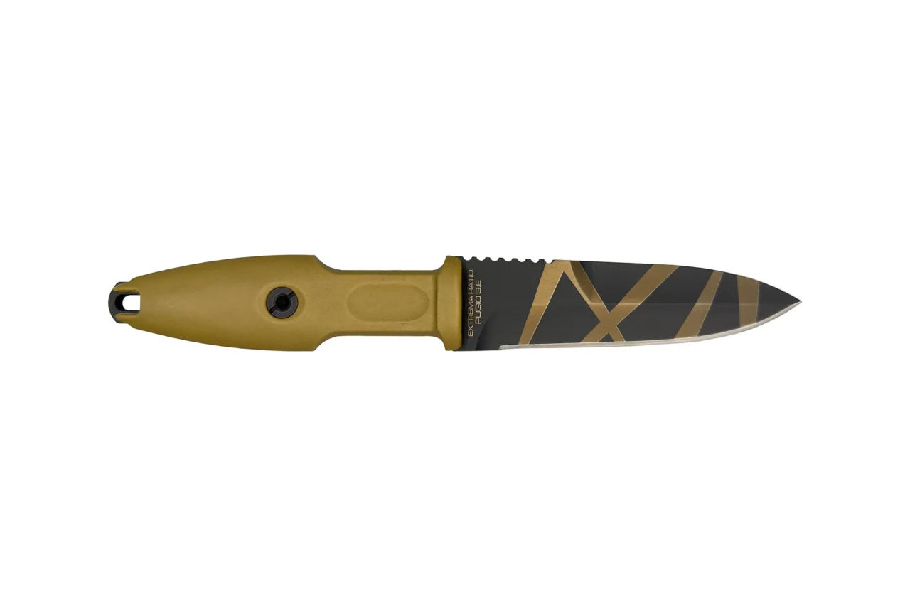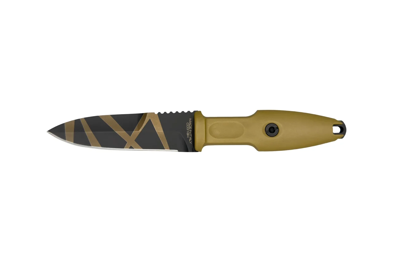 Unlike the other DOBERMANN IVs, the DOBERMANN IV S600 is made of Böhler S600 steel. This material is used for manufacturing metalwork and stamp-creation tools. The high content of molybdenum, tungsten and a good presence of vanadium in its chemical composition provide excellent qualities of hardness, wear resistance and toughness. The presence of cobalt stimulates the growth of small uniformly distributed carbides, which enhance mechanical qualities such as bending capacity. The blade of DOBERMANN IV S600 is hardened and cryogenically treated, thus reaching an exceptional hardness of 64 HRC; this makes it very resistant to wear and gives the edge a lasting sharpening. Böhler S600 has 4.5% of chrome, which makes it oxidizable. For this reason, Extrema Ratio has chosen the new EXP DARK Teflon-based finish.