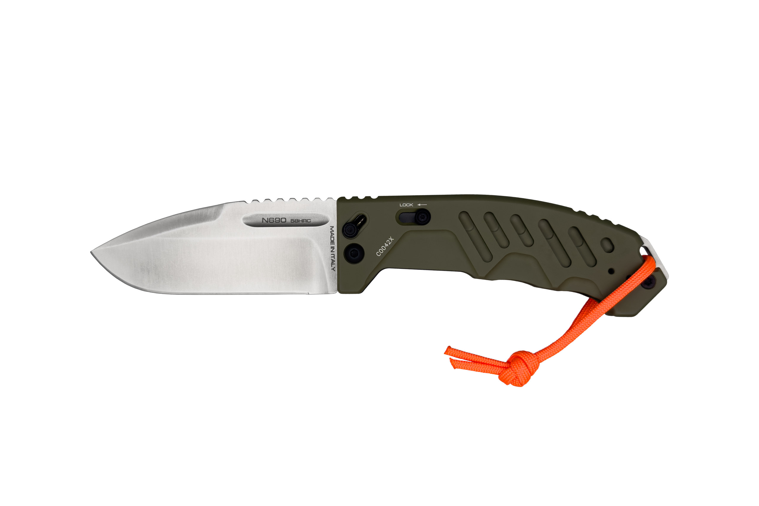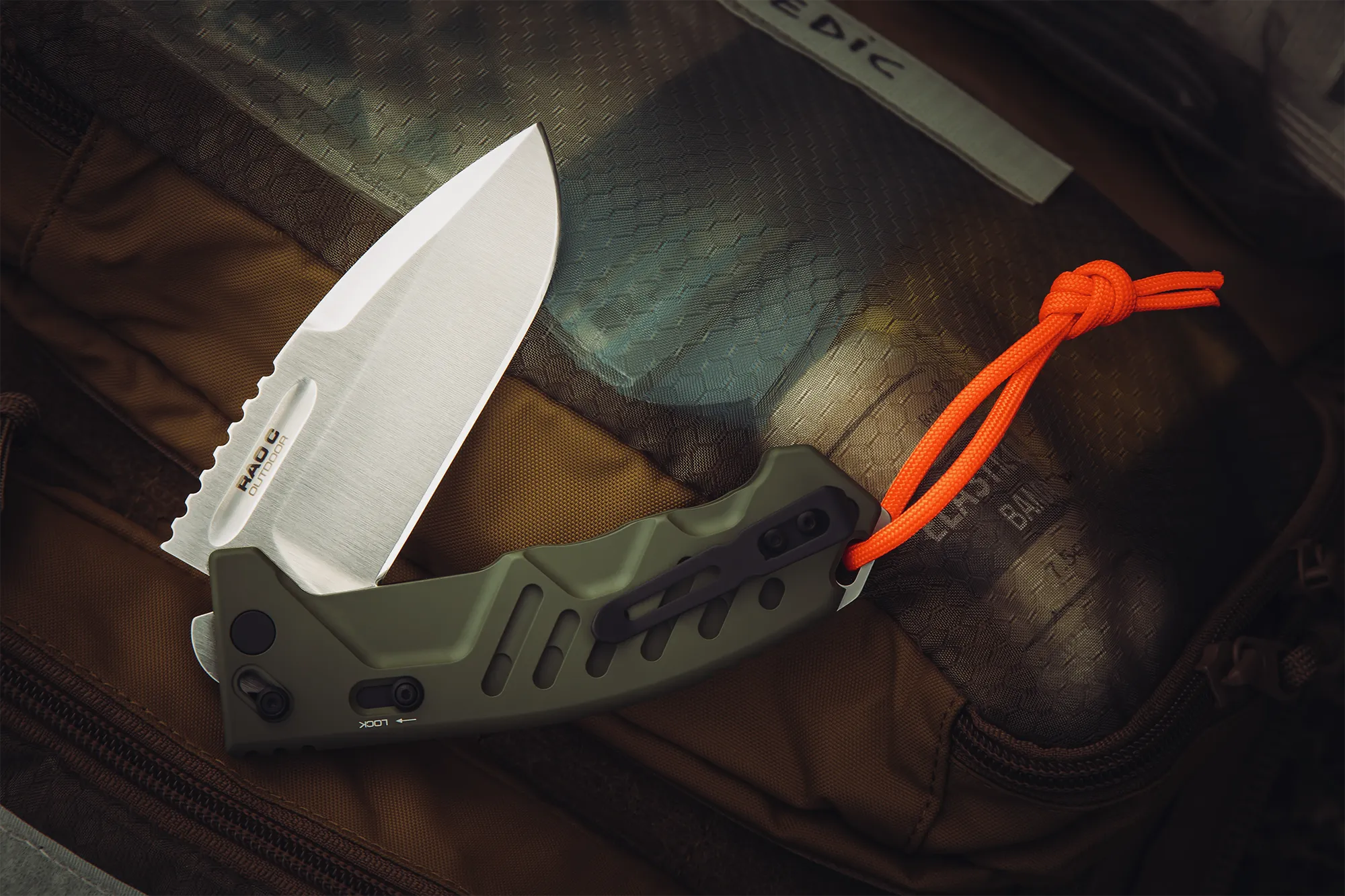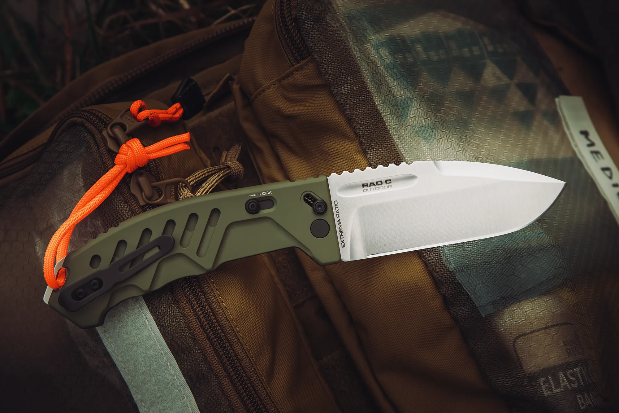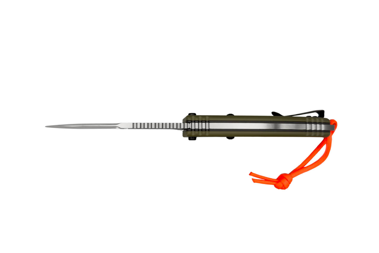 The green handle scales of the Outdoor configuration improve visual integration in natural environments. The high‑visibility orange paracord lanyard adds a practical safety function: quick recovery of the tool when dropped in vegetation or terrain.