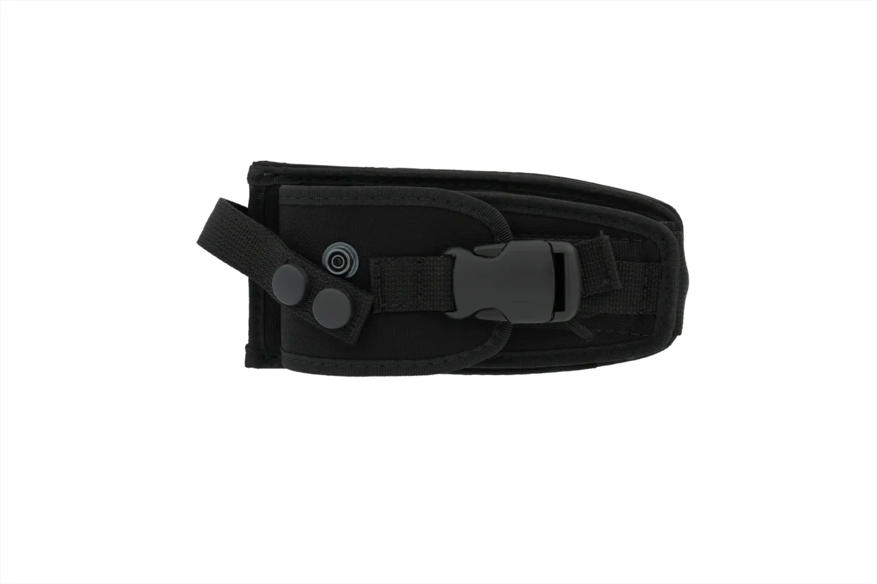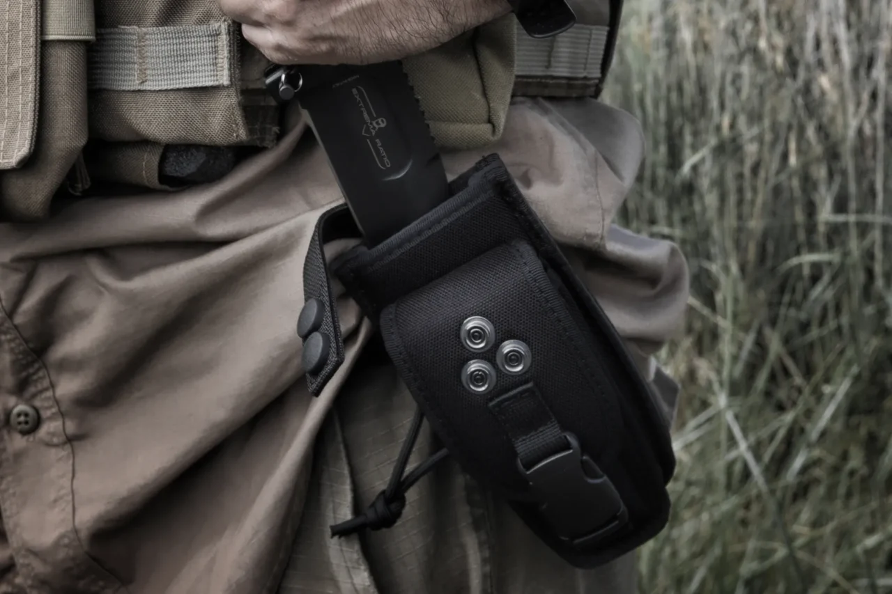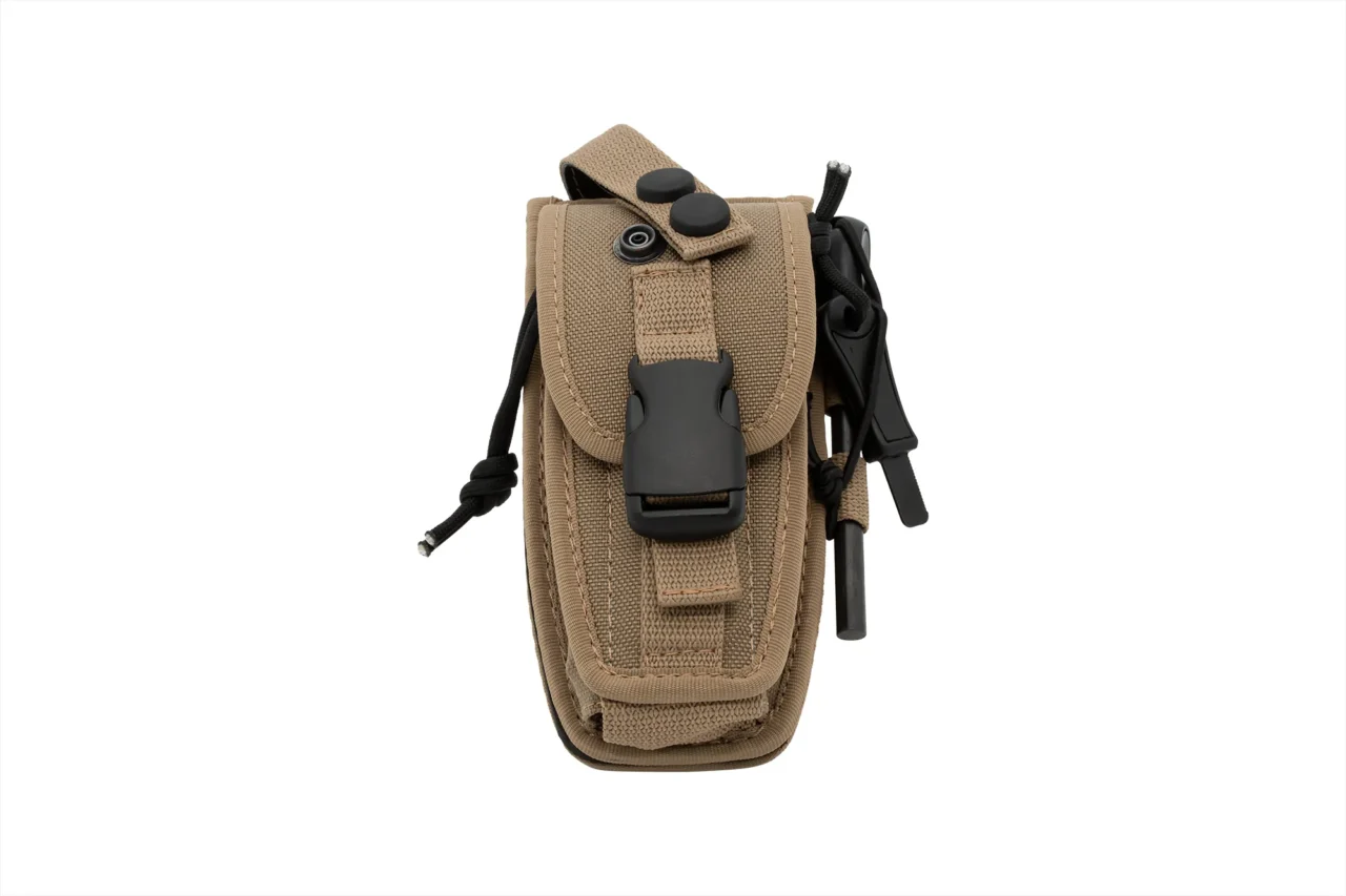 This particular sheath allows to carry the knife with the blade closed by placing it in the specific front pocket, or with the blade open by inserting it in the dedicated compartment which has a safety system consisting of a strap with double clips. In addition to the firesteel there is also a diamond sharpener. The MOLLE fixing system of the sheath allows it to be carried on tactical vests and generic belts.