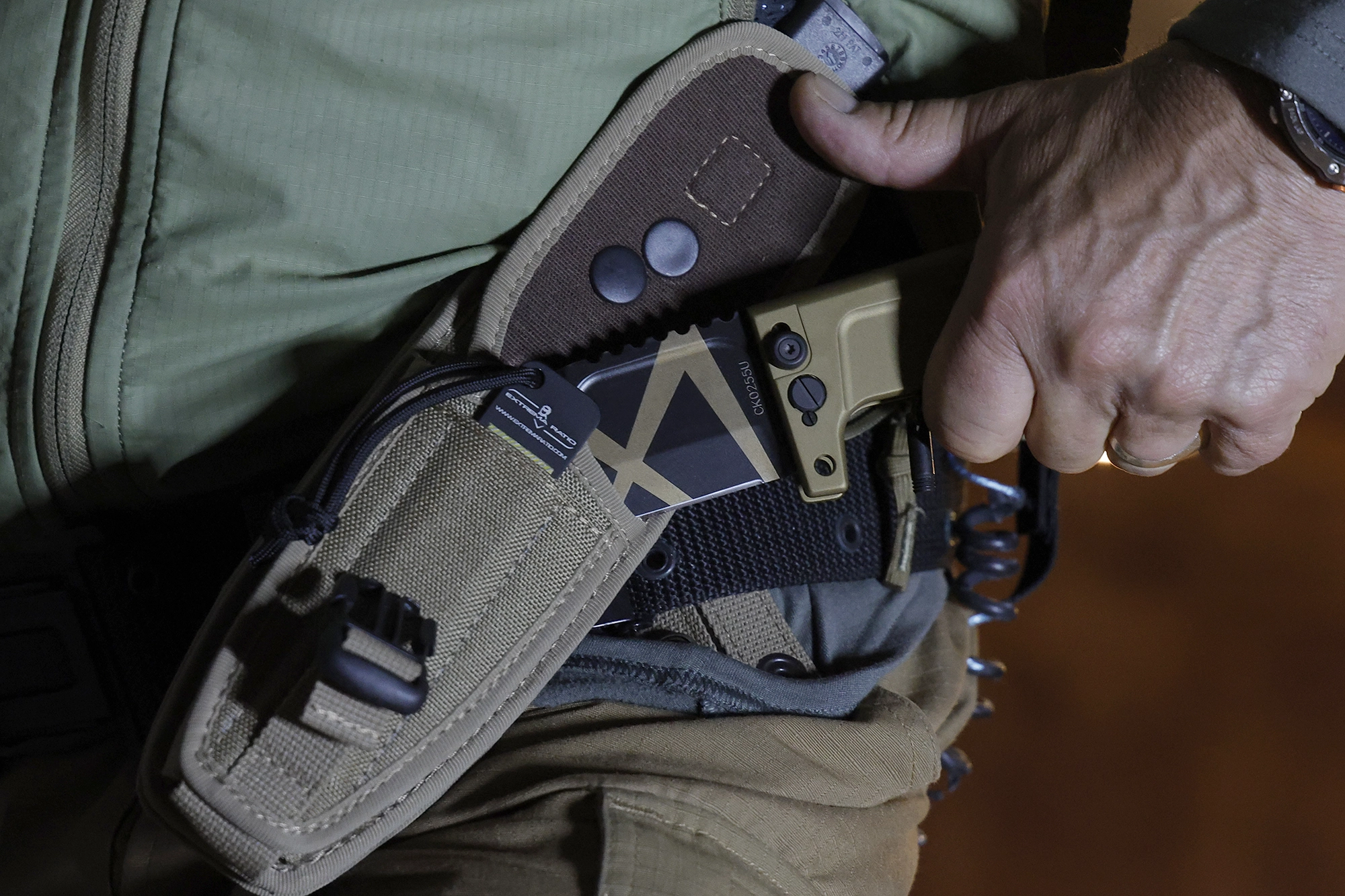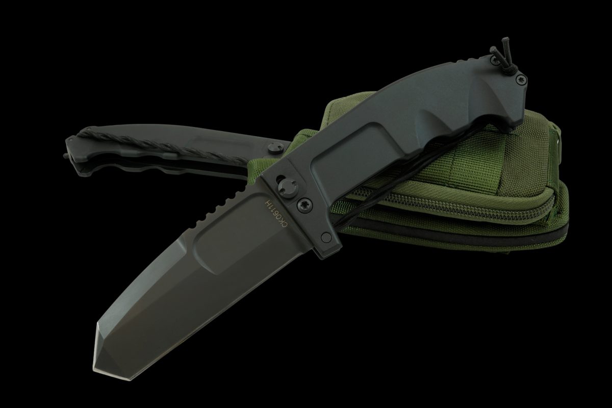 The sheath is an essential part of this weapon system: it holds a diamond-plate sharpener and enables user to carry the knife either in open position, held in place by a cord and two clips, or closed, inside the front pocket. The sheath can be attached to tactical vests or common belts, being MOLLE system-compliant.
