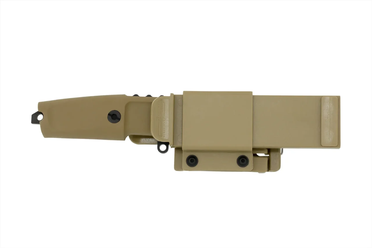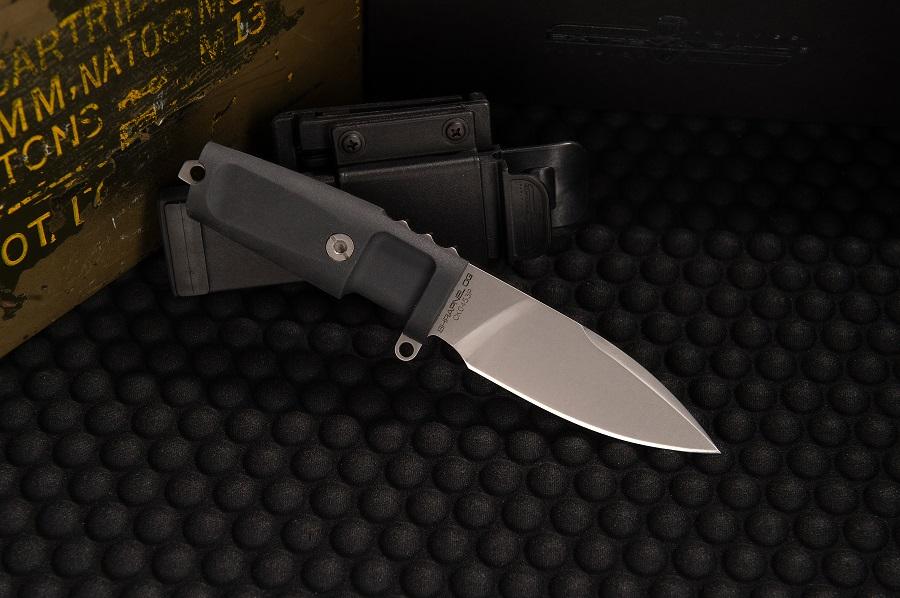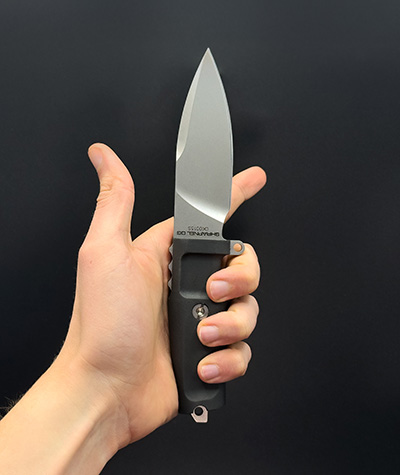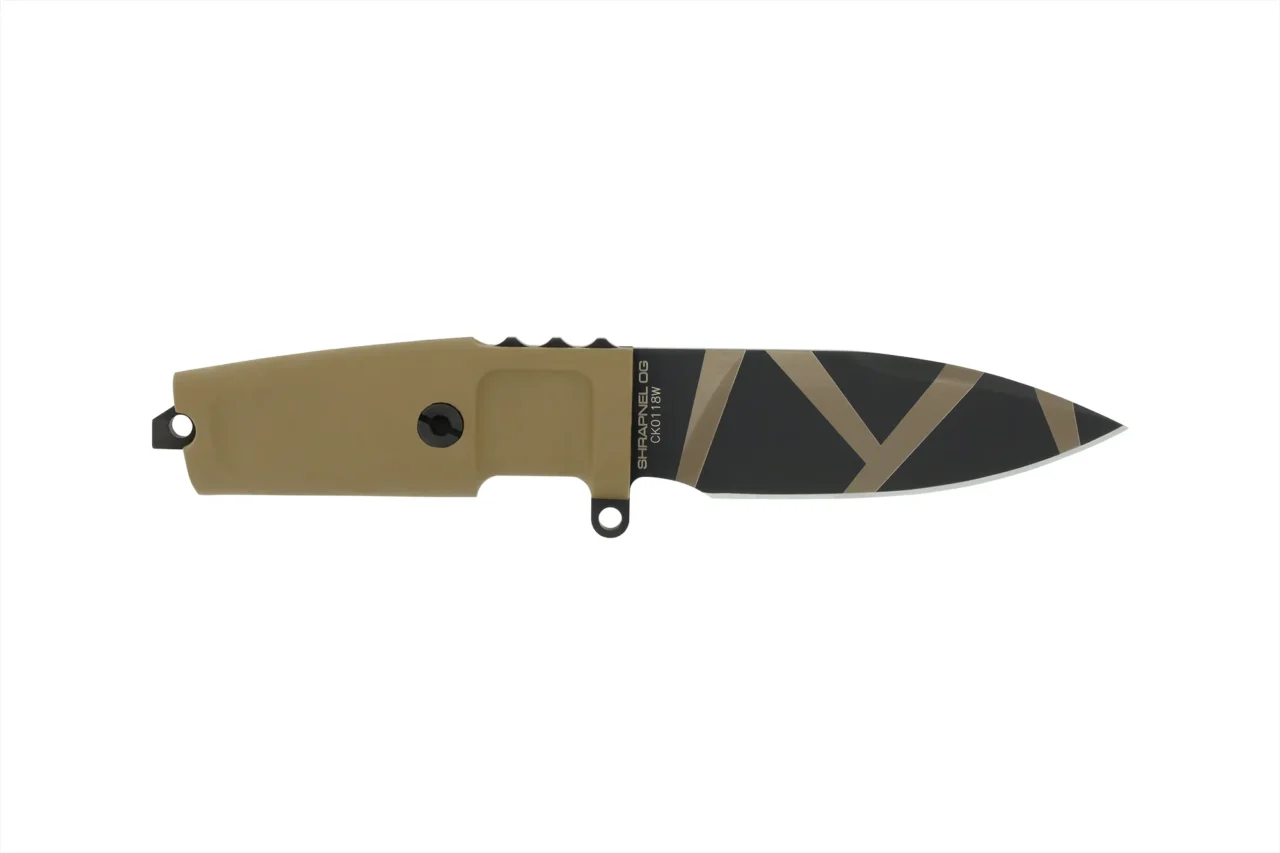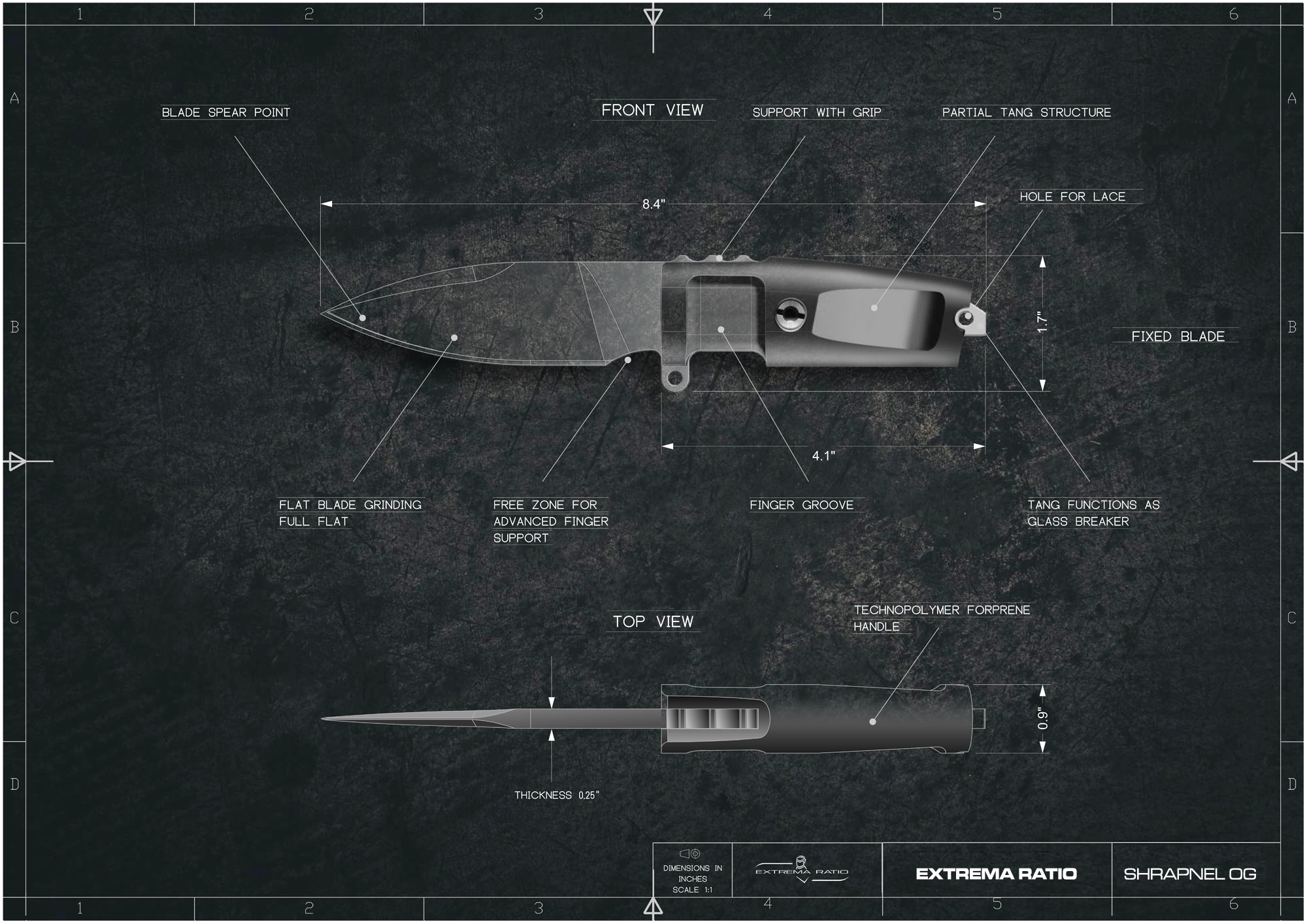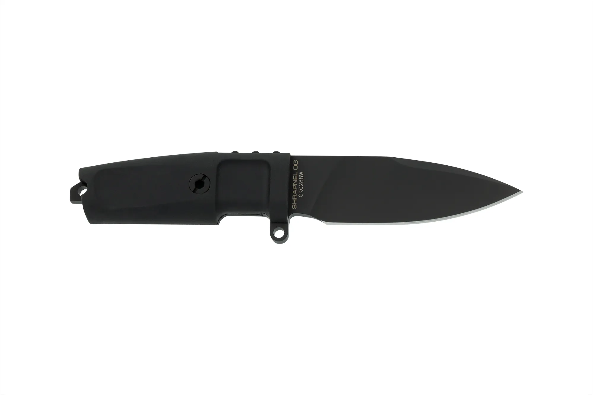 The included hard sheath can be worn vertically, horizontally or obliquely (at a 45° angle). Unlike the older model it supersedes, the SHRAPNEL OG hilt design does not include a guard. The original version of the SHRAPNEL OG comes with a 3.9in compact handle, the Full Handle version comes with a more comfortable 5in handle.