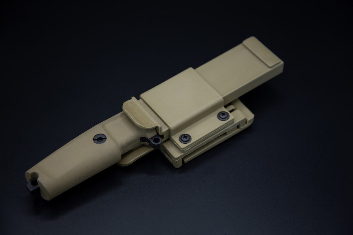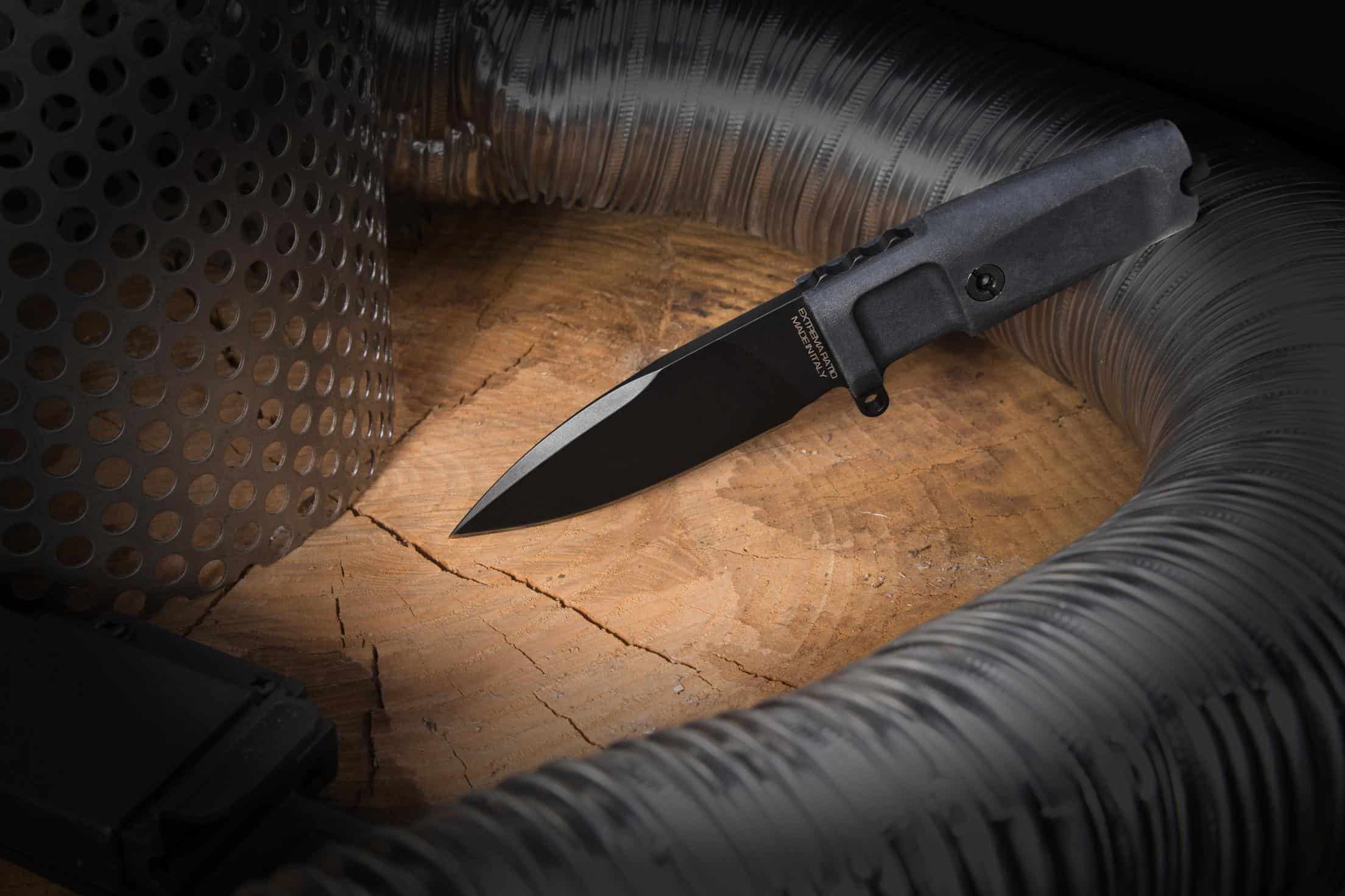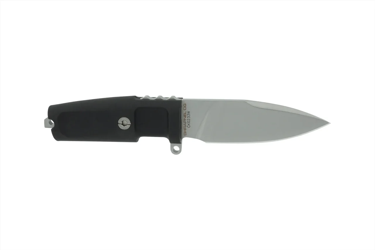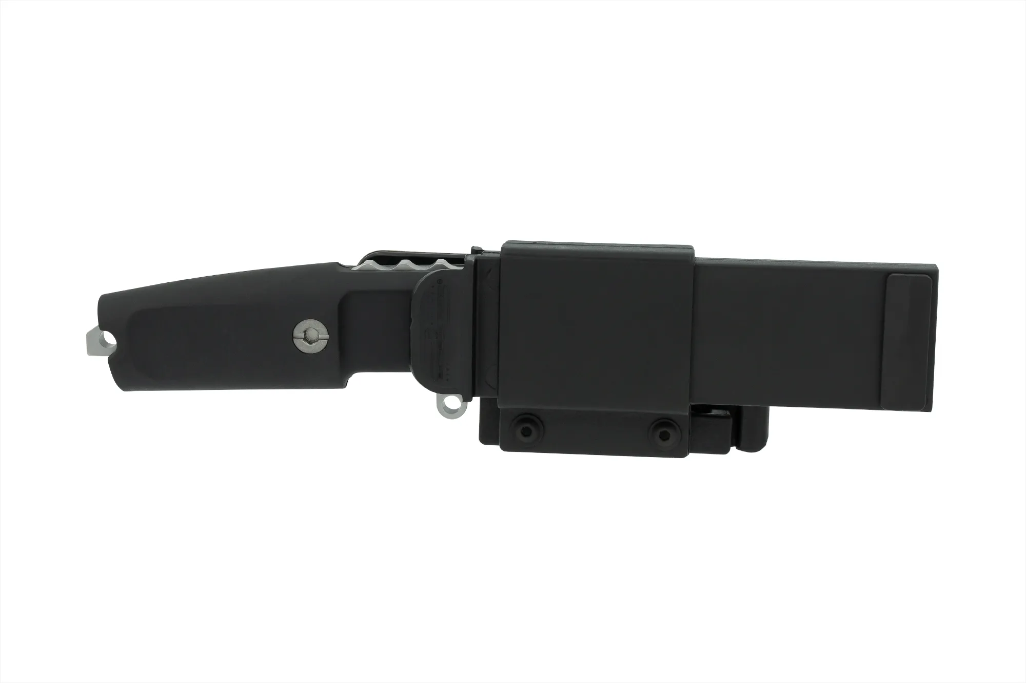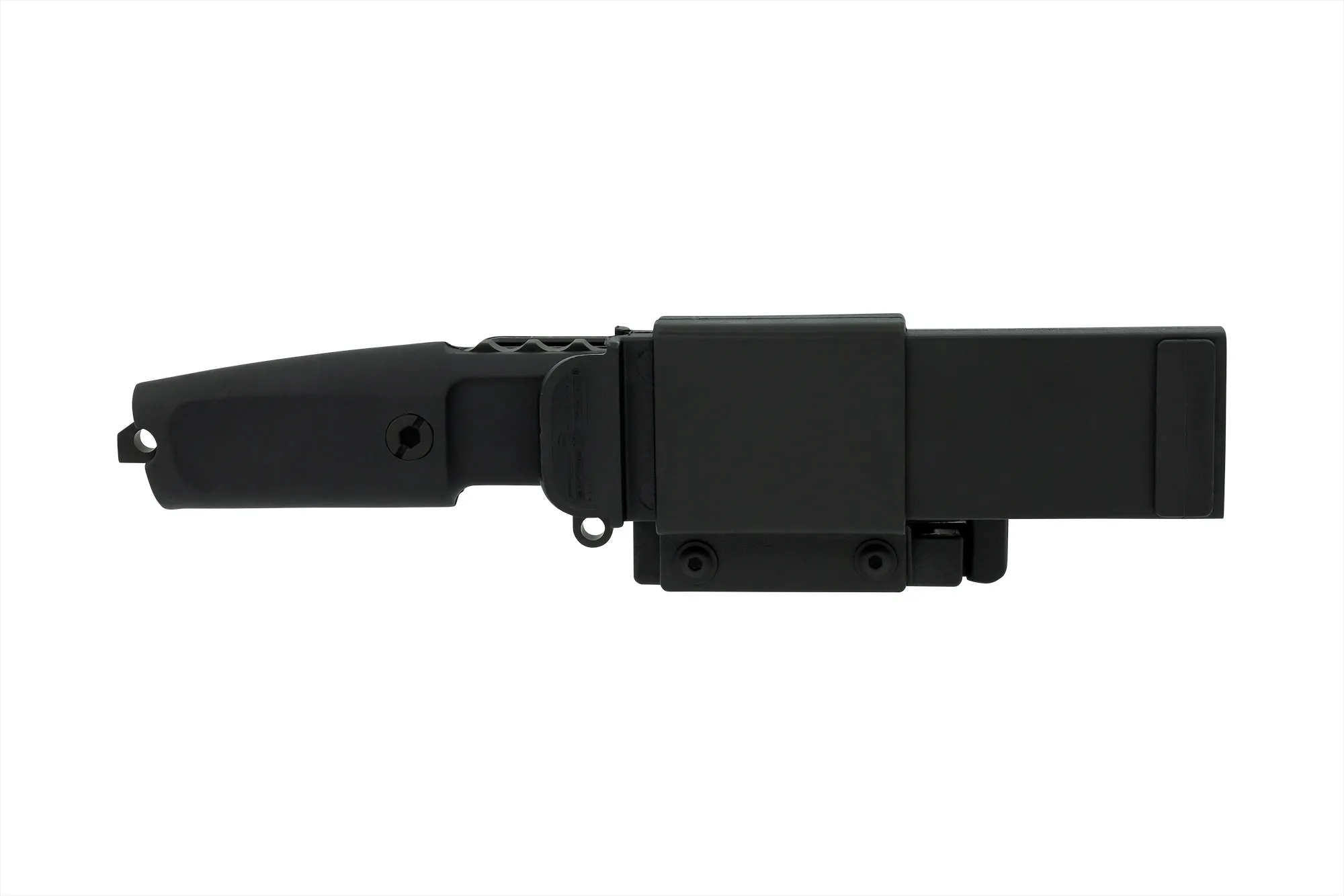 The included hard sheath can be worn vertically, horizontally or obliquely (at a 45° angle). Unlike the older model it supersedes, the SHRAPNEL OG hilt design does not include a guard. The original version of the SHRAPNEL OG comes with a 3.9in compact handle, the Full Handle version comes with a more comfortable 5in handle.