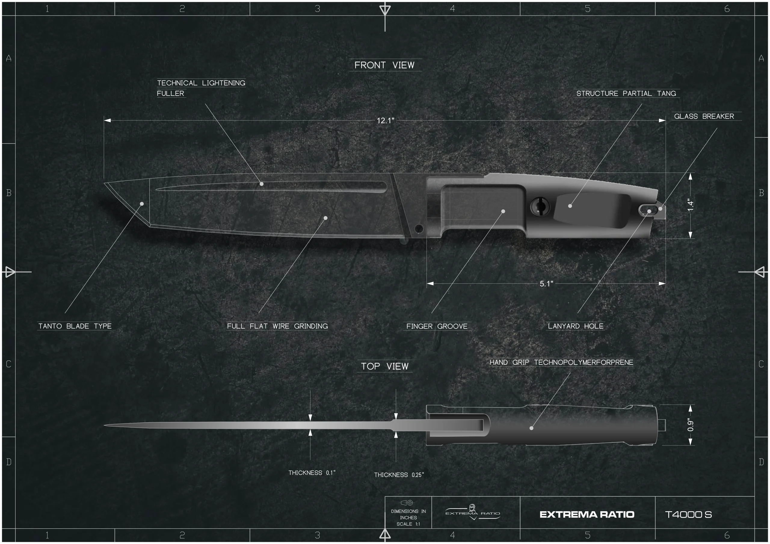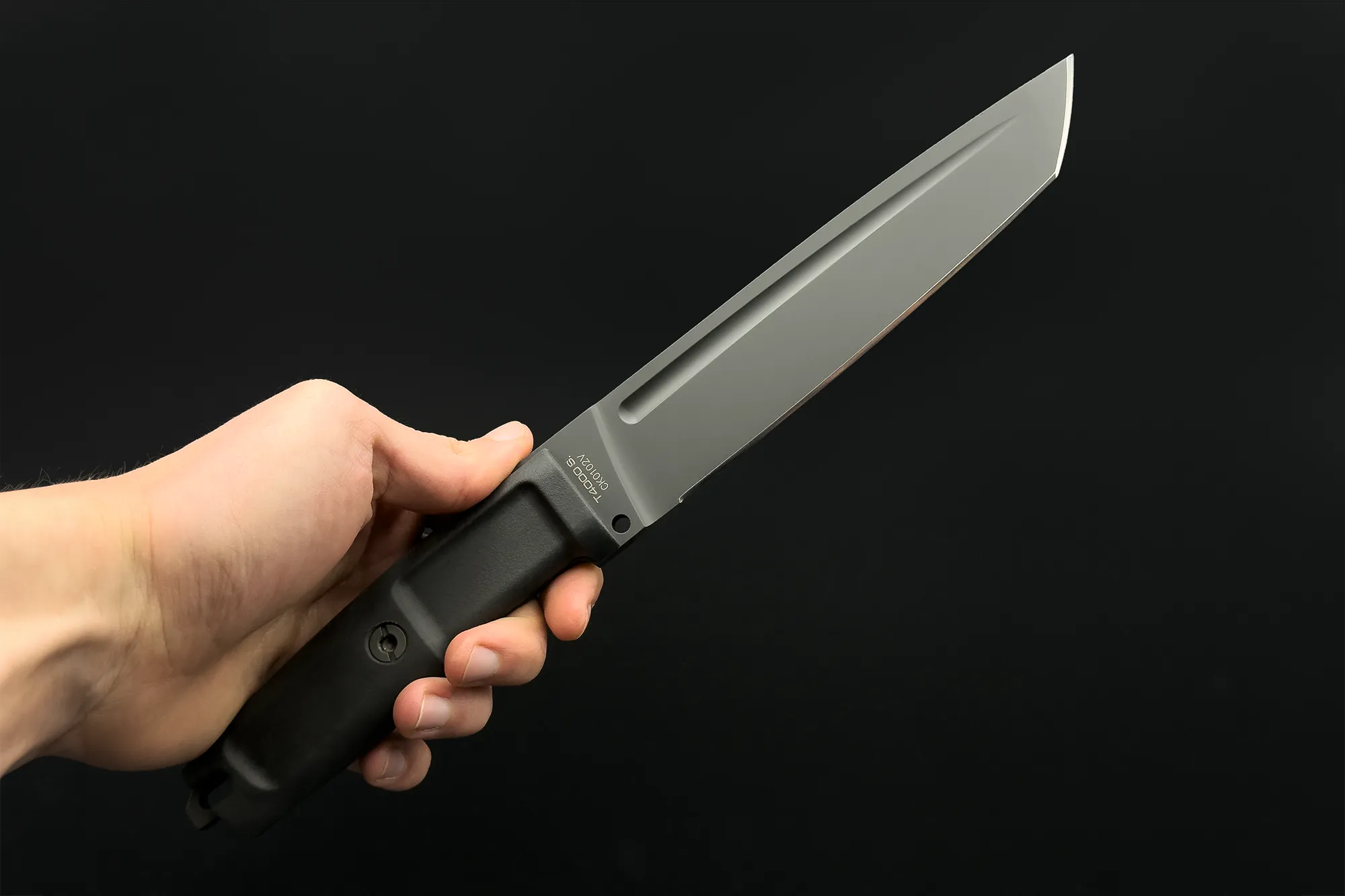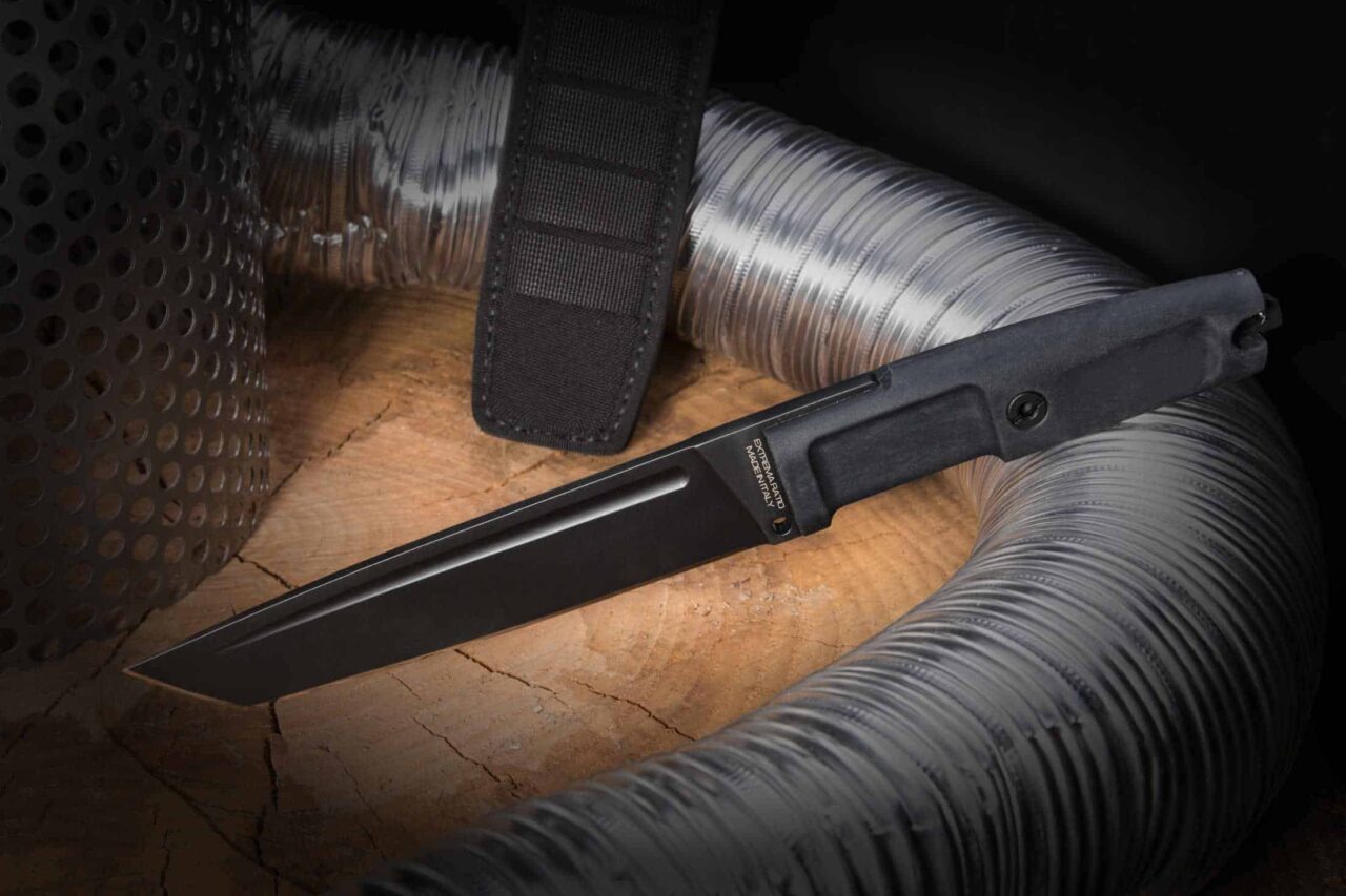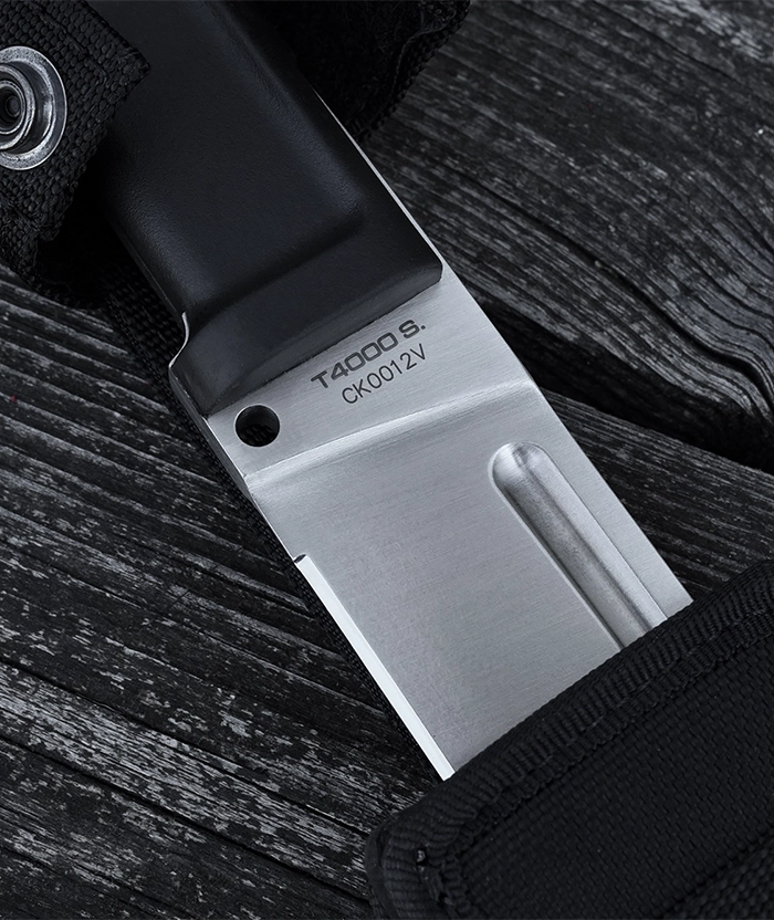 Unlike the other DOBERMANN IVs, the DOBERMANN IV S600 is made of Böhler S600 steel. This material is used for manufacturing metalwork and stamp-creation tools. The high content of molybdenum, tungsten and a good presence of vanadium in its chemical composition provide excellent qualities of hardness, wear resistance and toughness. The presence of cobalt stimulates the growth of small uniformly distributed carbides, which enhance mechanical qualities such as bending capacity. The blade of DOBERMANN IV S600 is hardened and cryogenically treated, thus reaching an exceptional hardness of 64 HRC; this makes it very resistant to wear and gives the edge a lasting sharpening. Böhler S600 has 4.5% of chrome, which makes it oxidizable. For this reason, Extrema Ratio has chosen the new EXP DARK Teflon-based finish.