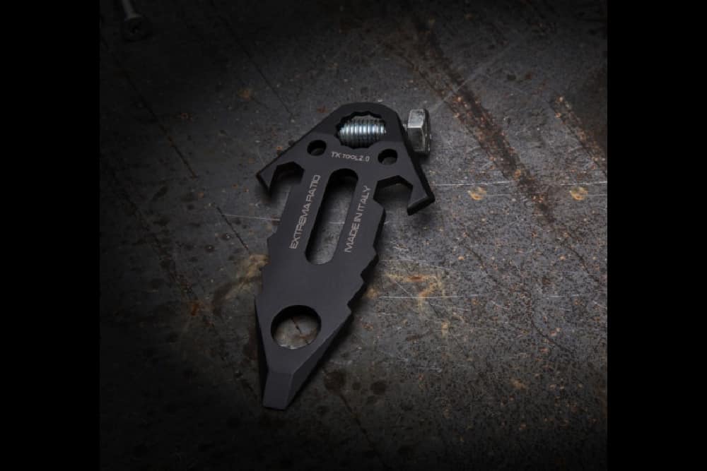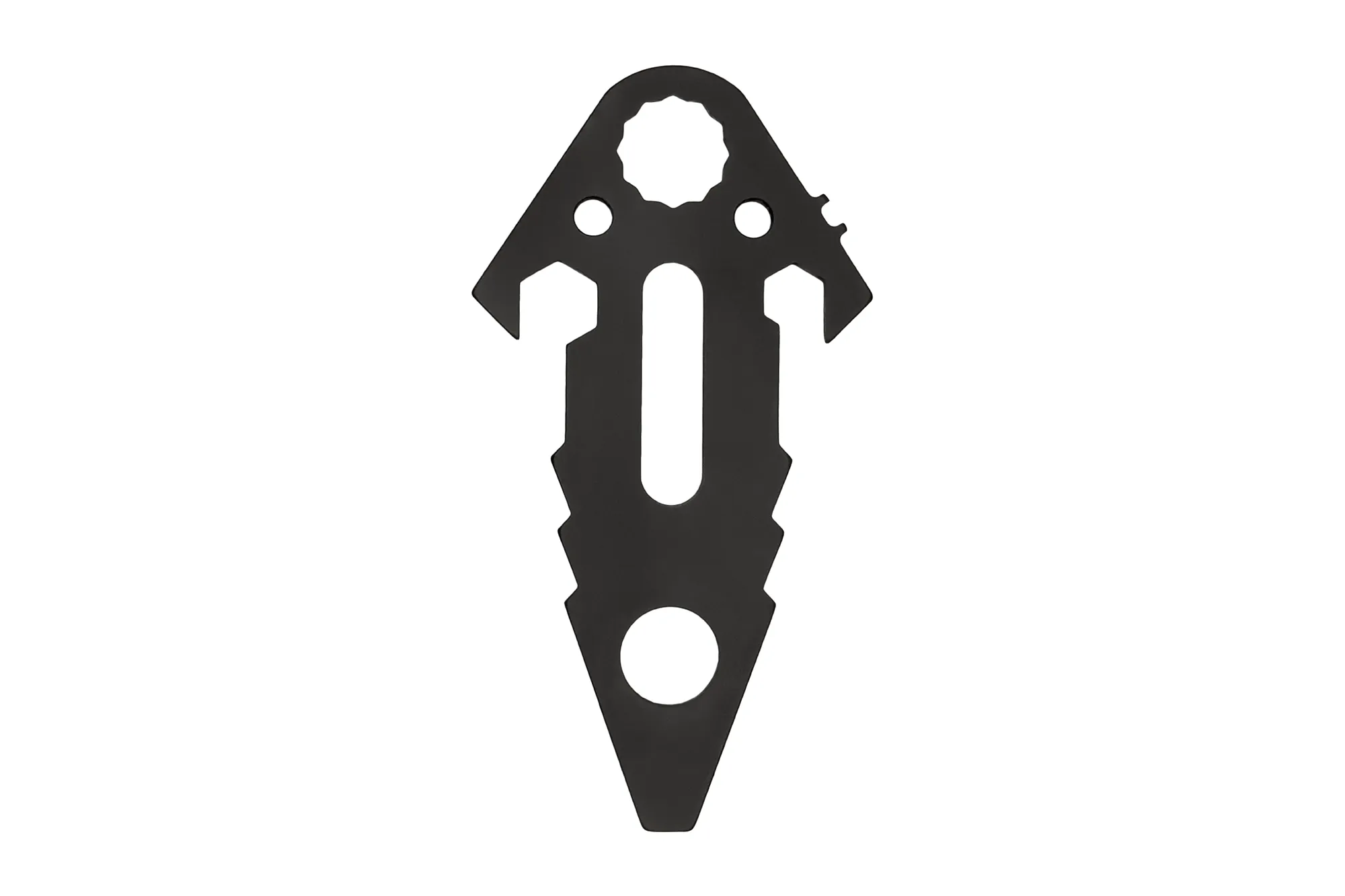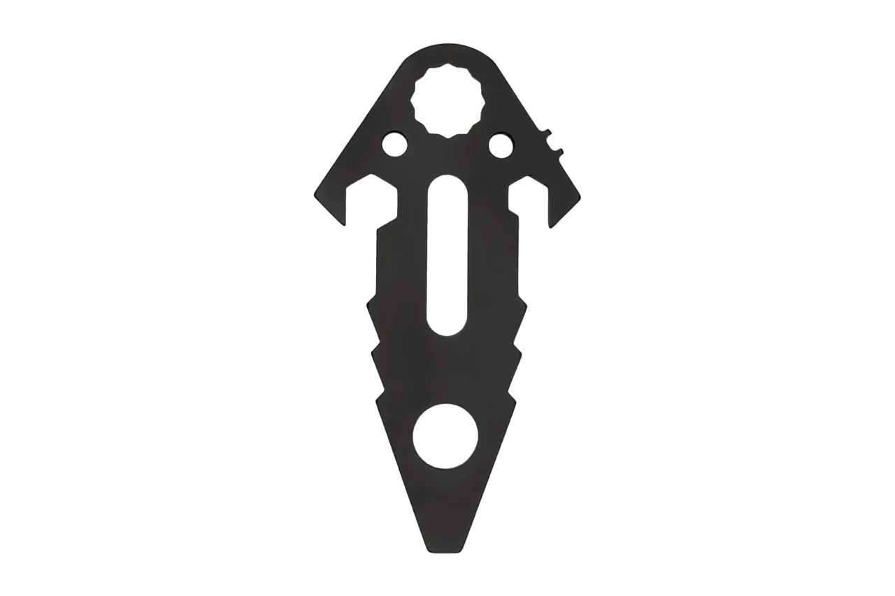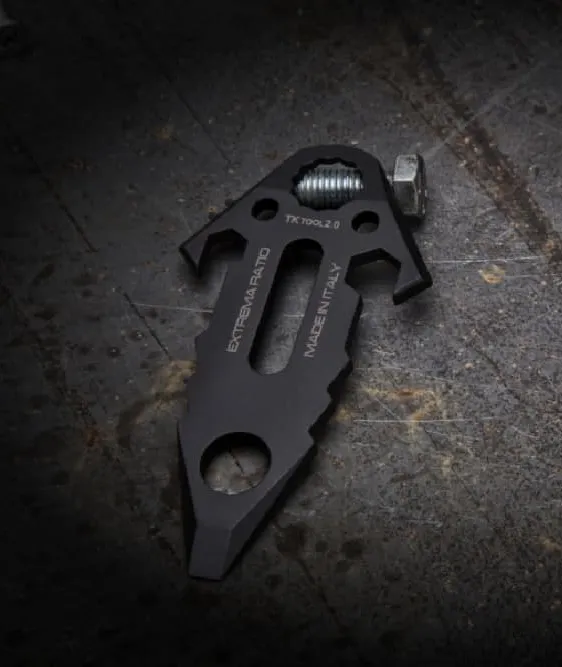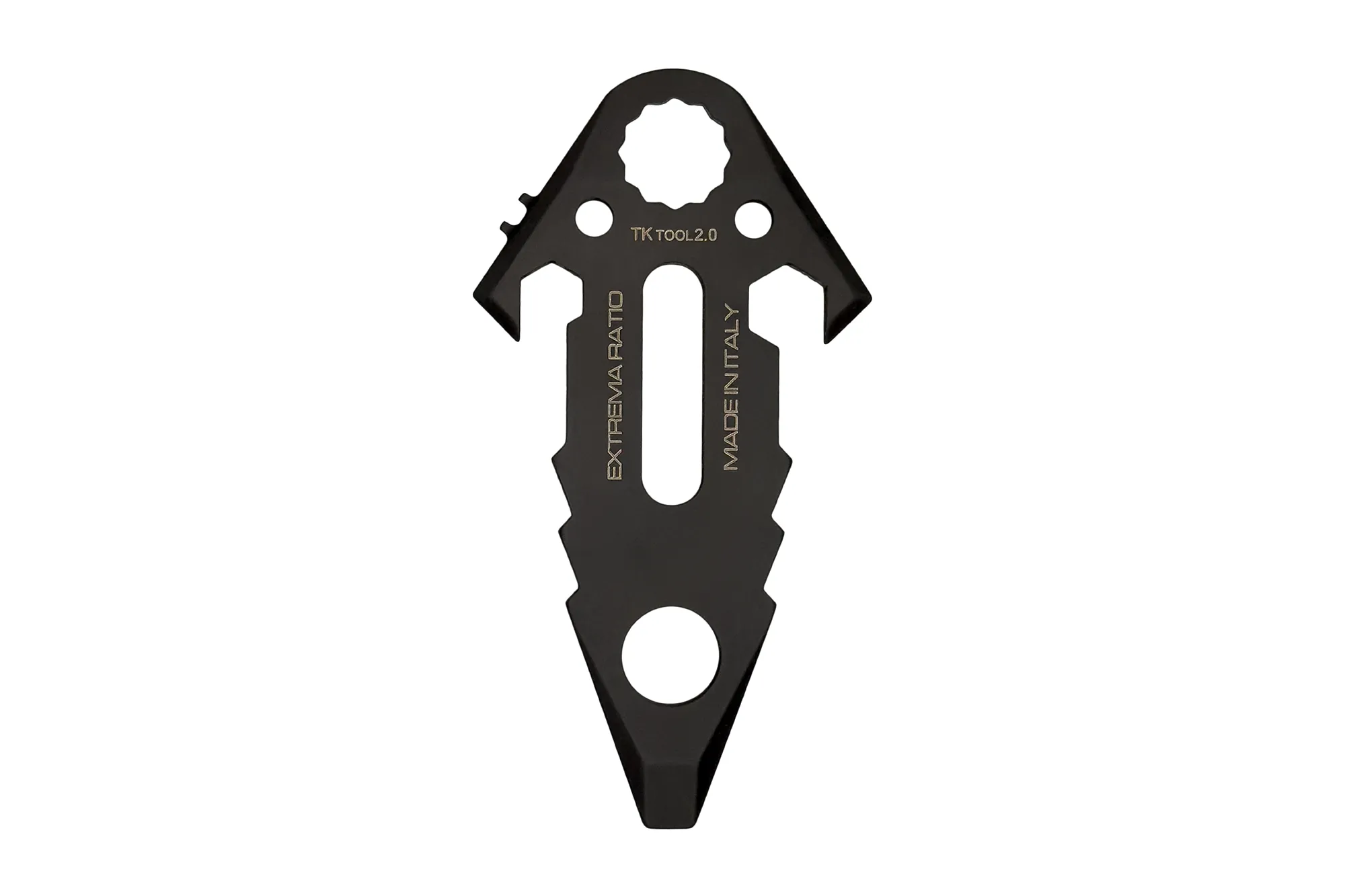 The front of a TK TOOL 2.0 can be used as a screwdriver suitable for 8/10 mm screws, or as a prying lever. The central slot in the blade can be used as a shackle key. This tool has also features two holes for a cord or paracord used in assembling a field or camping tent. Overall, a much sought-after tool for a number of outdoor activities. MOLLE system compliant.