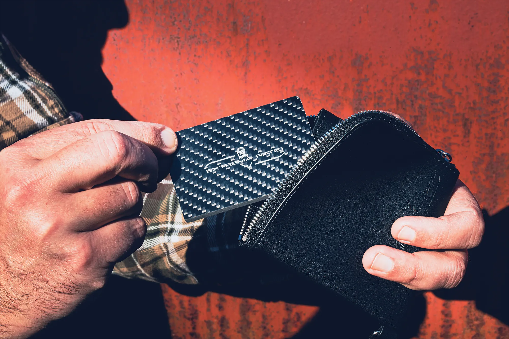 Made of carbon fiber. The lower edge is sharpened, making this EDC tool a potential resource in personal safety situations. It has the dimensions of a standard credit card and fits perfectly inside the Extrema Ratio wallet.