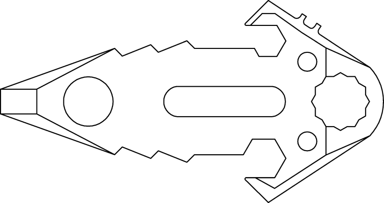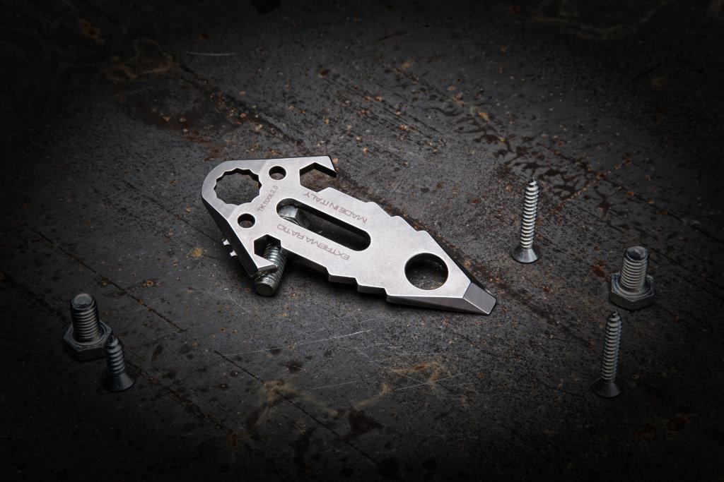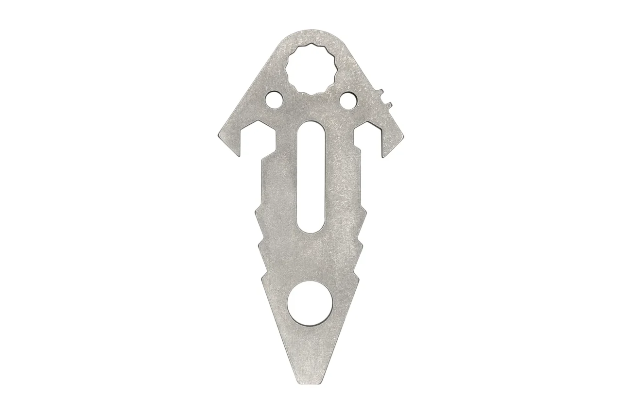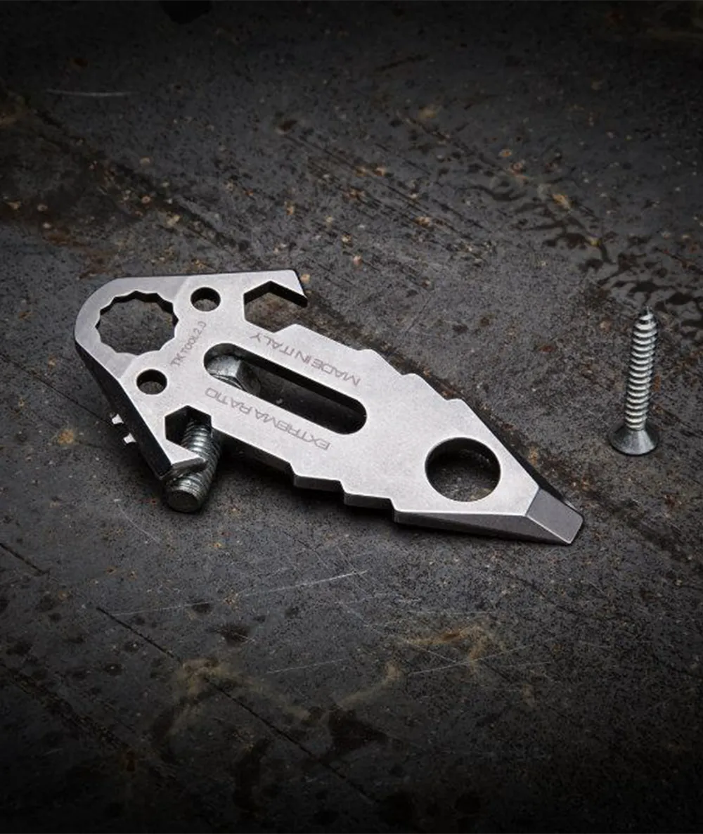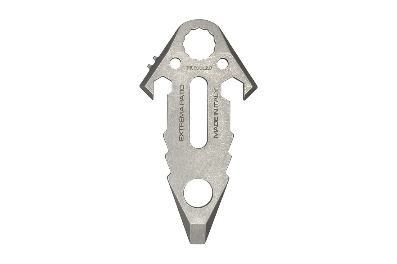 The front of a TK TOOL 2.0 can be used as a screwdriver suitable for 8/10 mm screws, or as a prying lever. The central slot in the blade can be used as a shackle key. This tool has also features two holes for a cord or paracord used in assembling a field or camping tent. Overall, a much sought-after tool for a number of outdoor activities. MOLLE system compliant.