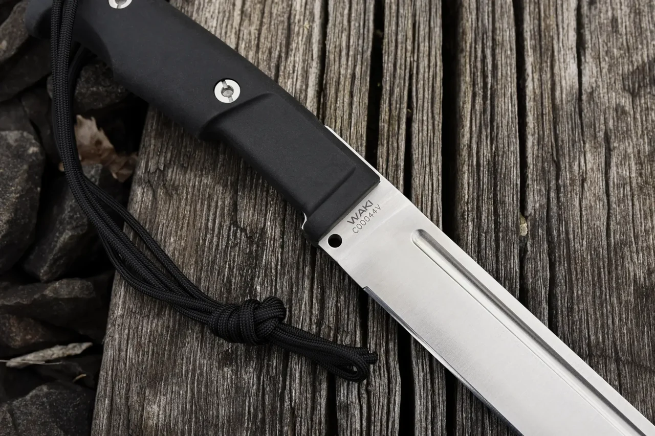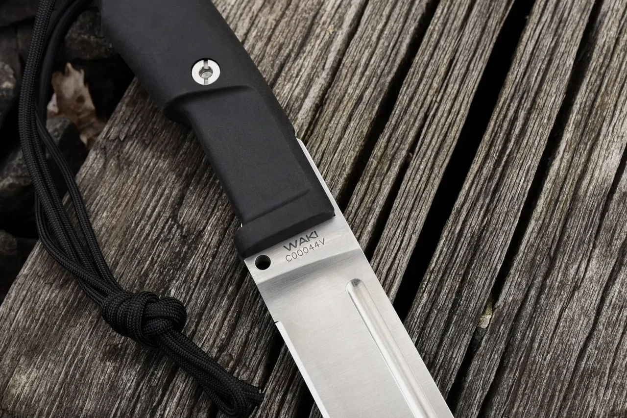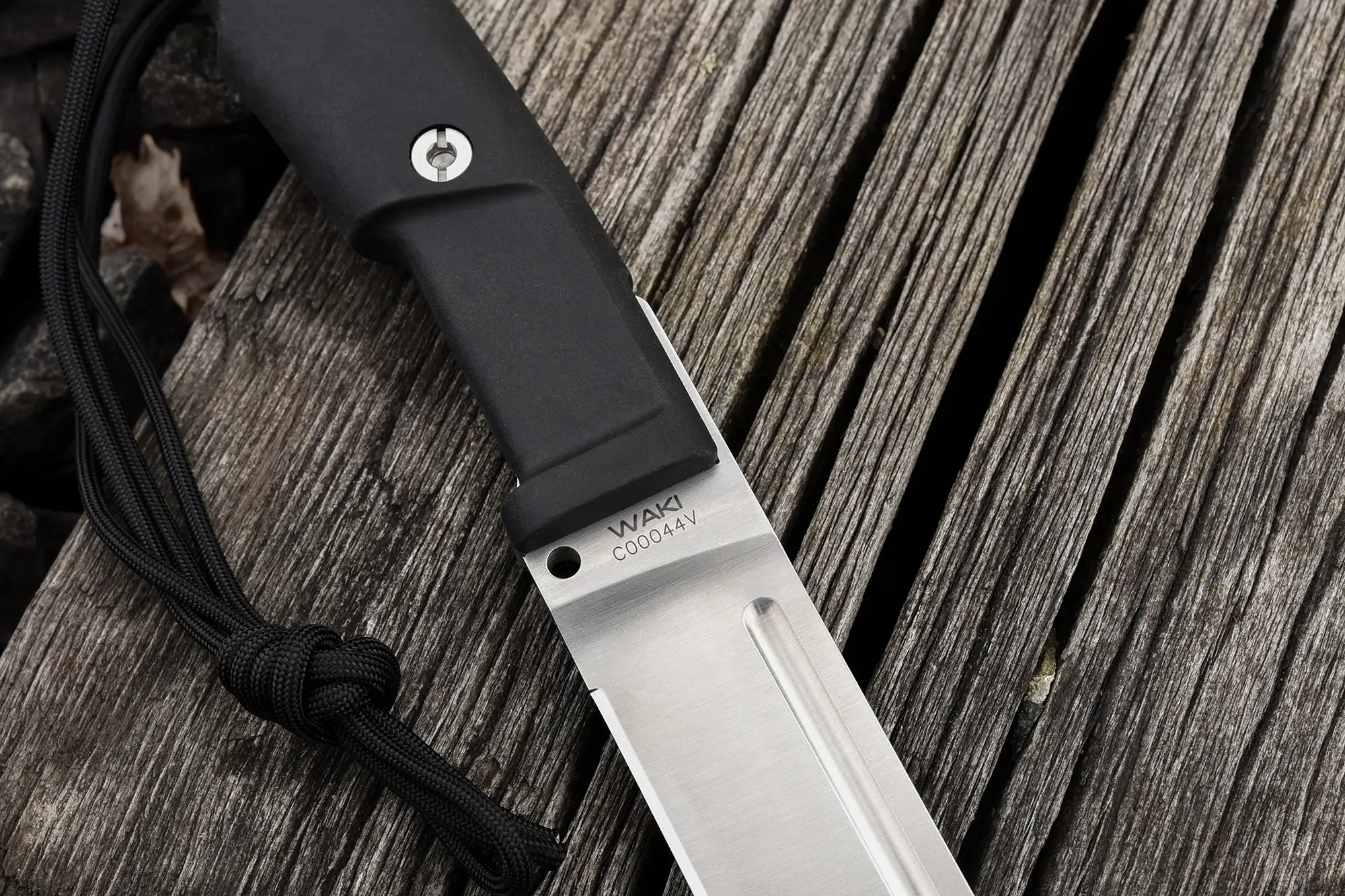 This is a reinterpretation of the Japanese Wakizashi sword, a traditional blade 30 to 60 cm long, which the Samurai used to carry by their side together with their Katana. The blade features the classic Japanese Tanto profile and is made of Böhler N690 steel with heat treatments that bring its hardness to 58 HRC for best combining edge retention and resistance.